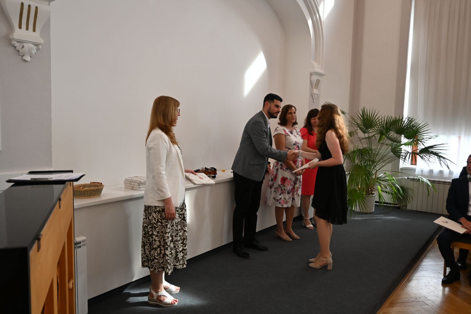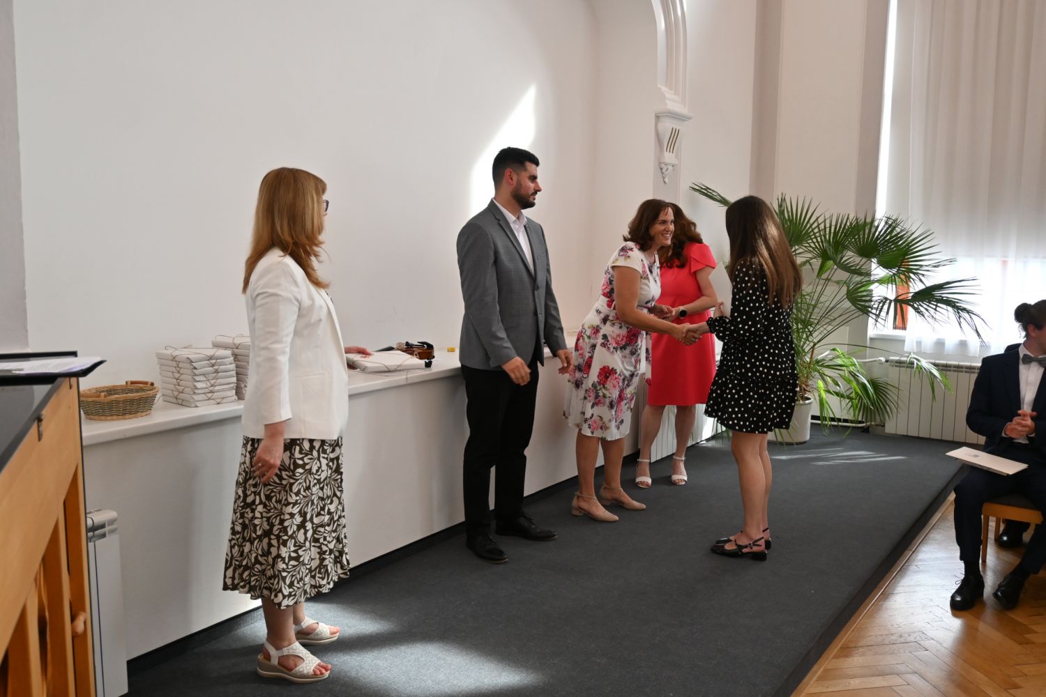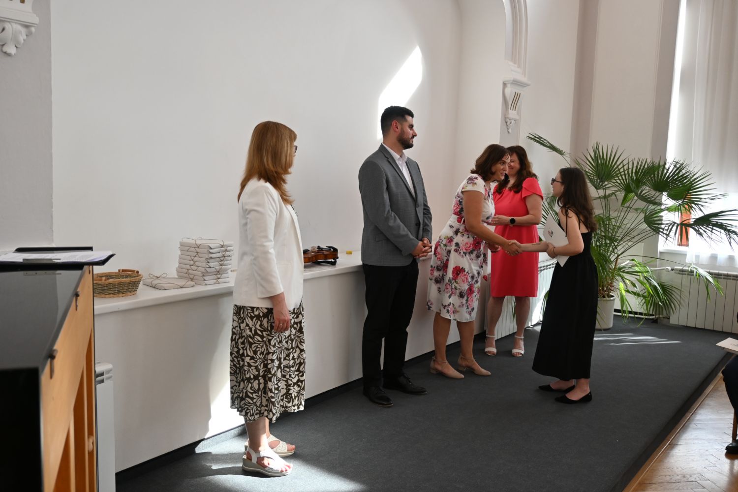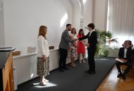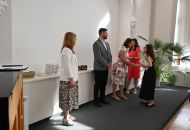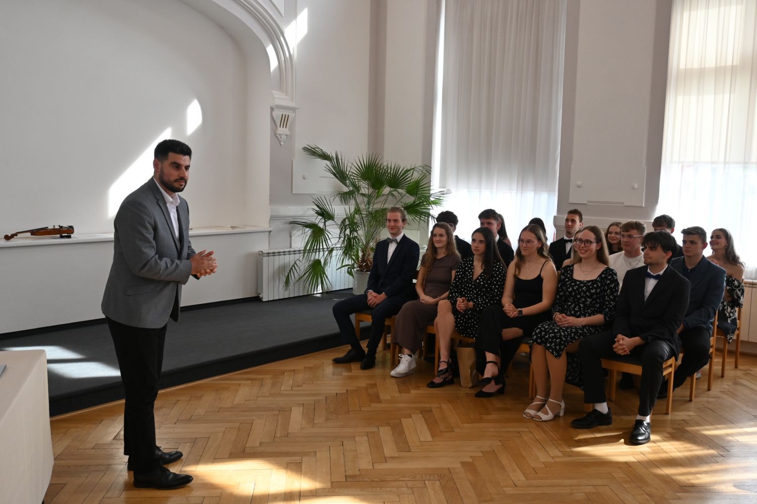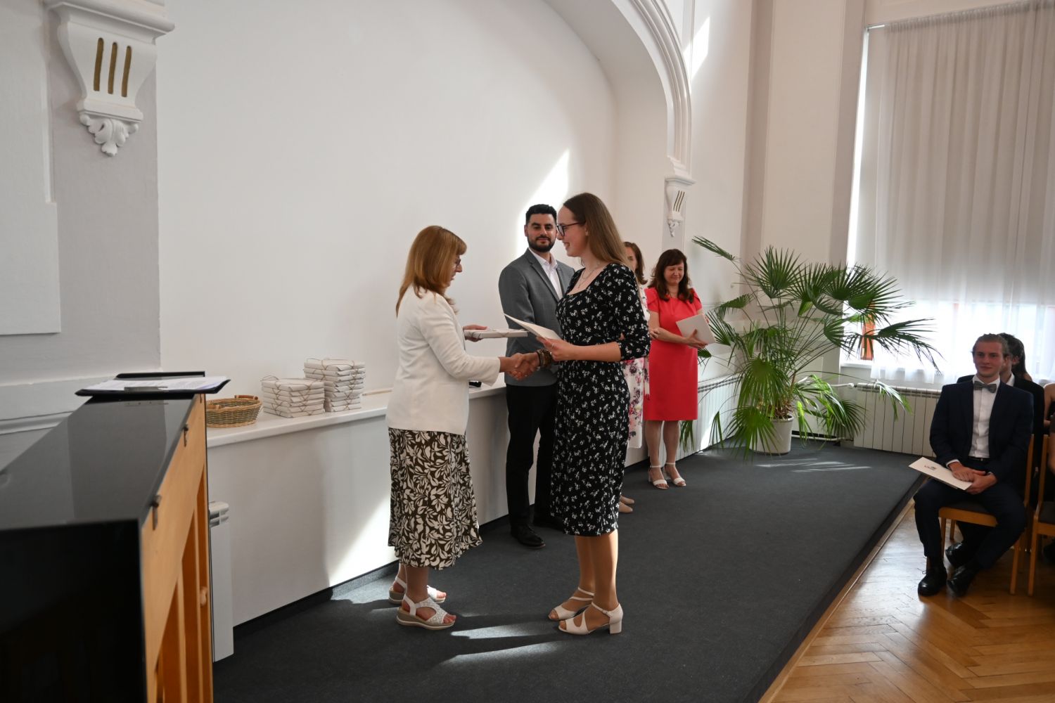 V aule školy absolventi převzali z rukou ředitelky Ilony Pokorné a starosty města Alexandrose Kaminarase ještě čerstvá maturitní vysvědčení. Šlo o 49 maturantů ze tříd 8. A a 4. C. Mimo maturitních vysvědčení dostali absolventi i vysvědčení za poslední ročník, dále pak drobný dárek a čtyři z nich stipendium za to, že po celou dobu studia prošli s vyznamenáním.