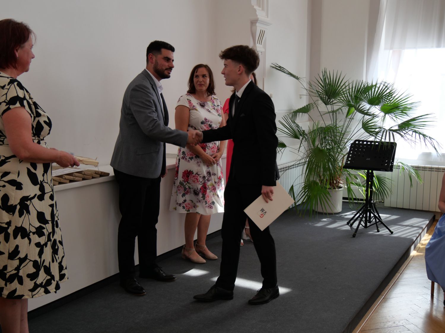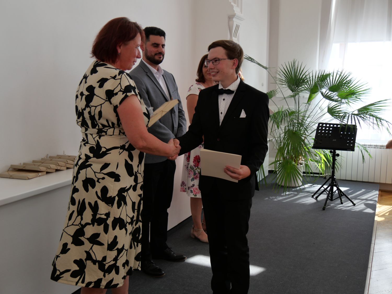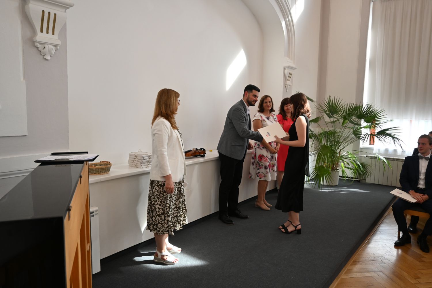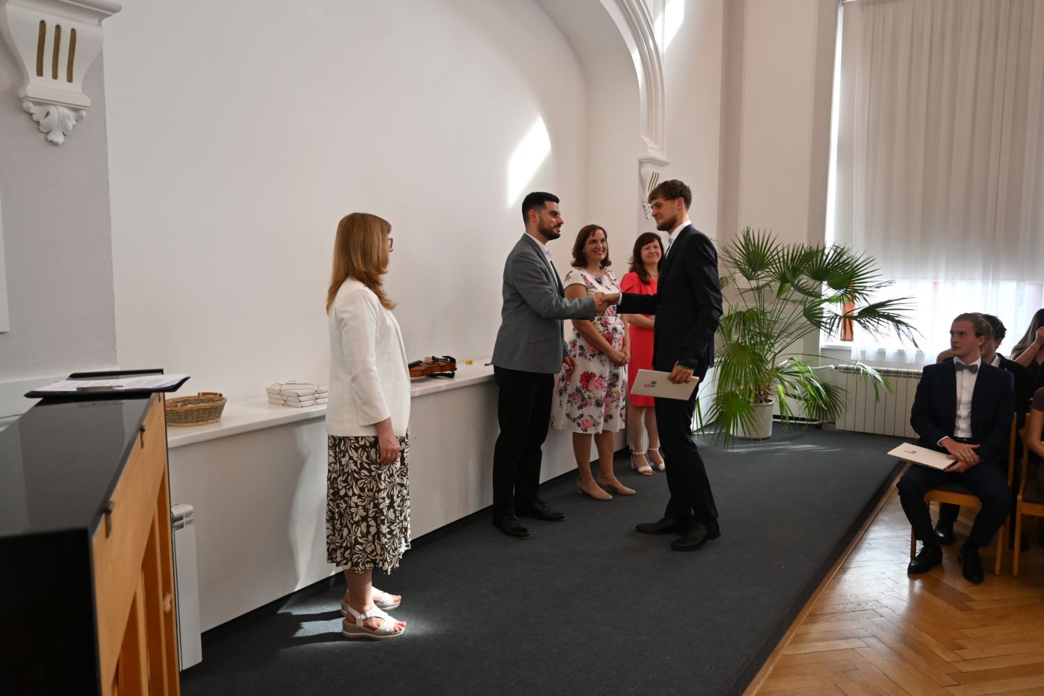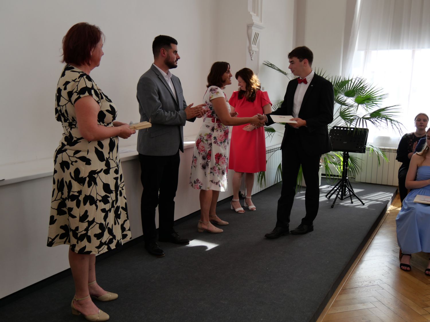 V aule školy absolventi převzali z rukou ředitelky Ilony Pokorné a starosty města Alexandrose Kaminarase ještě čerstvá maturitní vysvědčení. Šlo o 49 maturantů ze tříd 8. A a 4. C. Mimo maturitních vysvědčení dostali absolventi i vysvědčení za poslední ročník, dále pak drobný dárek a čtyři z nich stipendium za to, že po celou dobu studia prošli s vyznamenáním.