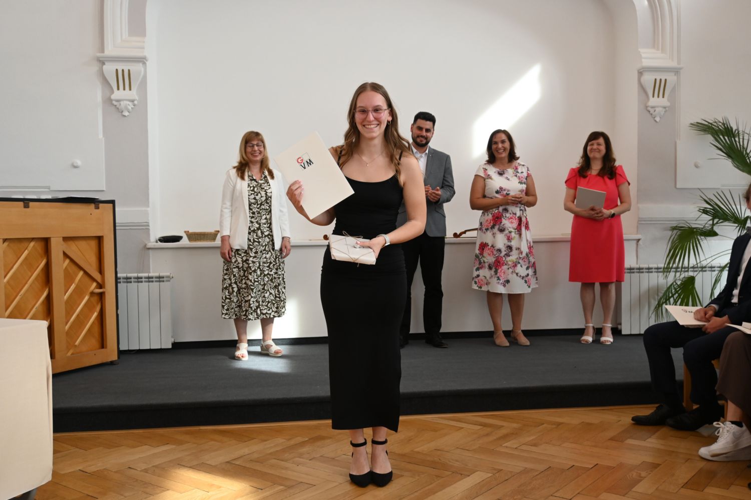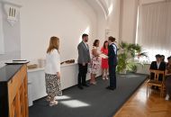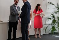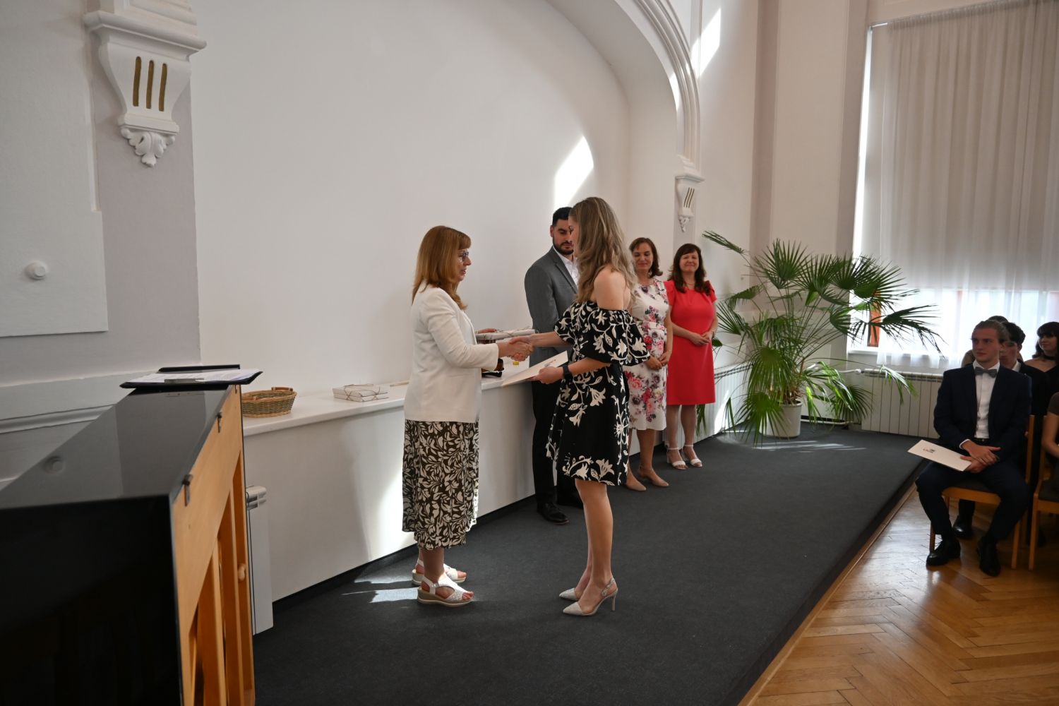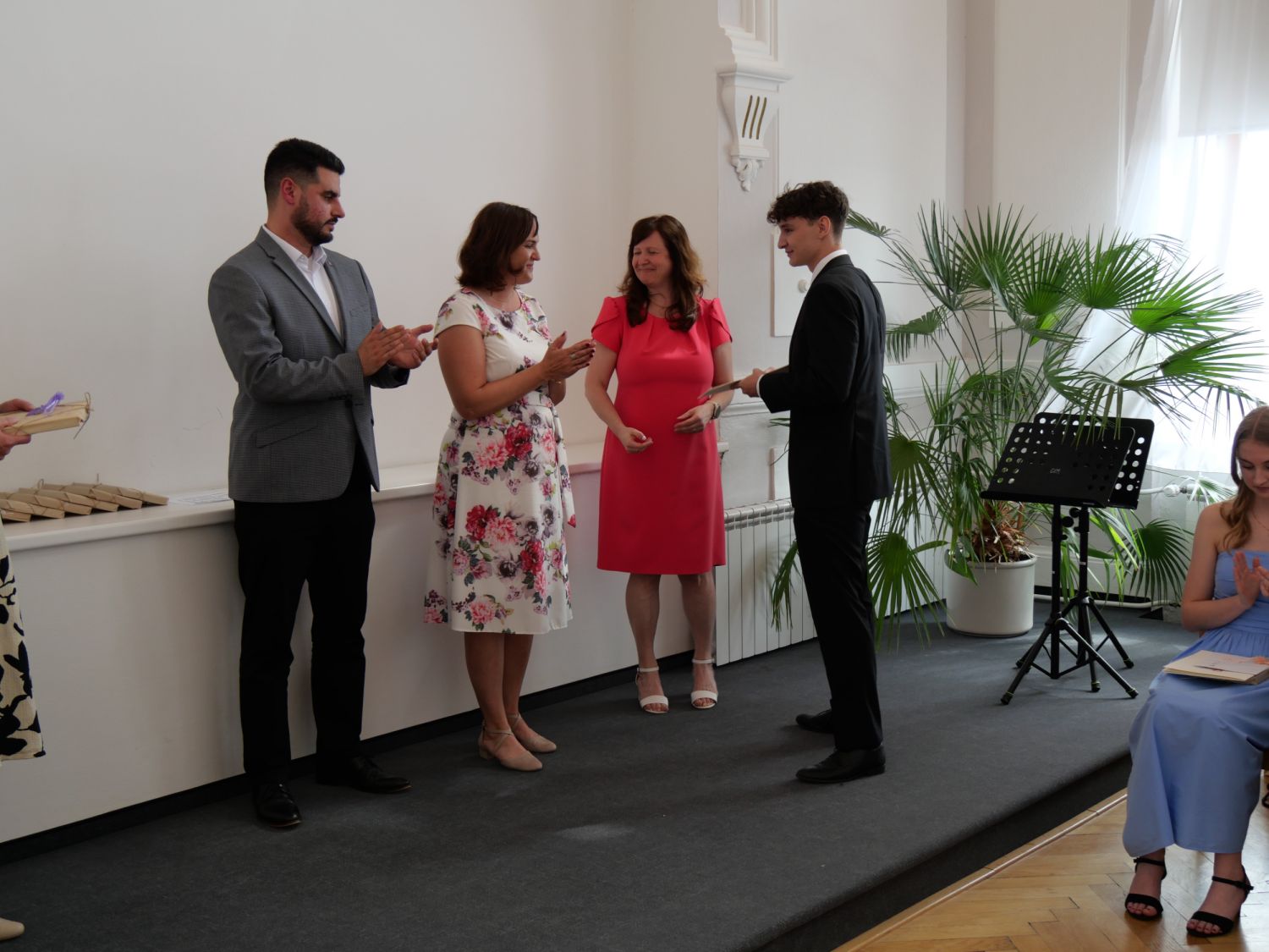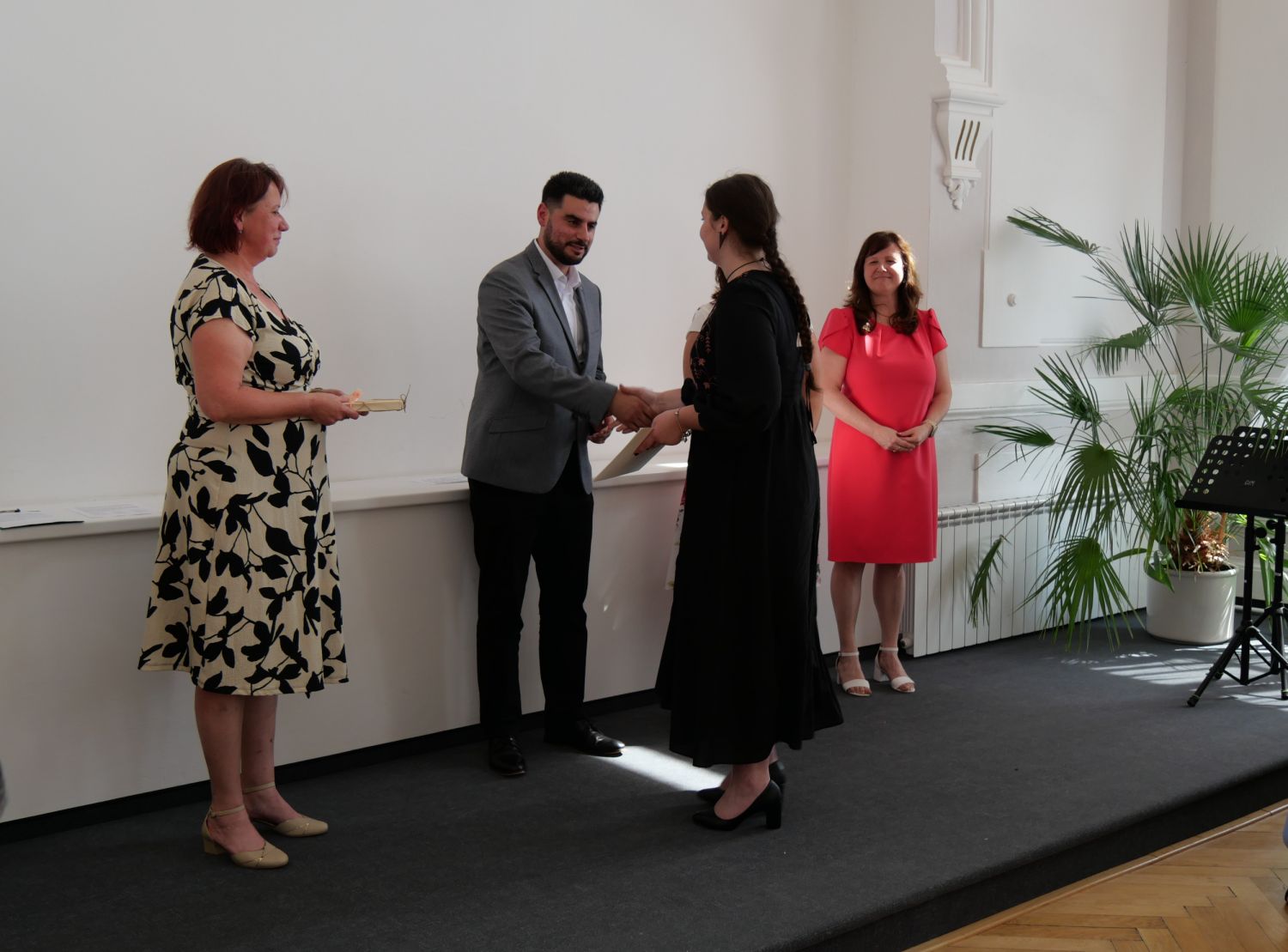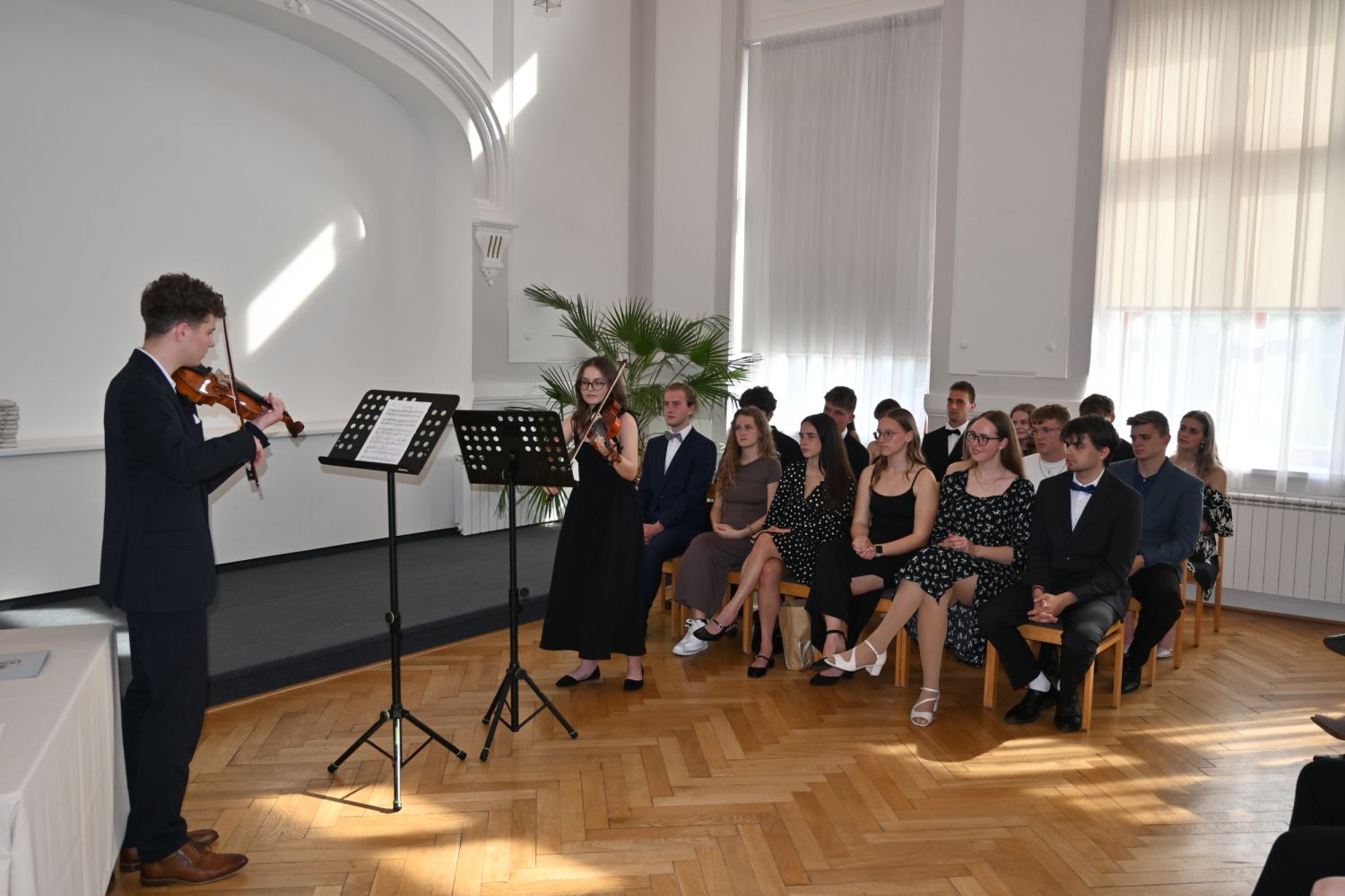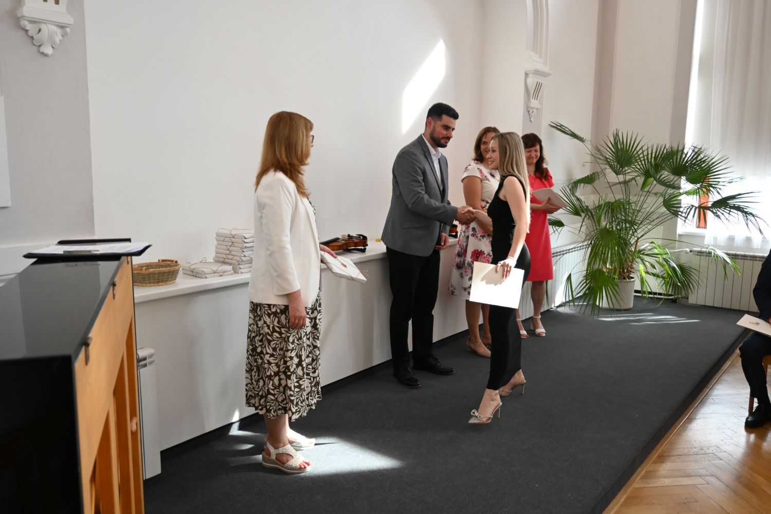 V aule školy absolventi převzali z rukou ředitelky Ilony Pokorné a starosty města Alexandrose Kaminarase ještě čerstvá maturitní vysvědčení. Šlo o 49 maturantů ze tříd 8. A a 4. C. Mimo maturitních vysvědčení dostali absolventi i vysvědčení za poslední ročník, dále pak drobný dárek a čtyři z nich stipendium za to, že po celou dobu studia prošli s vyznamenáním.
