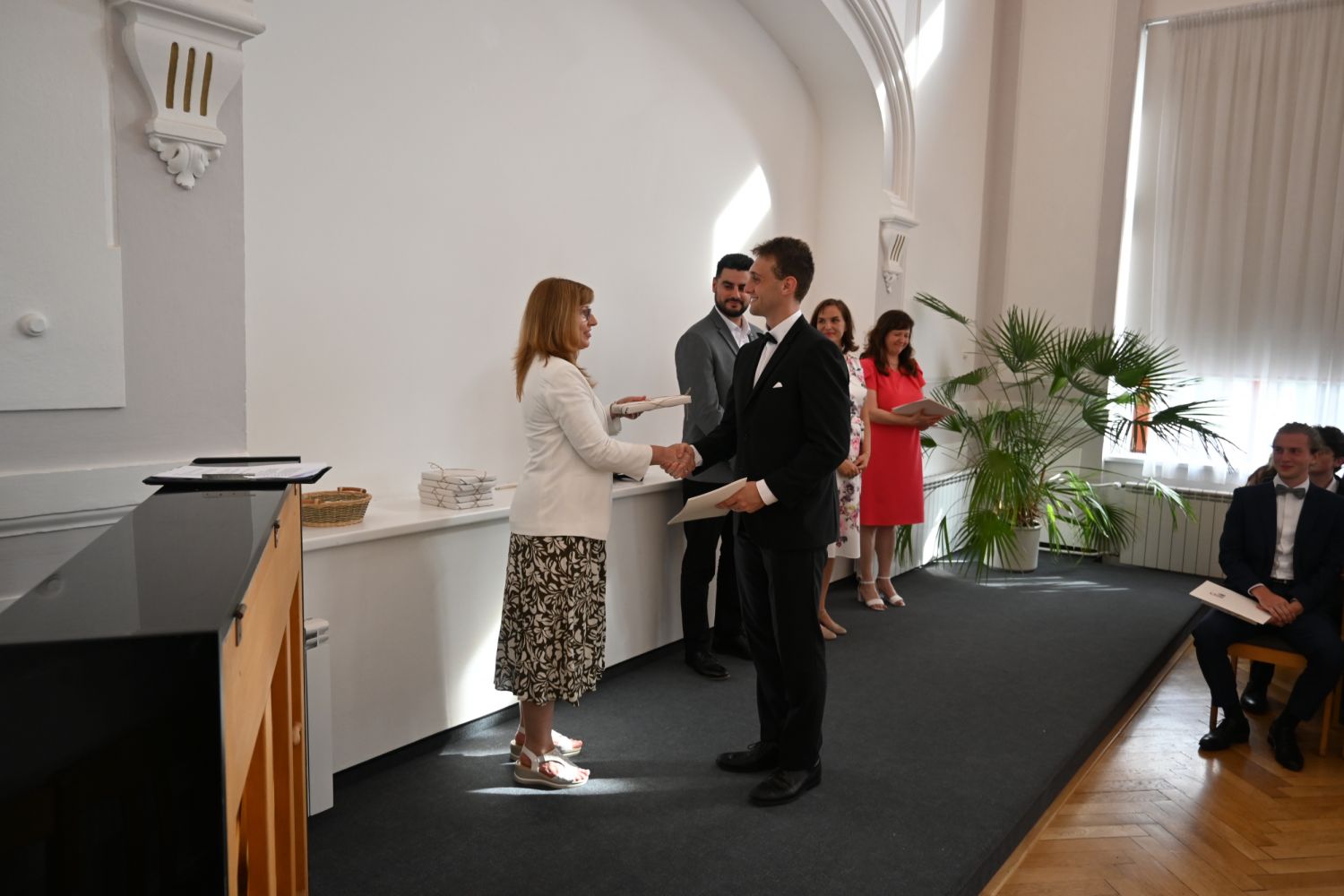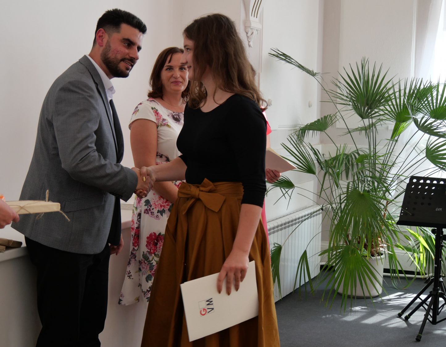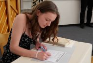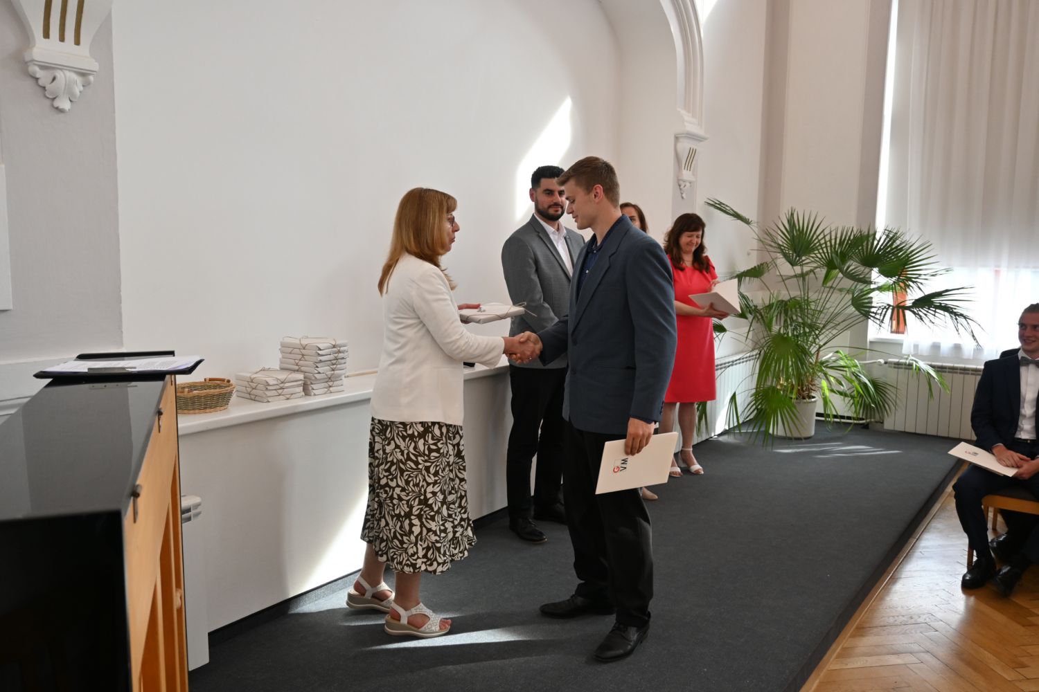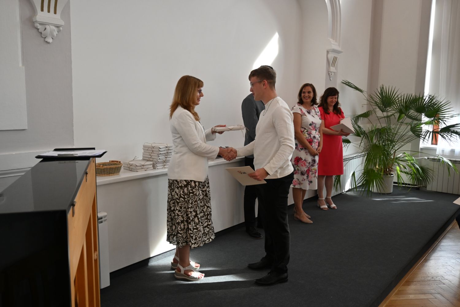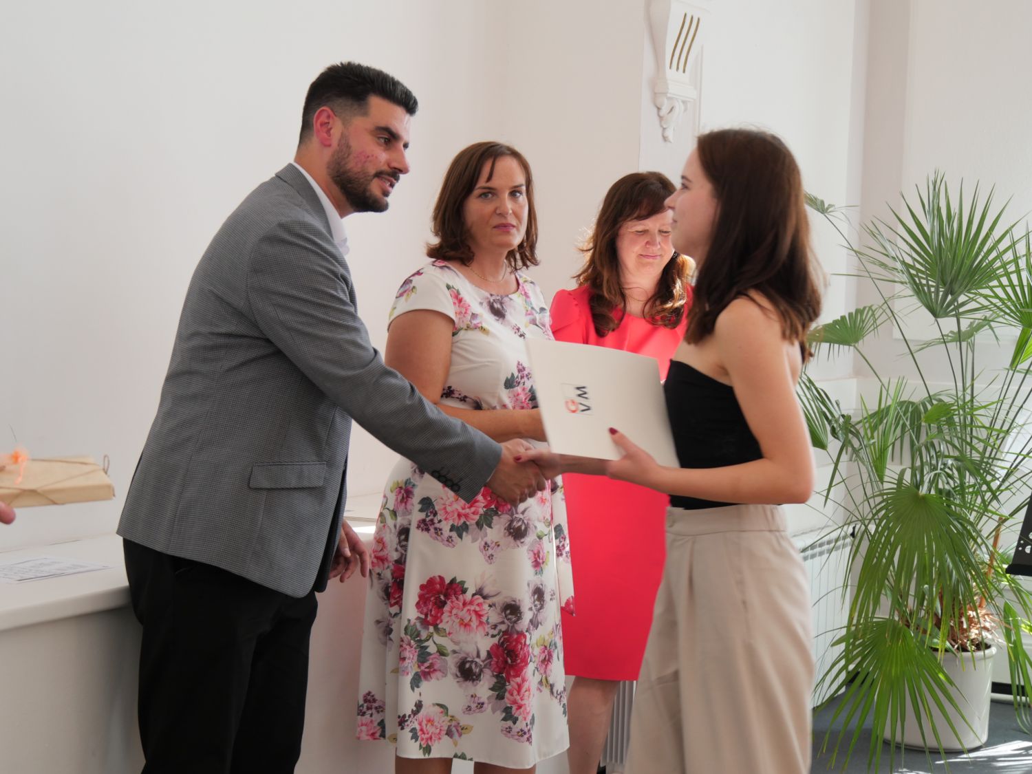 V aule školy absolventi převzali z rukou ředitelky Ilony Pokorné a starosty města Alexandrose Kaminarase ještě čerstvá maturitní vysvědčení. Šlo o 49 maturantů ze tříd 8. A a 4. C. Mimo maturitních vysvědčení dostali absolventi i vysvědčení za poslední ročník, dále pak drobný dárek a čtyři z nich stipendium za to, že po celou dobu studia prošli s vyznamenáním.
