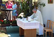 Barevnými krepovými stuhami a květinami nazdobené prostranství kaple sv. Ladislava, který na přítomné shlížel z obrazu, přivítalo místní i návštěvníky z okolí. Mše svatá začala po jedenácté hodině pod širým nebem, které bylo jako vymalované. Obloha byla bez jediného mráčku, slunce pražilo a účastníci tak uvítali stín pod plátěnými stany. Otec Bohumil Poláček proto závěrem všem, kteří místo pro obřad chystali, za perfektní organizaci a příjemné prostředí.