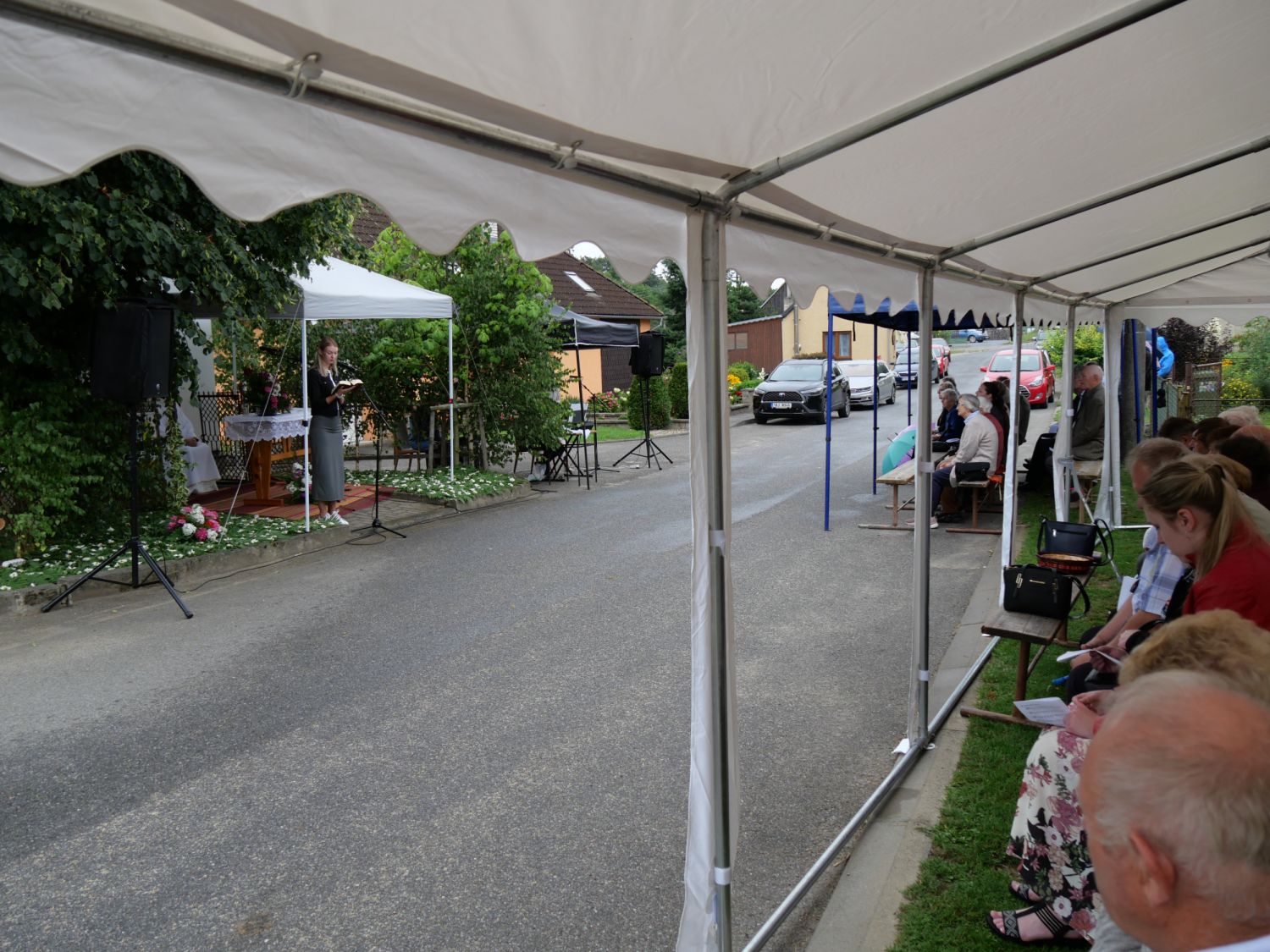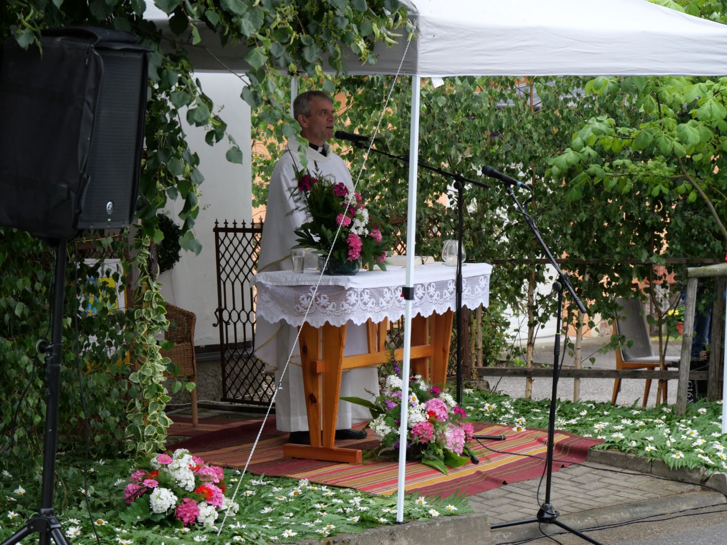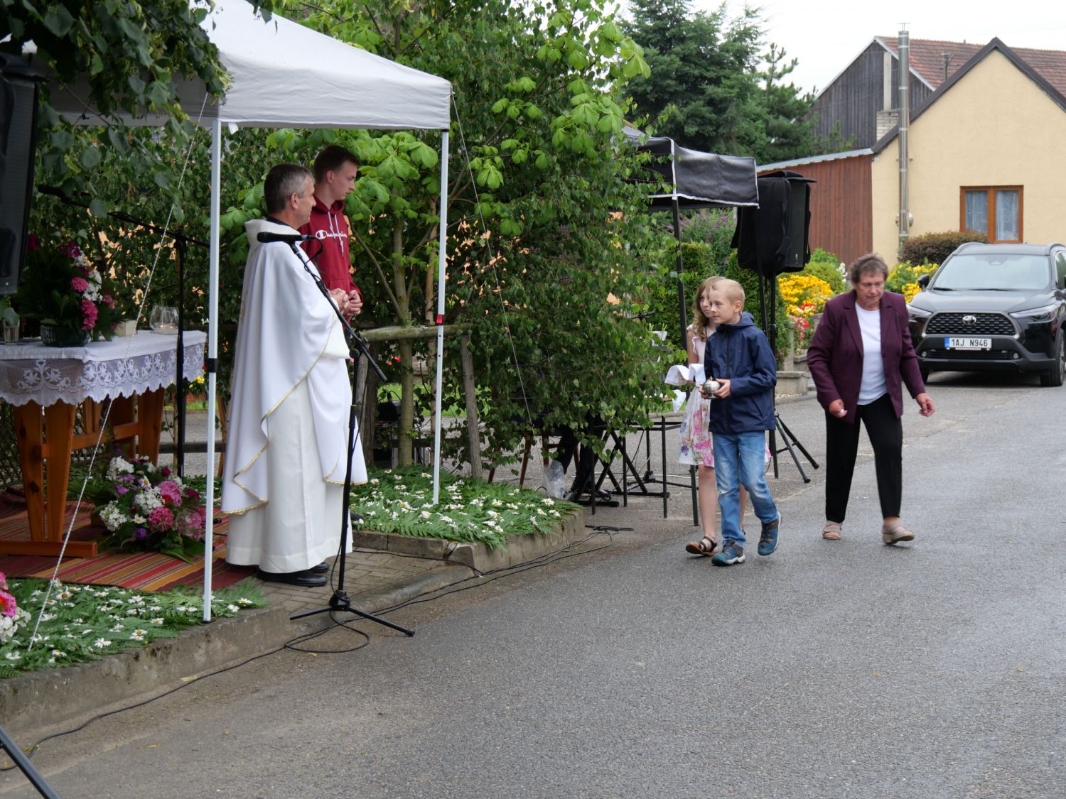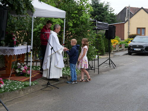 Mši svatou ve stínu vzrostlé lípy před kaplí sloužil velkomeziříčský děkan P. Jiří Kaňa, pro kterého to byla v Kúskách premiéra. Pouťovou atmosféru pak dokreslovala výzdoba kaple a okolí, které dominovaly především květinové koberce.