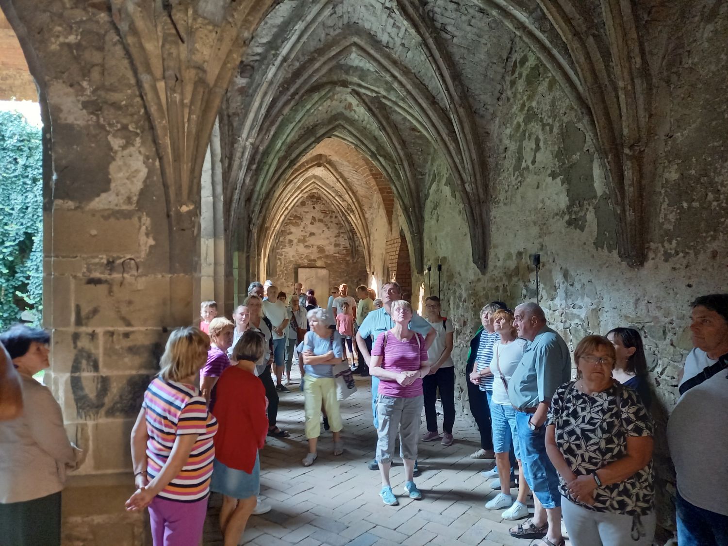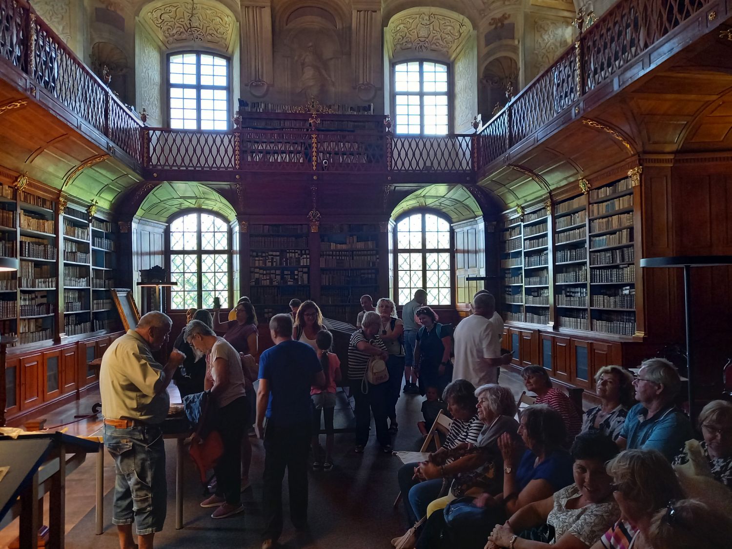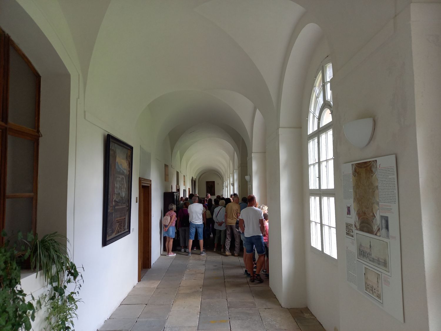 Další zastávkou byl benediktinský klášter v Rajhradě. Po výborném obědě v restauraci Taverna u Benediktinů Rajhrad jsme si prohlédli areál kláštera, který již 30 let prochází kompletní rekonstrukcí, stejně jako tamější kostel. Následovala prohlídka Památníku písemnictví na Moravě a přednáška skutečného nadšence pro historii kláštera, jeho stavebně architektonického vývoje a také obsahu místní vzácné knihovny. Mohli jsme vidět, že klášter opravdu vstává z popela, ale k jeho kompletní obnově vede ještě dlouhá cesta.