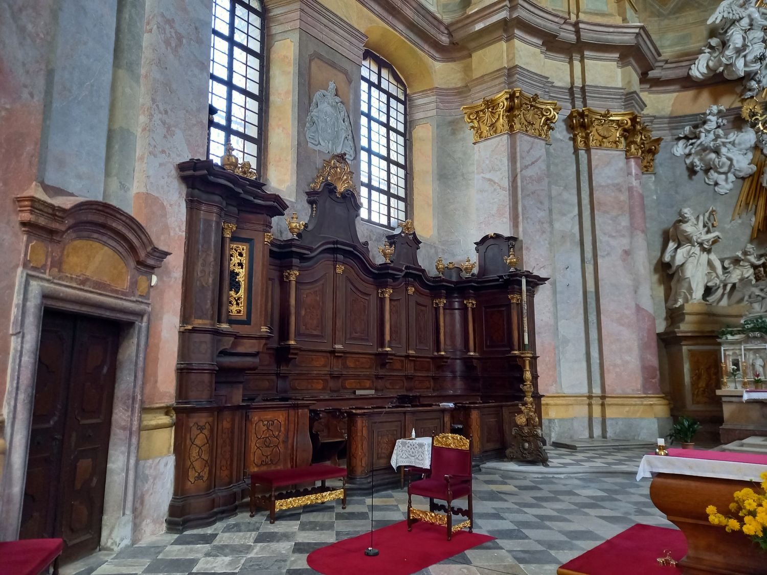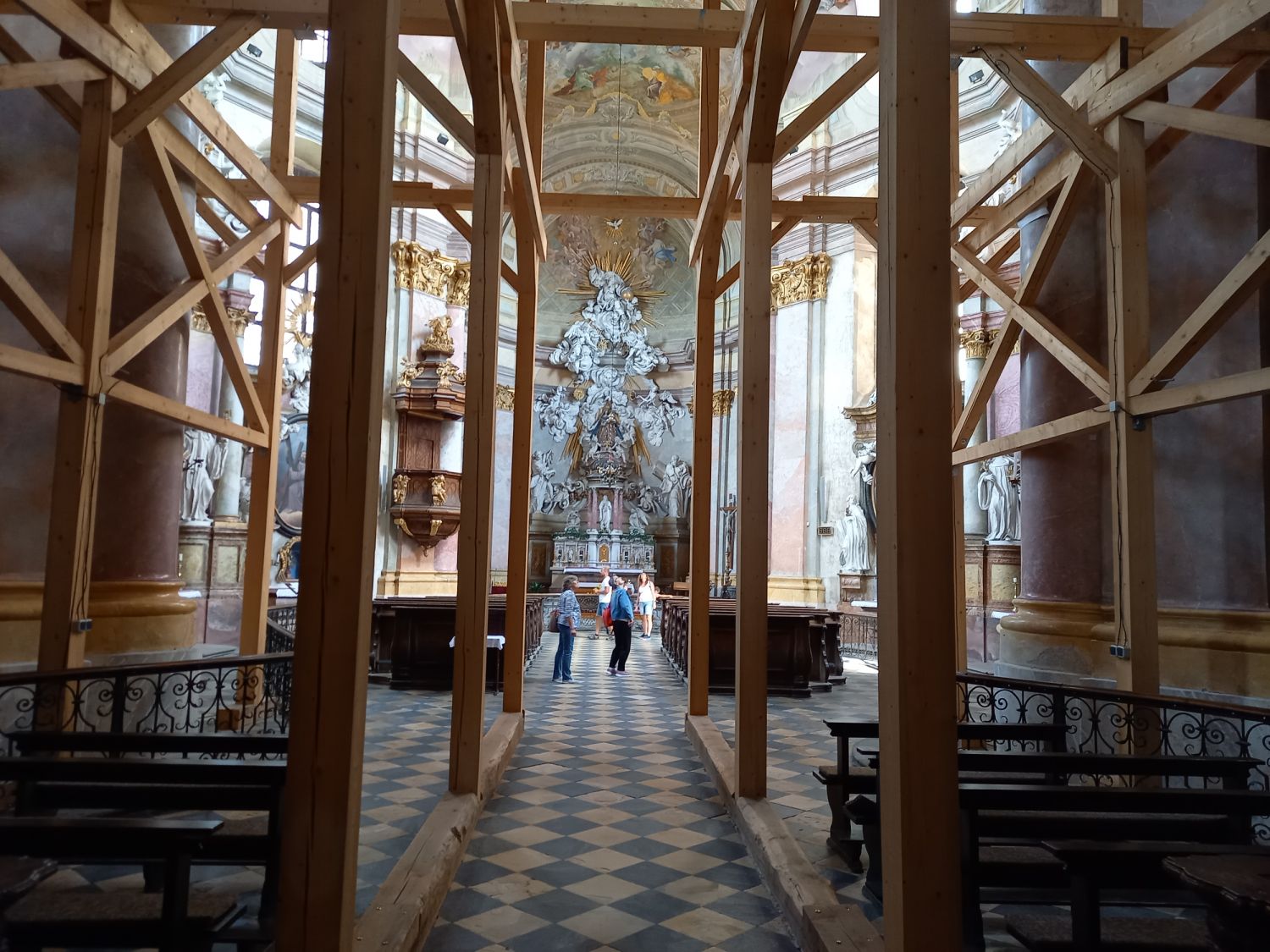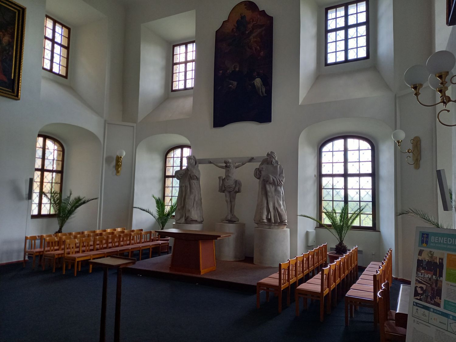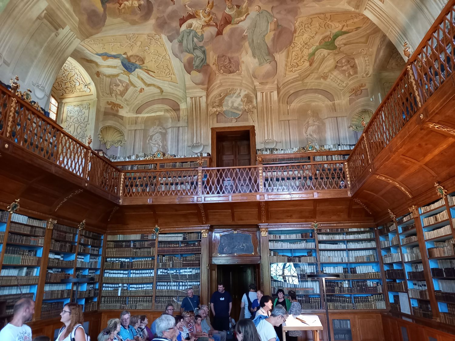 Další zastávkou byl benediktinský klášter v Rajhradě. Po výborném obědě v restauraci Taverna u Benediktinů Rajhrad jsme si prohlédli areál kláštera, který již 30 let prochází kompletní rekonstrukcí, stejně jako tamější kostel. Následovala prohlídka Památníku písemnictví na Moravě a přednáška skutečného nadšence pro historii kláštera, jeho stavebně architektonického vývoje a také obsahu místní vzácné knihovny. Mohli jsme vidět, že klášter opravdu vstává z popela, ale k jeho kompletní obnově vede ještě dlouhá cesta.
