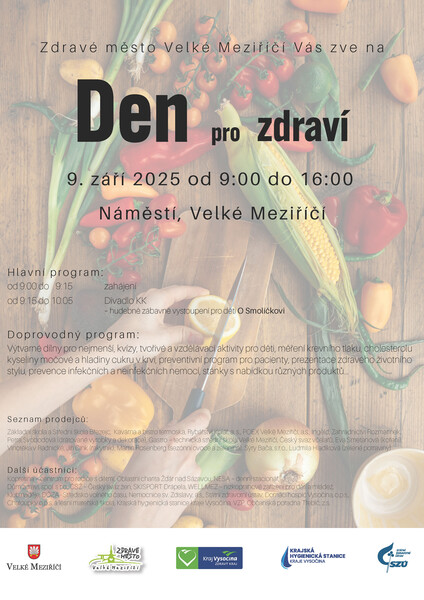 Zdravé město Velké Meziříčí zve na Den pro zdraví, který se uskuteční v pondělí 9. září od 9:00 do 16:00. Přijďte si užít den plný zábavy, poznání a inspirace pro zdravý životní styl! Akce se bude konat na náměstí a je určena pro všechny generace – od nejmenších dětí až po seniory.