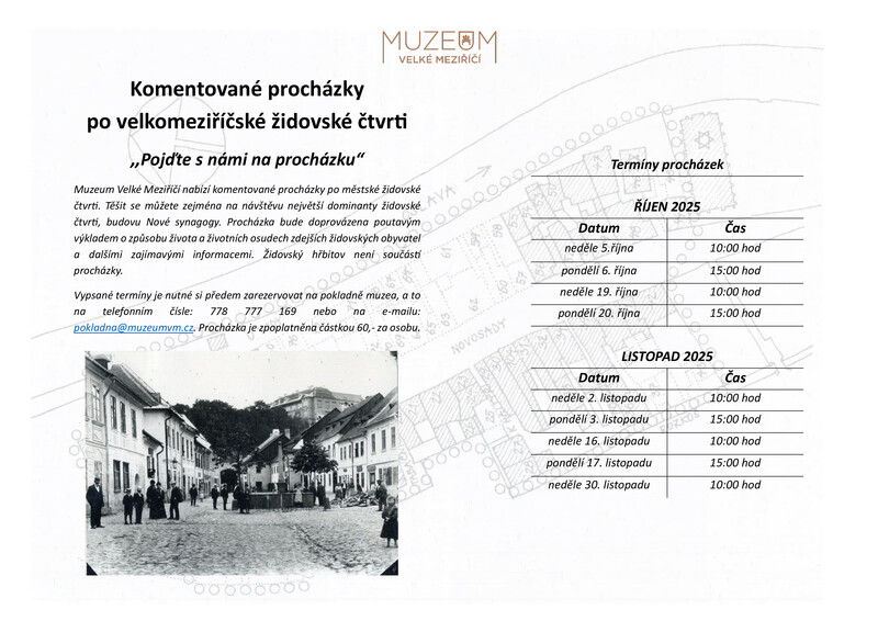 Procházky velkomeziříčskou židovskou čtvrtí budou pokračovat i na podzim. Těšit se můžete zejména na zajímavé informace a příjemnou procházku malebnými uličkami bývalé Dalimilovy ulice, jejímž vrcholem bude návštěva dominanty židovské čtvrti, a to budovy nové synagogy. Na stanovené termíny je nutné se předem objednat na pokladně muzea, odkud budou procházky ve stanovených časech také odcházet.