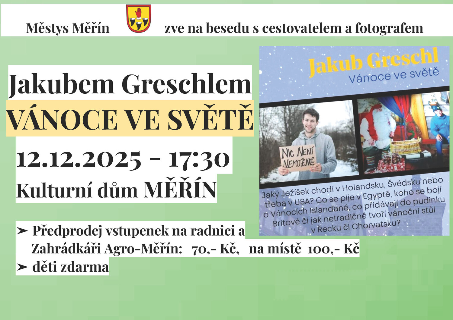 Cestovatel a fotograf Jakub Greschl bude 12. prosince od 17.30 hodin přednášet v kulturním domě v Měříně. Na předvánoční období zvolil stylové téma – Vánoce ve světě.