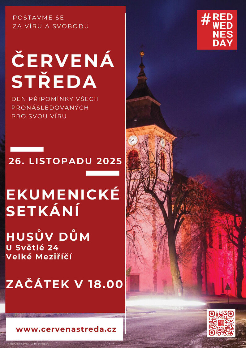Středa 26. listopadu je tzv. Červenou středou, tedy dnem připomínky všech pronásledovaných pro svou víru. Tento den se v Husově domě ve Velkém Meziříčí uskuteční ekumenické setkání. Začátek je v 18 hodin.