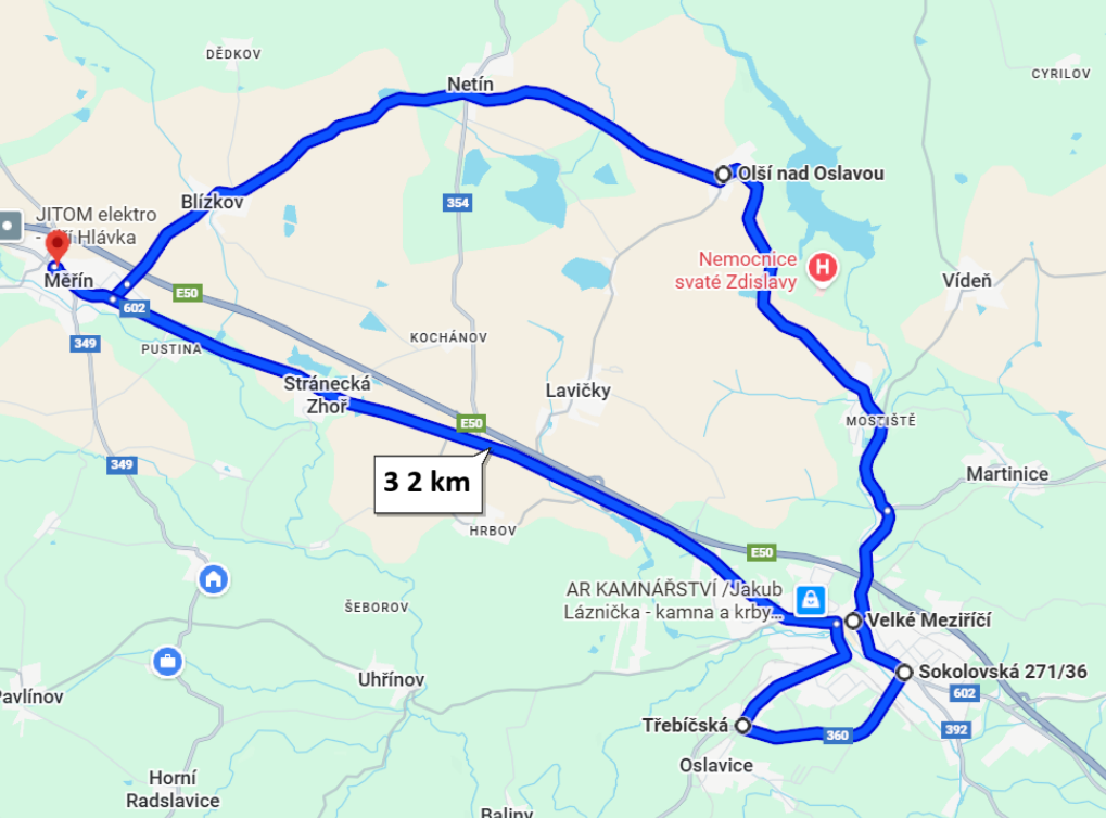 Letošní jízda bude bez obvyklé zastávky na velkomeziříčském náměstí a účastníci pojedou po trase: Měřín – Blízkov – Netín – Olší nad Oslavou – Mostiště – Velké Meziříčí Novosady – obchvat směr Třebíč – na kruhovém objezdu zpět na Velké Meziříčí a odsud „starou brněnskou silnicí“ (č.602) zpět do Měřína.