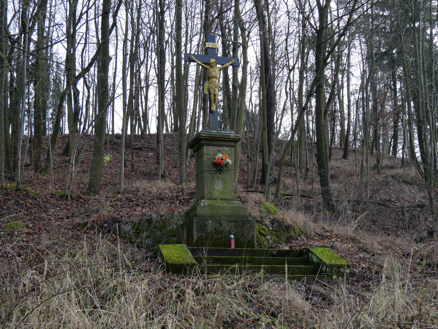 Ke křížku vedou schůdky a dodnes zde nechybí květinová výzdoba, občas i svíčka.