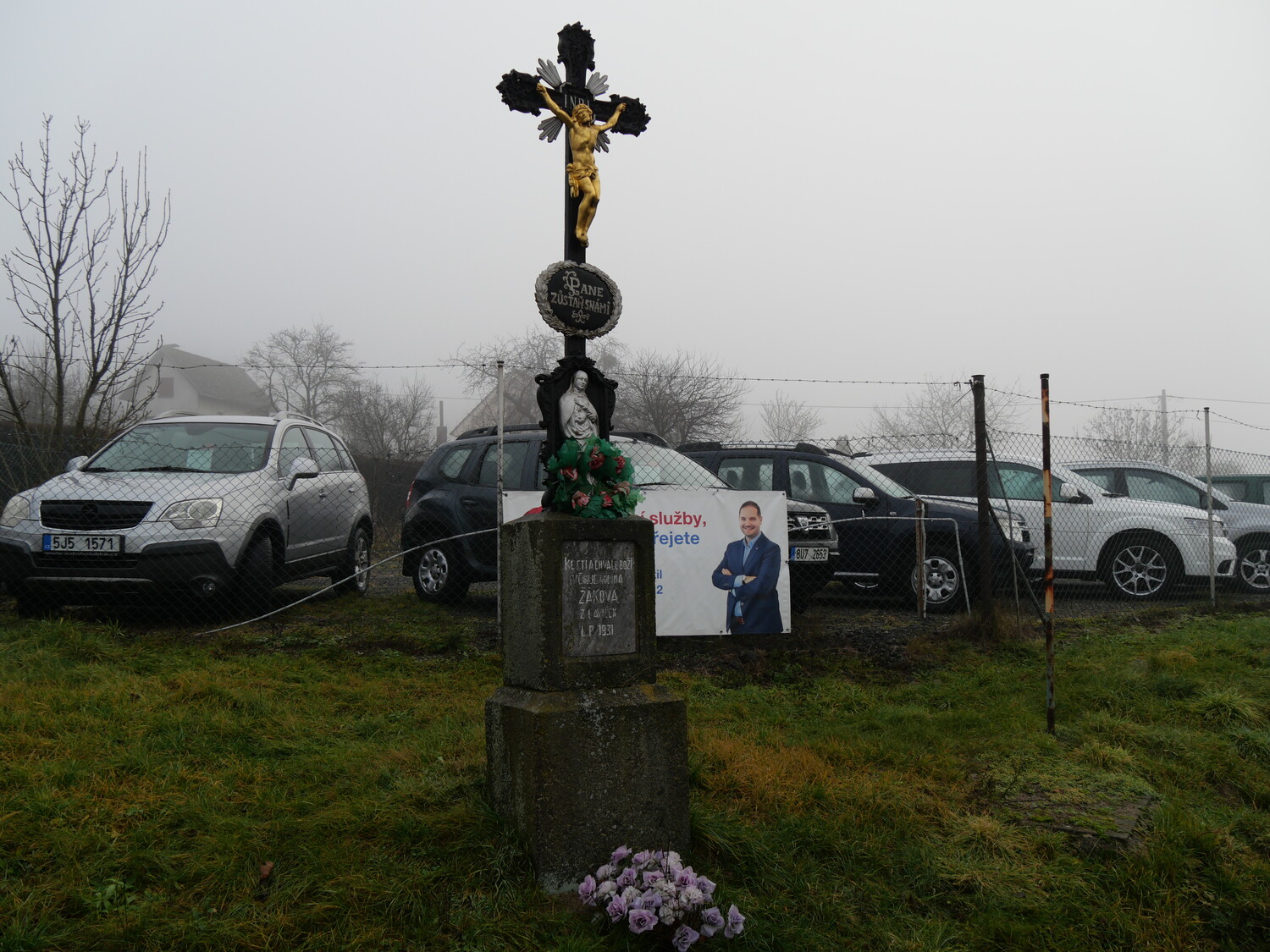 Tento kříž stojí na konci města při silnici na Jihlavu. Dříve na tomto místě stával kříž dřevěný. Dnešní kříž je litinový na kamenném podstavci. Figura Krista je pozlacená, figura Panny Marie postříbřená – Mezi figurami je tabulka s nápisem PANE / ZŮSTAŇ S NÁMI. Na podstavci je pak kamenná deska s nápisem: KE CTI A CHVÁLE BOŽÍ / VĚNUJE RODINA / ŽÁKOVA / Z LAVIČEK. / L. P. 1931.