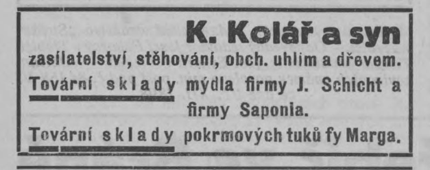 Firma Schicht sídlila v Ústí nad Labem, filiálku měla ovšem i v Jihlavě a ve Velkém Meziříčí měla na počátku třicátých let tovární sklady mýdla a pokrmových tuků, které provozovala firma K. Kolář a syn. V té době také Schicht intenzivně inzeroval ve Velkomeziříčsku.