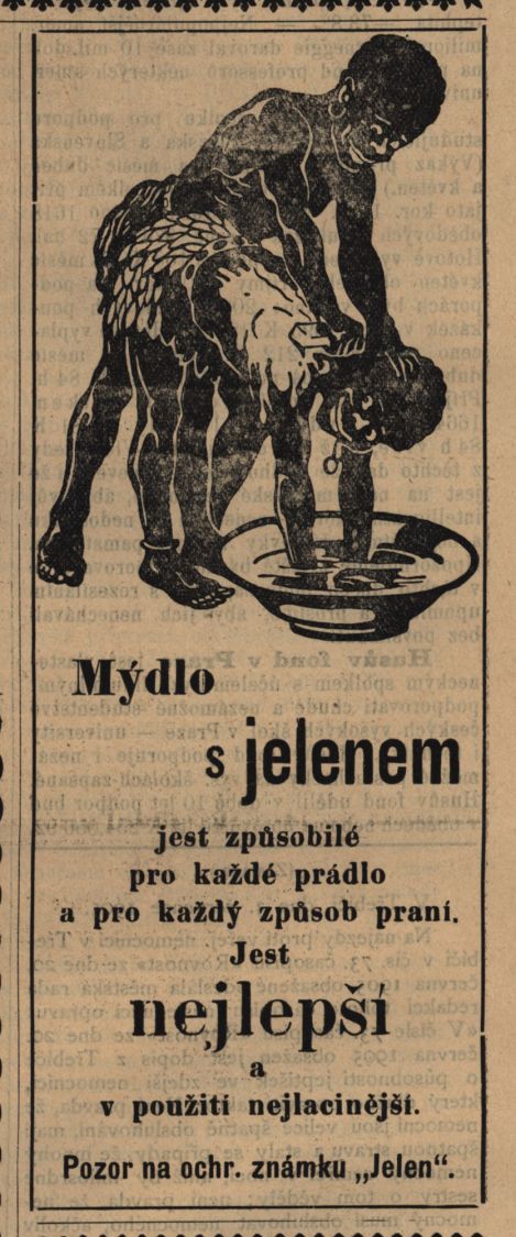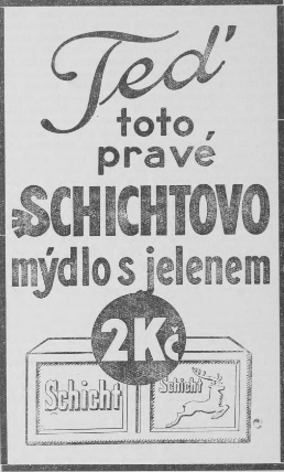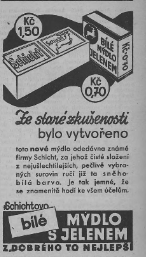 Pak přišla válka a rodina Schichtů se rozběhla po celém světě, jen mýdlo s jelenem zůstalo. Jako ilustraci přinášíme několik reklam z dob první republiky ze stránek Velkomeziříčska a Horácka, a také jednu z Hlasů ze západní Moravy z roku 1905, která by dnes nikde neprošla, ale je zajímavou ilustrací doby.