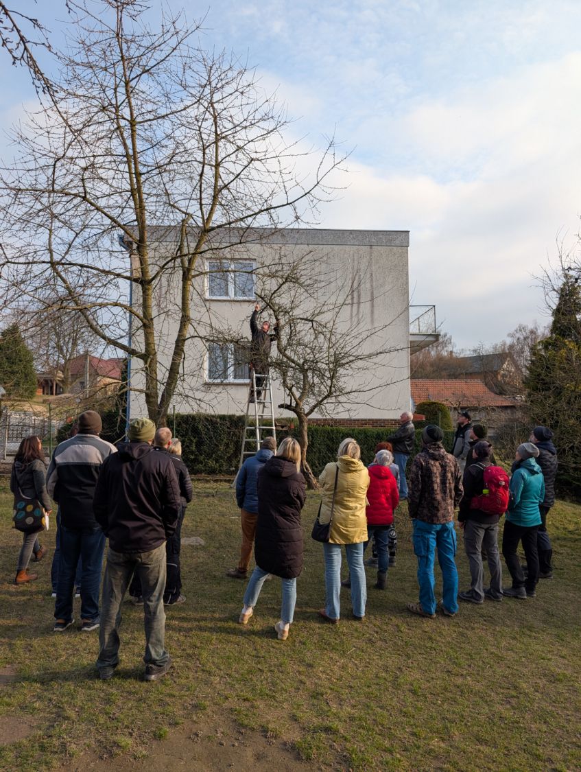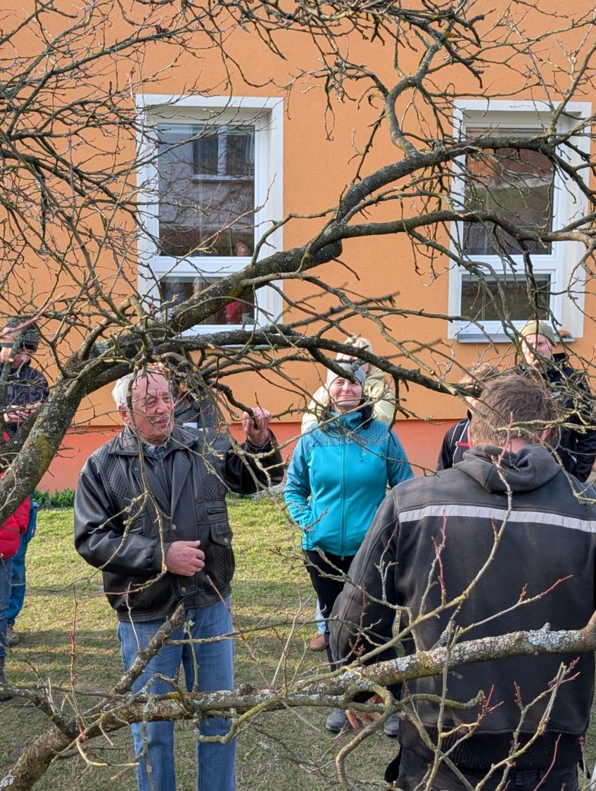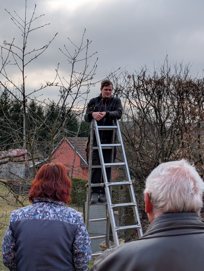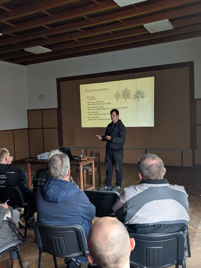 Zájemci se v sobotu 14. března odpoledne sešli v kulturním domě ve Lhotkách, kde si nejprve vyslechli základní informace proč, jak a kdy řezat ovocné stromy, a zhlédli přitom řadu fotografií z terénu. Jan Oulehla zdůraznil důležitost výchovného řezu stromků v prvních letech po výsadbě, který je zásadní pro správné založení koruny. Věnoval se i řezům prosvětlovacím a zmlazovacím. „Prosvětlení koruny zajistí lepší úrodu ovoce, prevenci chorob i lámání větví pod úrodou či námrazou,“ připomněl sadař. Následovala vycházka do terénu ke starším stromům v zahradě školy i k mladé výsadbě u žlabu, kde lidé zhlédli praktické ukázky řezu.