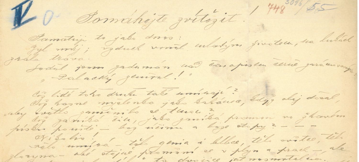 V nevelkém fondu Vladimíra Čecha se nám také dochoval Čechův rukopis „Pomáhejme zvítězit!“, ve kterém je patrná autorova lyrická i vlastenecká stránka. Začíná slovy „Pamatuji to jako dnes: Byl máj, vzduch voněl mladým životem, na lukách zrála tráva. Seděl jsem zadumán nad časopisem černě zarámovaným. Palacký zemřel! Což lidé toho druhu také umírají?“