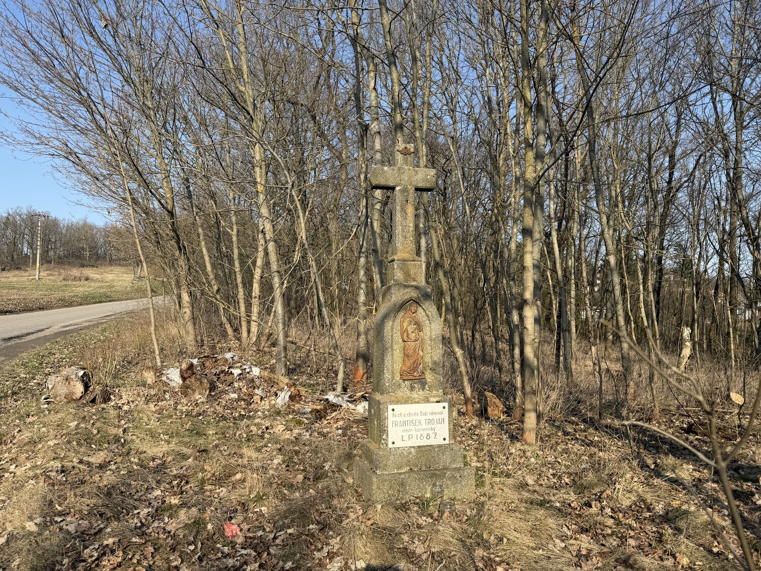 Tento kříž stojí u cesty na Fajtův kopec, a to nedaleko vrcholu. Jedná se o kamenný kříž s chybějící figurou Krista a s původně pozlacenou figurou Panny Marie. V dolní části je mramorová deska s nápisem: Ke cti a chvále Boží věnoval / FRANTIŠEK TROJAN / mistr kamenický / L. P. 1887.