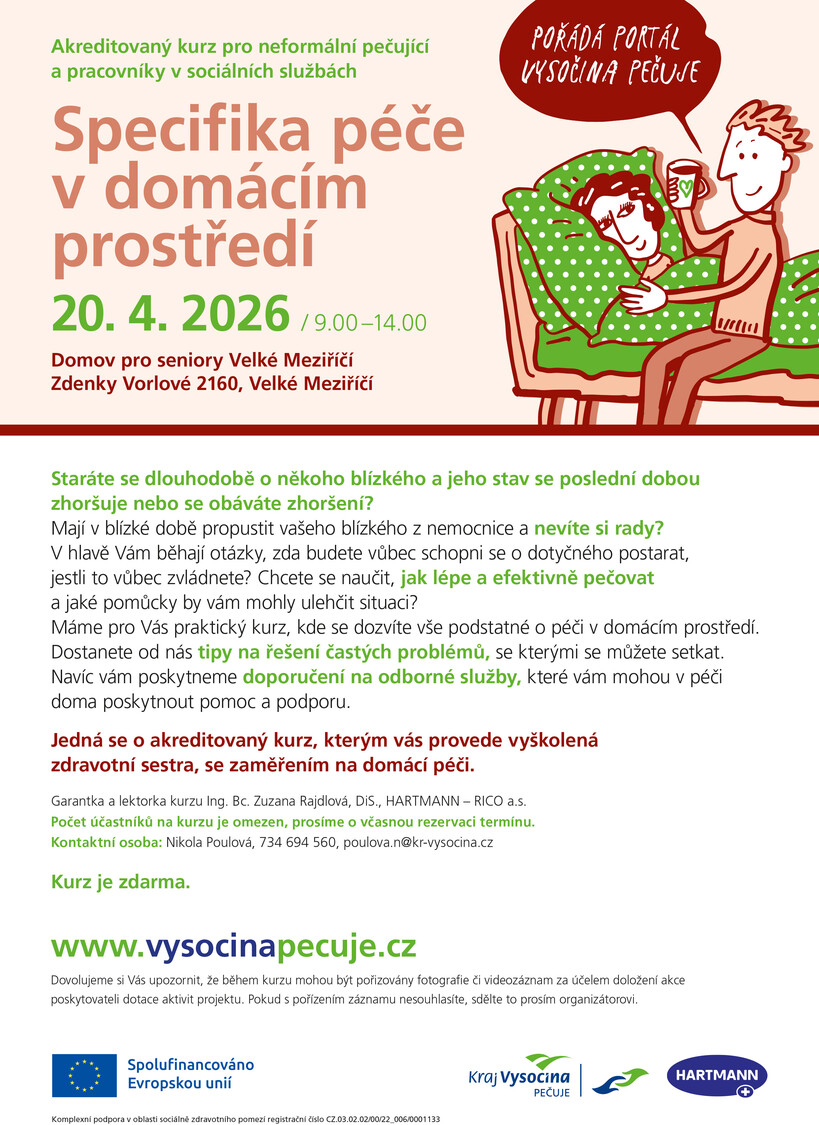 V domově pro seniory na ulici Zdenky Vorlové proběhne v pondělí 20. dubna akreditovaný kurz pro neformální pečující a pracovníky v sociálních službách a názvem Specifika péče v domácím prostředí. Kurz se bude konat od 9 do 14 hodin.