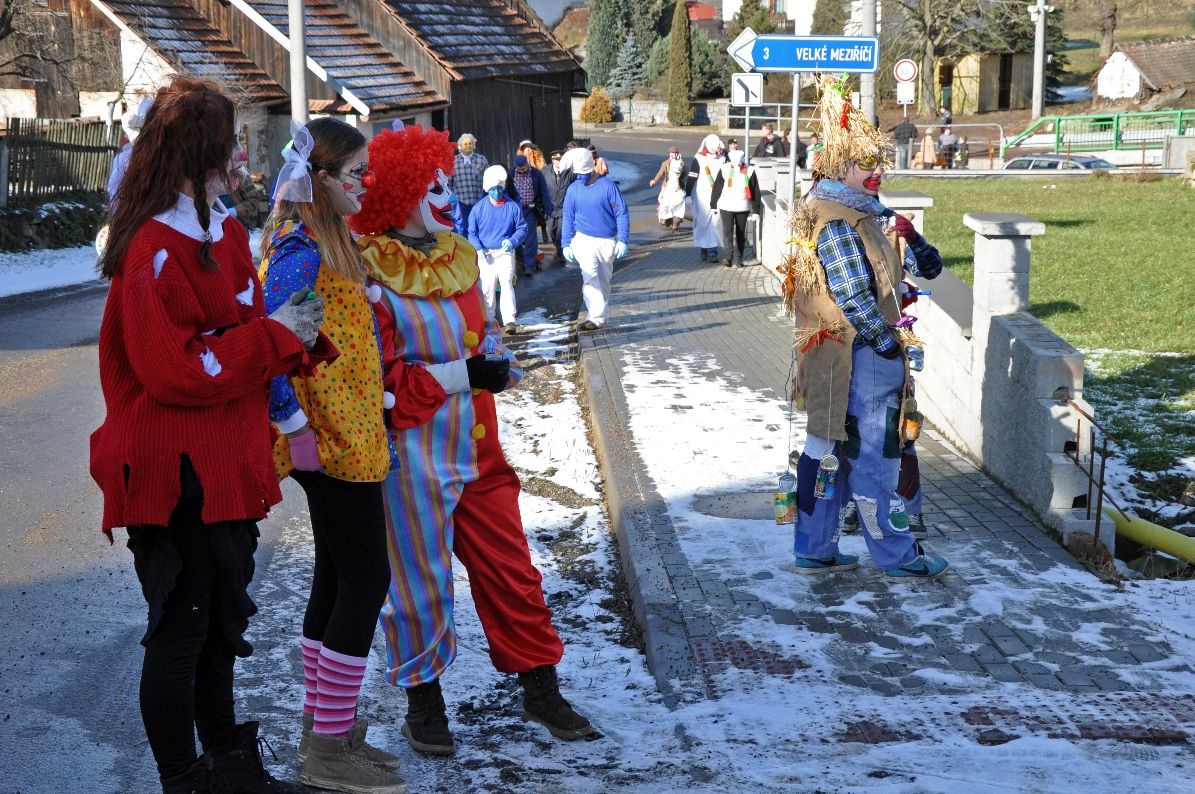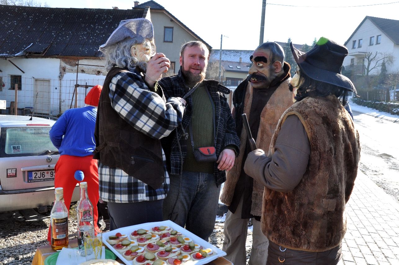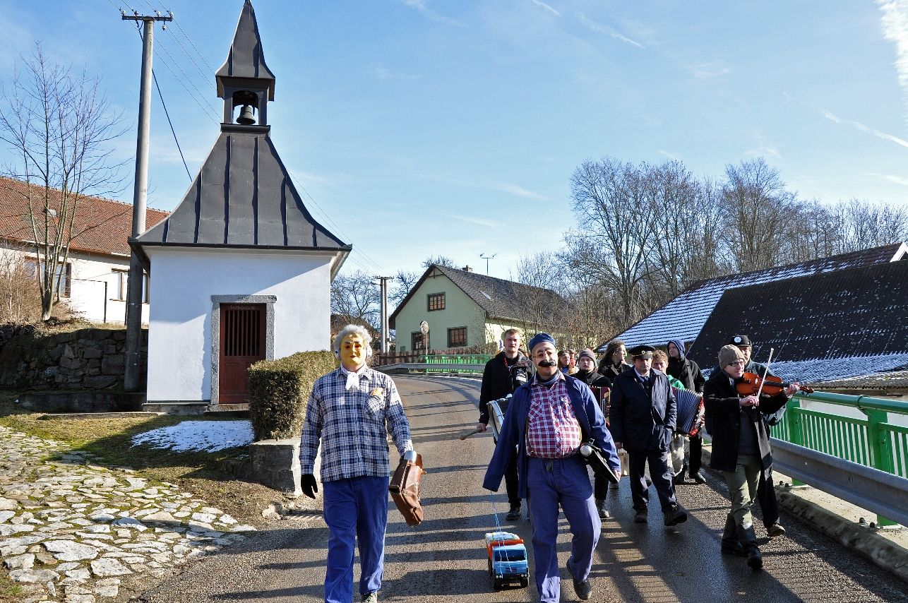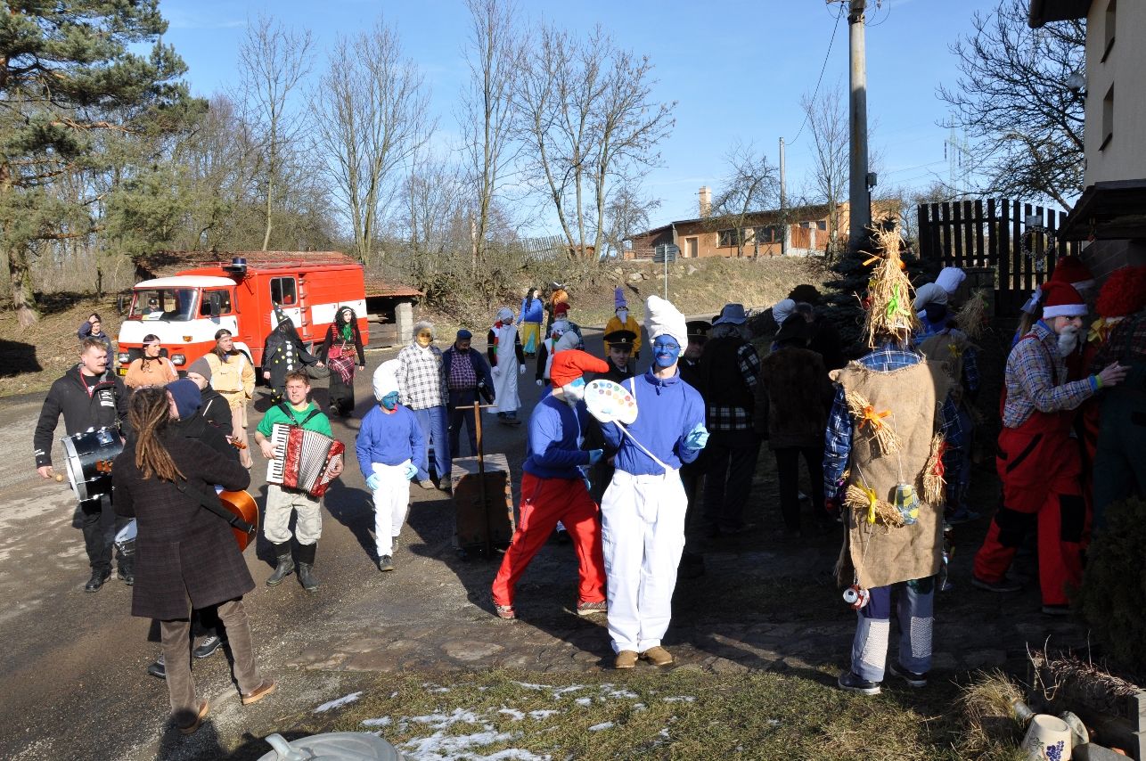 Spolu s hasiči šli se zpěvem dům od domu, aby pozvali obyvatele na večerní ostatkovou zábavu s kapelou Žízeň v kulturním domě ve Lhotkách. Každého, koho potkali, řádně zmalovali a navoněli. Lidé jim za to nabídli, koláče, buchty či koblihy, chlebíčky a samozřejmě i nějakou tu štamprli.