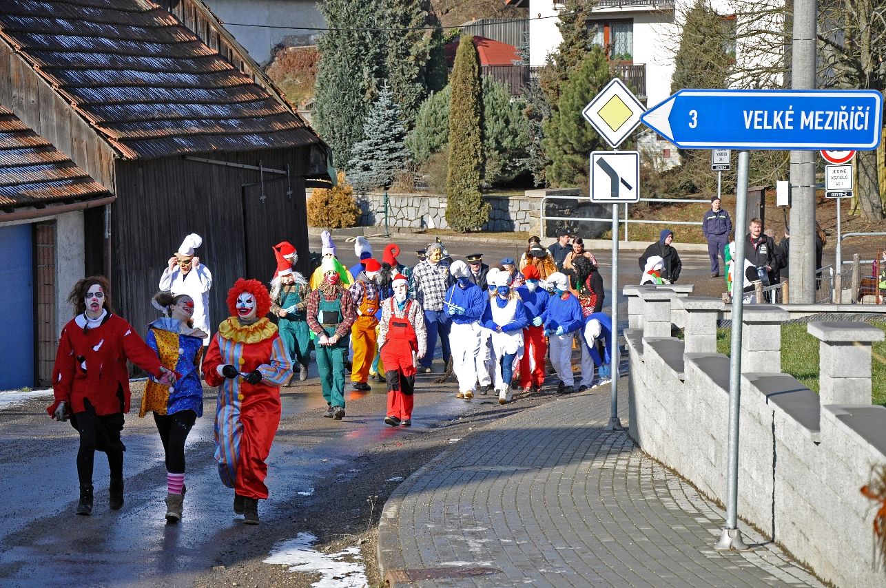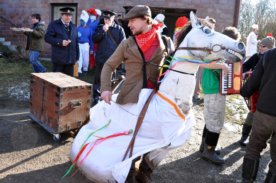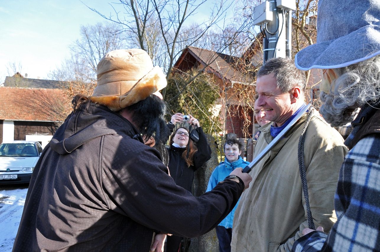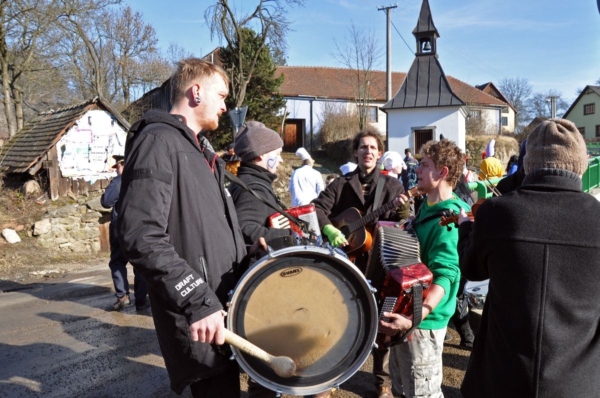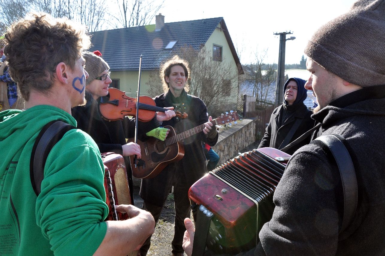 Spolu s hasiči šli se zpěvem dům od domu, aby pozvali obyvatele na večerní ostatkovou zábavu s kapelou Žízeň v kulturním domě ve Lhotkách. Každého, koho potkali, řádně zmalovali a navoněli. Lidé jim za to nabídli, koláče, buchty či koblihy, chlebíčky a samozřejmě i nějakou tu štamprli.