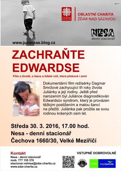 Dokument „Zachraňte Edwardse" zachycuje život manželů Sladkowskich, jejich každodenní radosti i náročné chvíle, narození Julianky a první roky jejího života. Tento dokument o životě, o lásce a lidské vůli, která překoná i smrt, bude promítán v denním stacionáři Nesa ve Velkém Meziříčí ve středu 30. března 2016 v 17.00 hodin. Závěrem se účastníci mohou setkat s hlavními představiteli filmu, rodinou Sladkowskich, a položit jim otázky, které dokument v divácích zanechá.