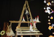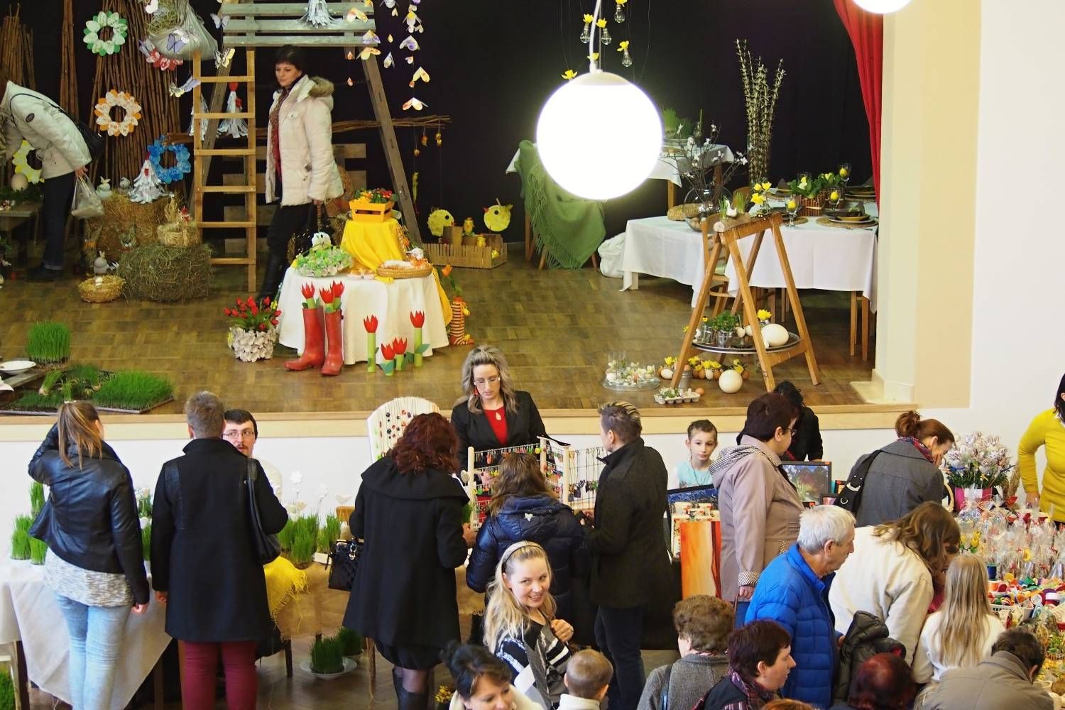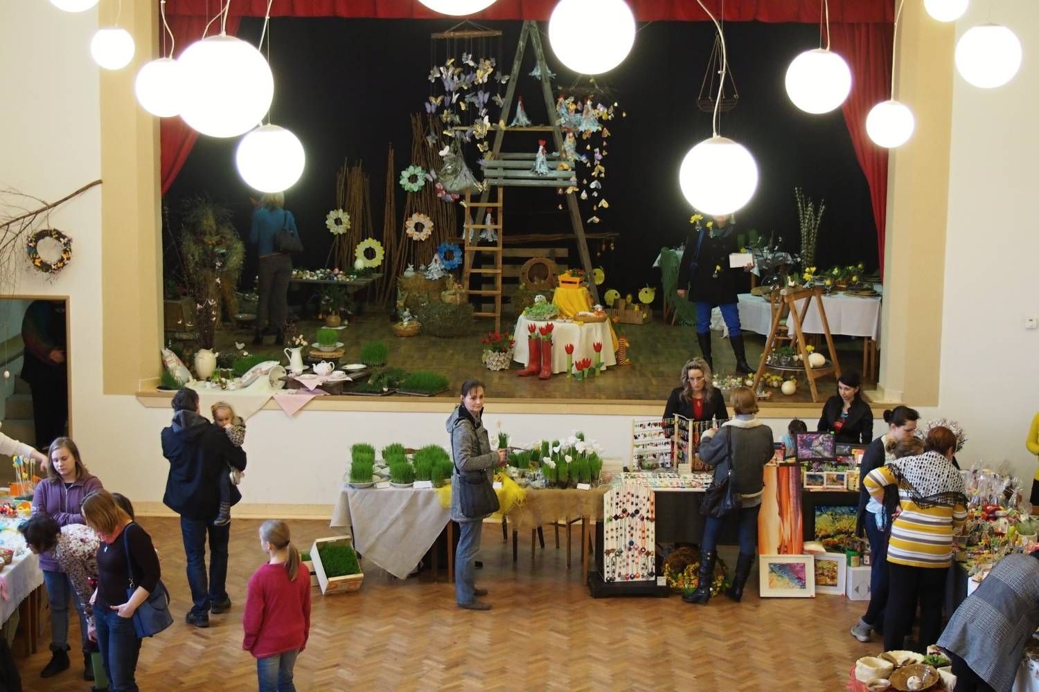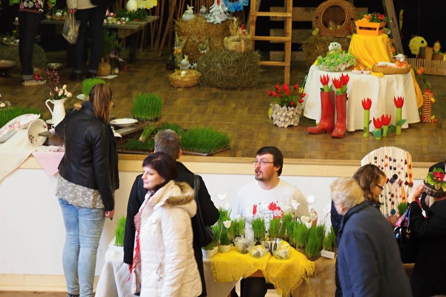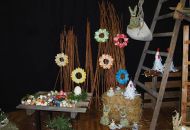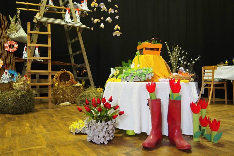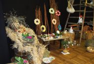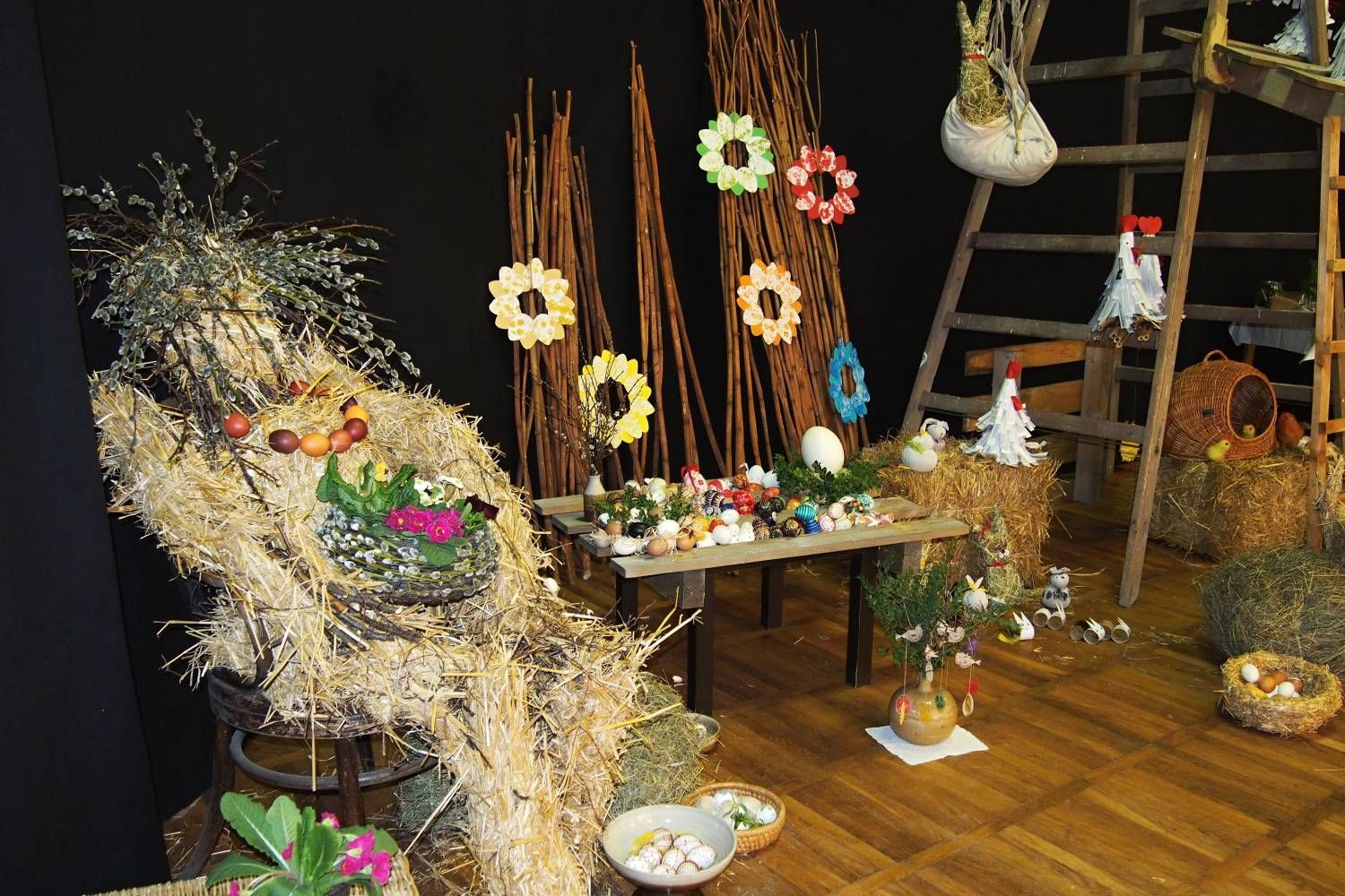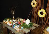 Pódium sokolovny hostilo velikonoční jarní výstavu. Při vstupu na jeviště jsme míjeli Moranu, bohyni zimy a stáří našich slovanských předků. Symbolizovala odchod zimy. Na začátku výstavy seděla již na svém trůnu Vesna, slovanská bohyně jara a mládí. Místo vlasů měla kočičky, kolem krku náhrdelník z barevných výfuků vajec a v klíně držela košík plný květů. Po její levici byla dřevěná paleta zaplněná vejci zdobenými všemi možnými způsoby. Výstavě dominoval obří kurník zaplněný drůbeží z tvorby dětí místní mateřské školy. Jejich výrobky byly přítomny na celé výstavě. Okolo „slepičárny" byli zajíci ze sena. Hned vedle byla tabule nazvaná Ptačí zob. Talíře i sklenice byly zarostlé pšenicí, zbytek stolu zaplňovalo zrní a různá semínka, které zobali ptáci. Decentní sváteční tabule byla prostřena podle Marty Nagyové. Jedním z hlavních motivů byli letos motýli. Papíroví motýli z dílny Andrey Stehlíkové se třepotali zavěšeni na starém kole. Háčkování motýli Jany Boudové byli usazeni na třešňových větvích. V podání Boženky Sedlákové byla romantická Snídaně v trávě velmi vkusně slaďující jak moderní, tak starší prvky. Veliký zájem vzbudily zavěšené žárovky jako vázičky s květy narcisů, taktéž od Boženky. K vidění byly i vyhlášené paličkované ozdoby Stanislavy Čarkové, dále se na výstavě podílely Vendula Skryjová, Petra Jandová, Jana Stehlíková i starostka městyse Marie Smejkalová. „Každý rok si říkáme, že nemůžeme nic nového vymyslet, ale vždycky překvapíme i sami sebe," vyjádřila s k výstavě Boženka Sedláková, její hlavní tvůrkyně.