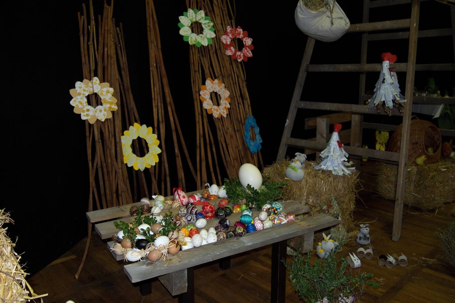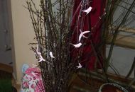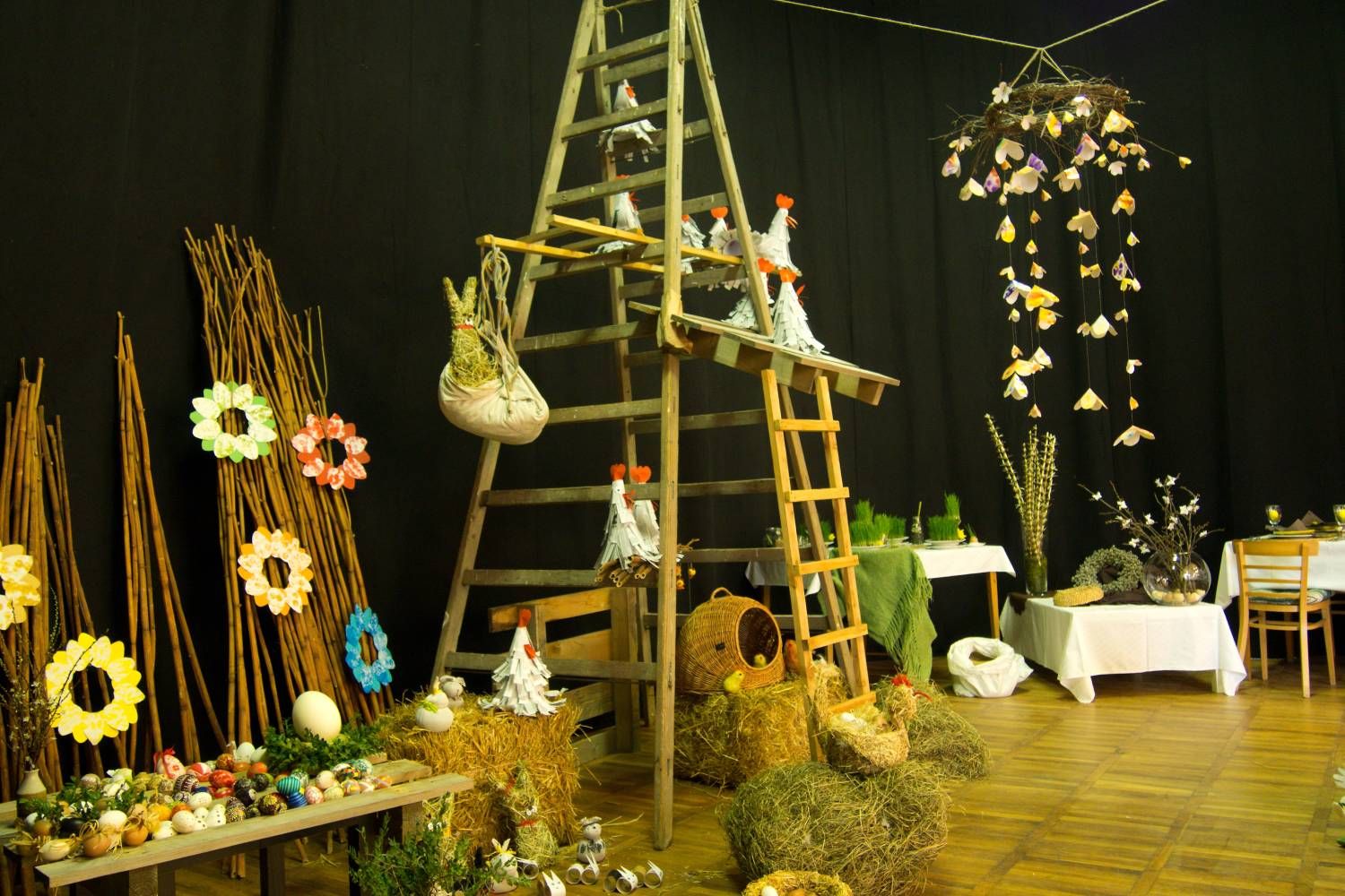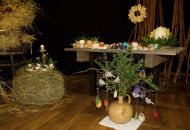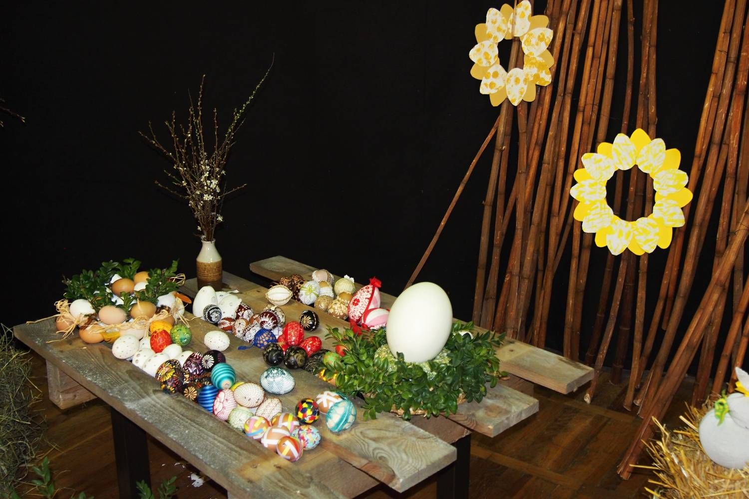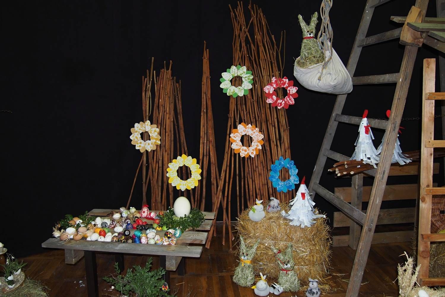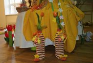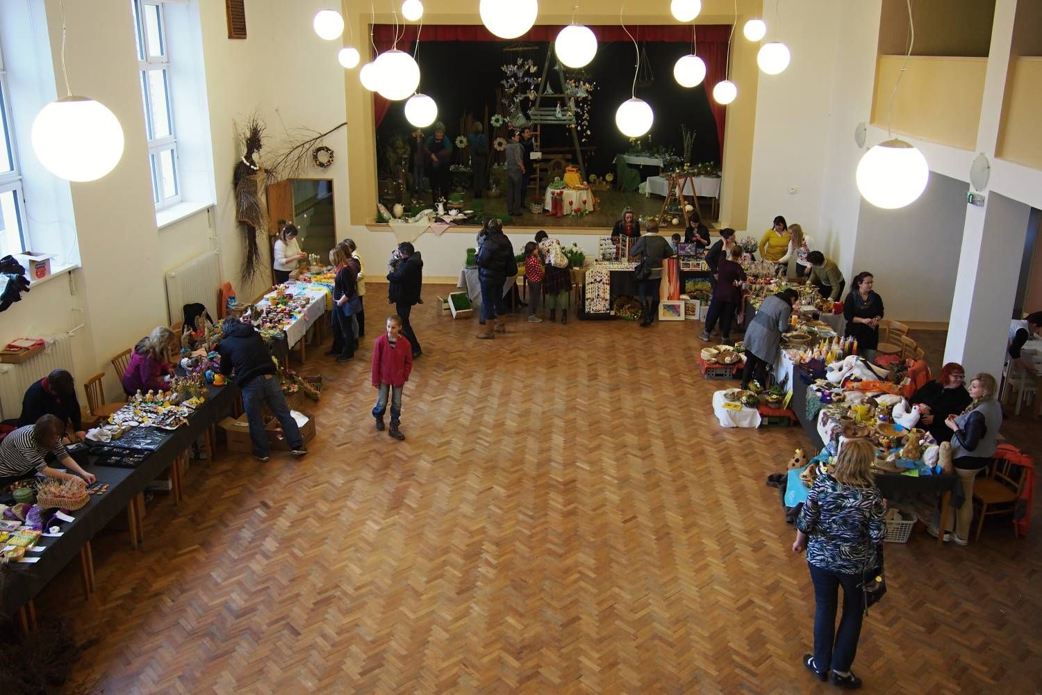 Pódium sokolovny hostilo velikonoční jarní výstavu. Při vstupu na jeviště jsme míjeli Moranu, bohyni zimy a stáří našich slovanských předků. Symbolizovala odchod zimy. Na začátku výstavy seděla již na svém trůnu Vesna, slovanská bohyně jara a mládí. Místo vlasů měla kočičky, kolem krku náhrdelník z barevných výfuků vajec a v klíně držela košík plný květů. Po její levici byla dřevěná paleta zaplněná vejci zdobenými všemi možnými způsoby. Výstavě dominoval obří kurník zaplněný drůbeží z tvorby dětí místní mateřské školy. Jejich výrobky byly přítomny na celé výstavě. Okolo „slepičárny" byli zajíci ze sena. Hned vedle byla tabule nazvaná Ptačí zob. Talíře i sklenice byly zarostlé pšenicí, zbytek stolu zaplňovalo zrní a různá semínka, které zobali ptáci. Decentní sváteční tabule byla prostřena podle Marty Nagyové. Jedním z hlavních motivů byli letos motýli. Papíroví motýli z dílny Andrey Stehlíkové se třepotali zavěšeni na starém kole. Háčkování motýli Jany Boudové byli usazeni na třešňových větvích. V podání Boženky Sedlákové byla romantická Snídaně v trávě velmi vkusně slaďující jak moderní, tak starší prvky. Veliký zájem vzbudily zavěšené žárovky jako vázičky s květy narcisů, taktéž od Boženky. K vidění byly i vyhlášené paličkované ozdoby Stanislavy Čarkové, dále se na výstavě podílely Vendula Skryjová, Petra Jandová, Jana Stehlíková i starostka městyse Marie Smejkalová. „Každý rok si říkáme, že nemůžeme nic nového vymyslet, ale vždycky překvapíme i sami sebe," vyjádřila s k výstavě Boženka Sedláková, její hlavní tvůrkyně.