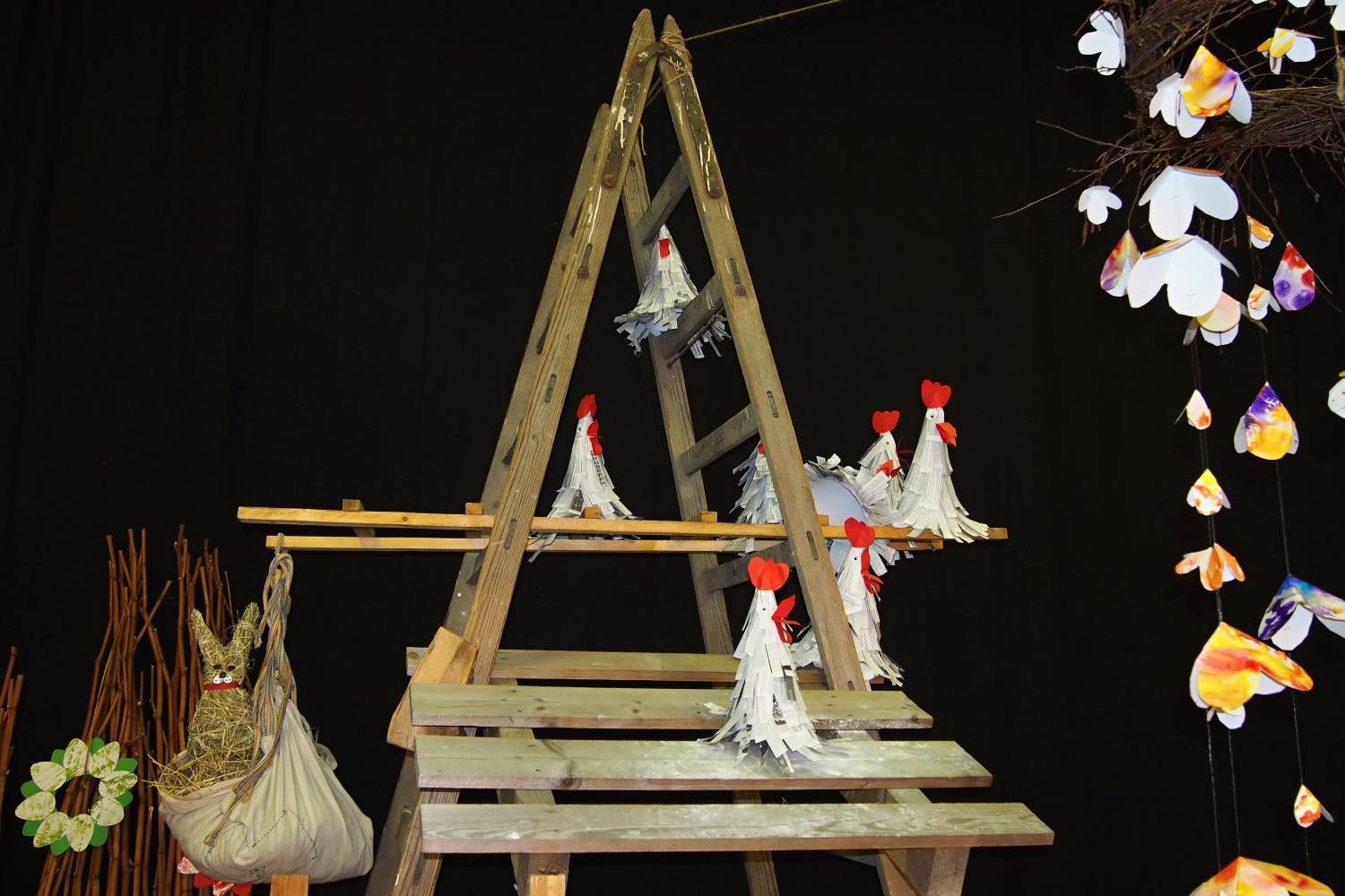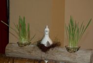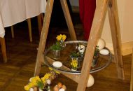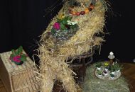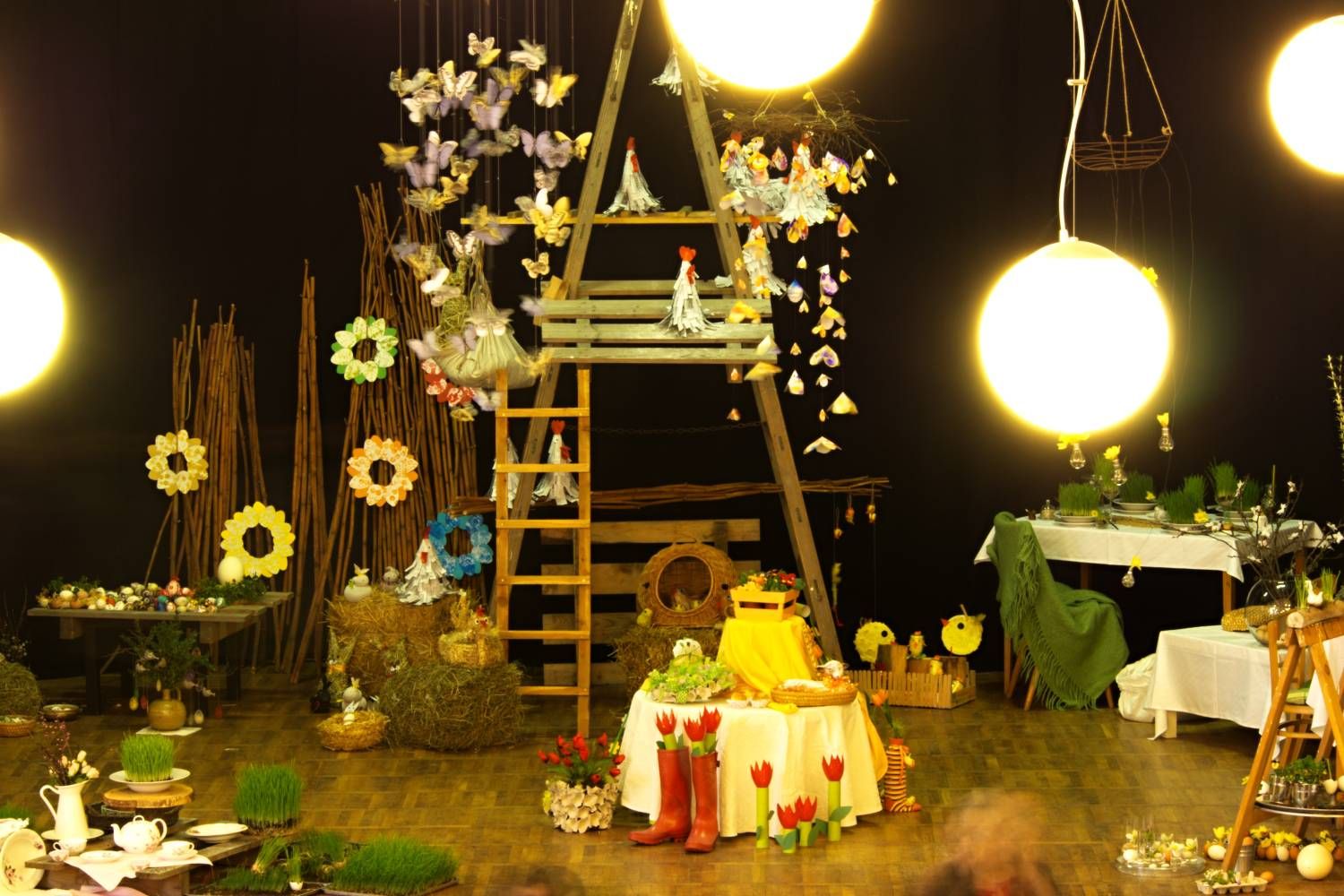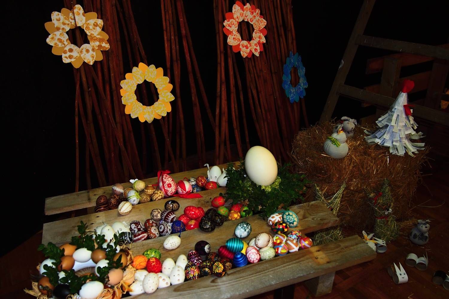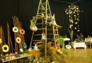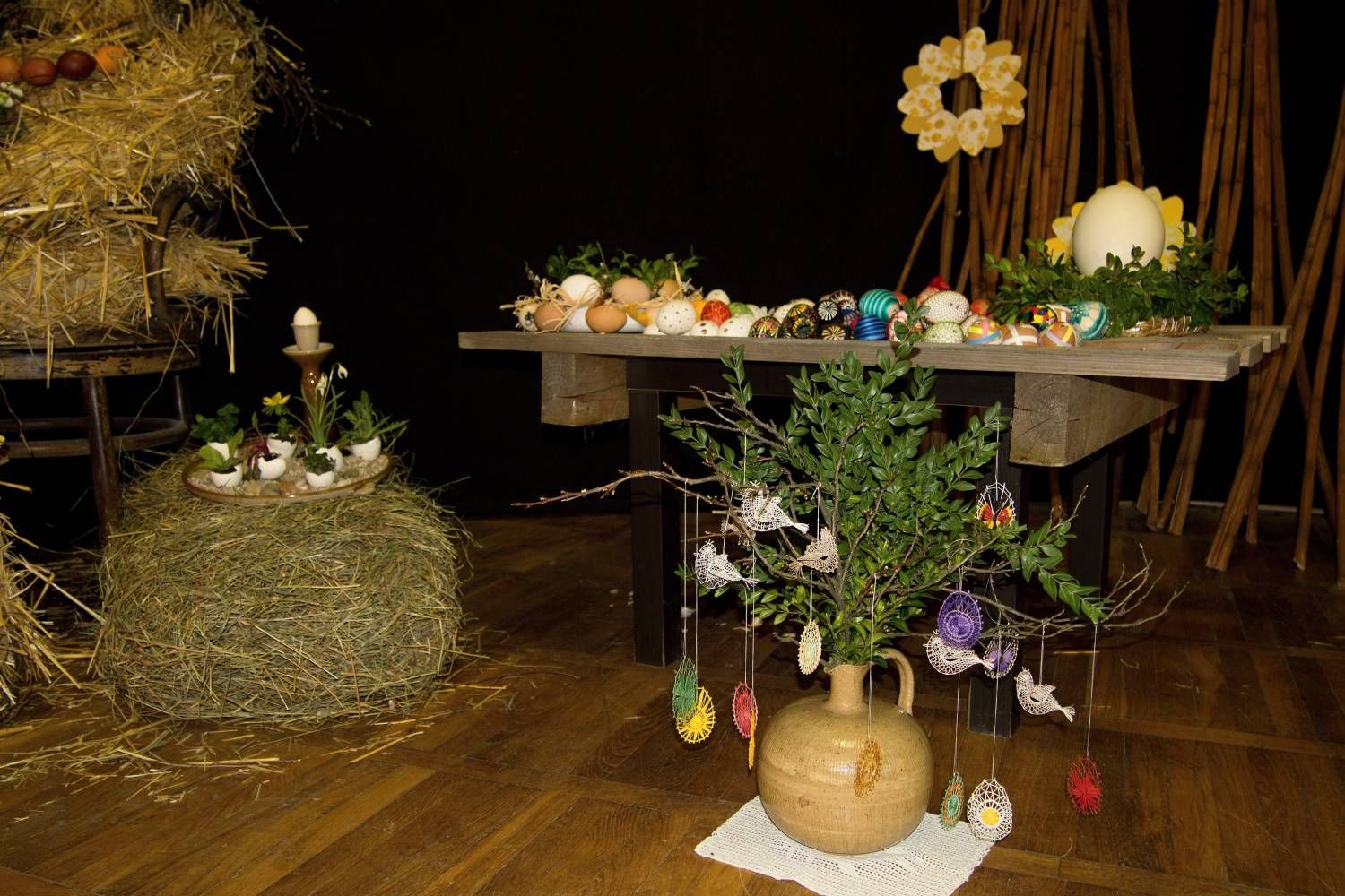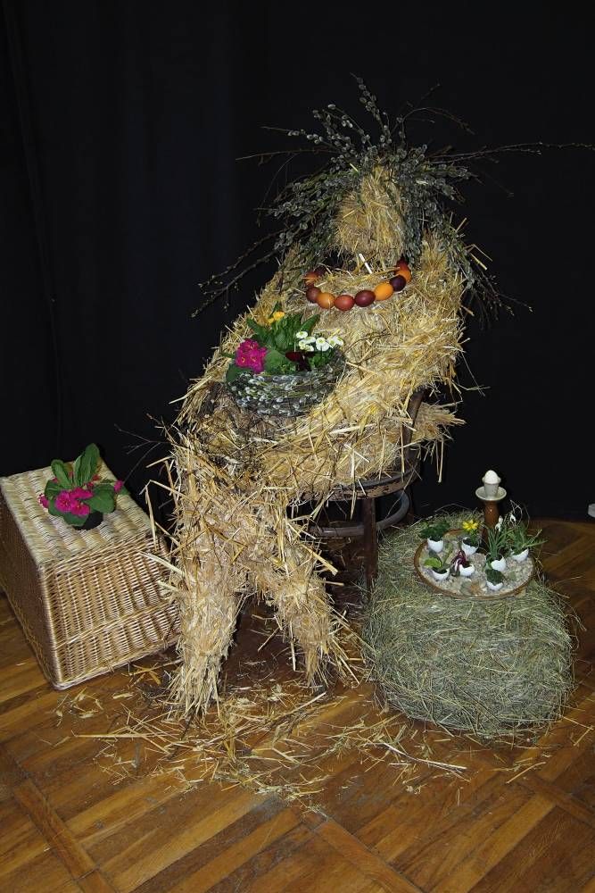 Pódium sokolovny hostilo velikonoční jarní výstavu. Při vstupu na jeviště jsme míjeli Moranu, bohyni zimy a stáří našich slovanských předků. Symbolizovala odchod zimy. Na začátku výstavy seděla již na svém trůnu Vesna, slovanská bohyně jara a mládí. Místo vlasů měla kočičky, kolem krku náhrdelník z barevných výfuků vajec a v klíně držela košík plný květů. Po její levici byla dřevěná paleta zaplněná vejci zdobenými všemi možnými způsoby. Výstavě dominoval obří kurník zaplněný drůbeží z tvorby dětí místní mateřské školy. Jejich výrobky byly přítomny na celé výstavě. Okolo „slepičárny" byli zajíci ze sena. Hned vedle byla tabule nazvaná Ptačí zob. Talíře i sklenice byly zarostlé pšenicí, zbytek stolu zaplňovalo zrní a různá semínka, které zobali ptáci. Decentní sváteční tabule byla prostřena podle Marty Nagyové. Jedním z hlavních motivů byli letos motýli. Papíroví motýli z dílny Andrey Stehlíkové se třepotali zavěšeni na starém kole. Háčkování motýli Jany Boudové byli usazeni na třešňových větvích. V podání Boženky Sedlákové byla romantická Snídaně v trávě velmi vkusně slaďující jak moderní, tak starší prvky. Veliký zájem vzbudily zavěšené žárovky jako vázičky s květy narcisů, taktéž od Boženky. K vidění byly i vyhlášené paličkované ozdoby Stanislavy Čarkové, dále se na výstavě podílely Vendula Skryjová, Petra Jandová, Jana Stehlíková i starostka městyse Marie Smejkalová. „Každý rok si říkáme, že nemůžeme nic nového vymyslet, ale vždycky překvapíme i sami sebe," vyjádřila s k výstavě Boženka Sedláková, její hlavní tvůrkyně.