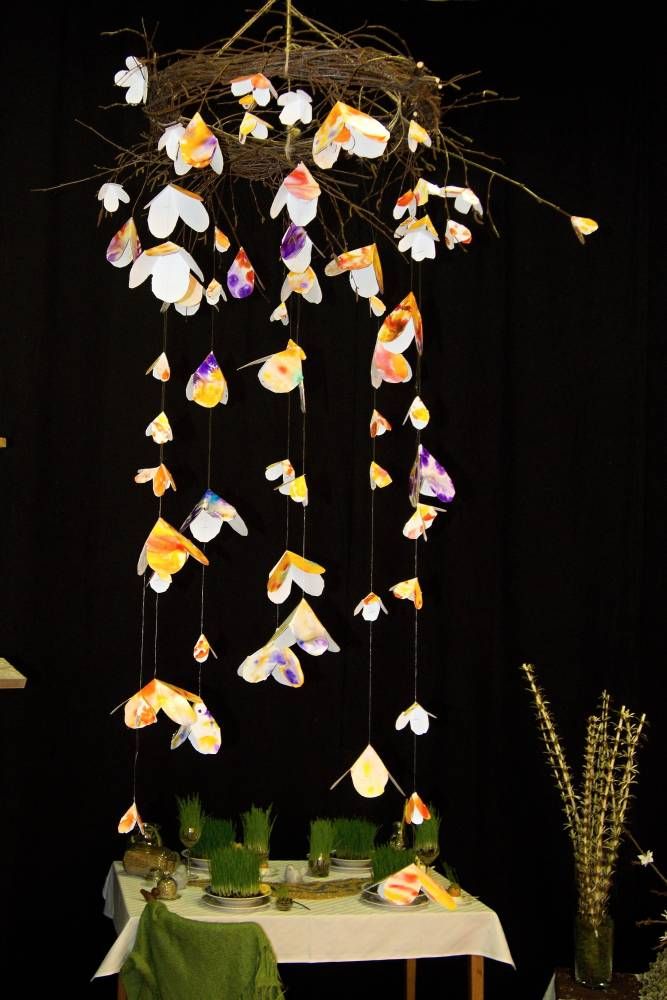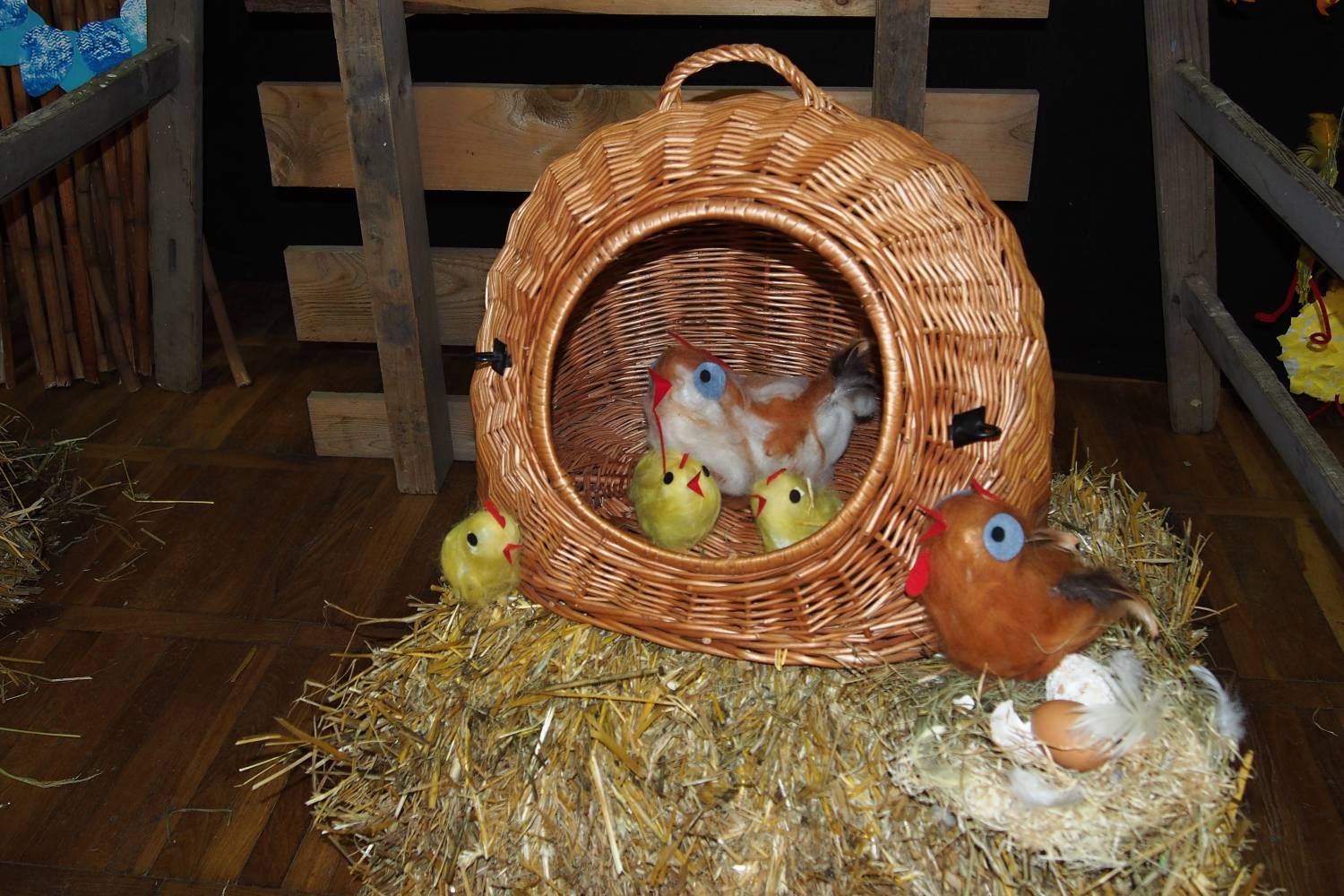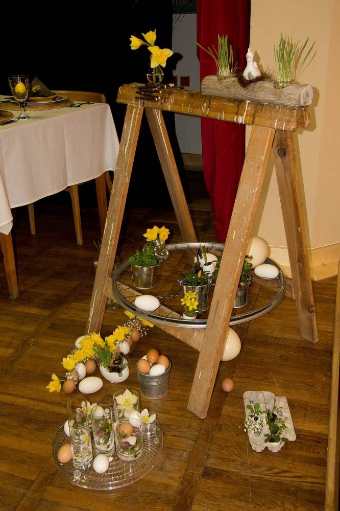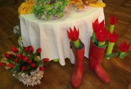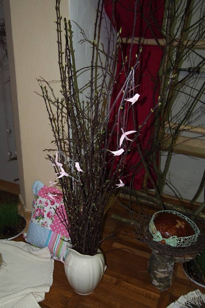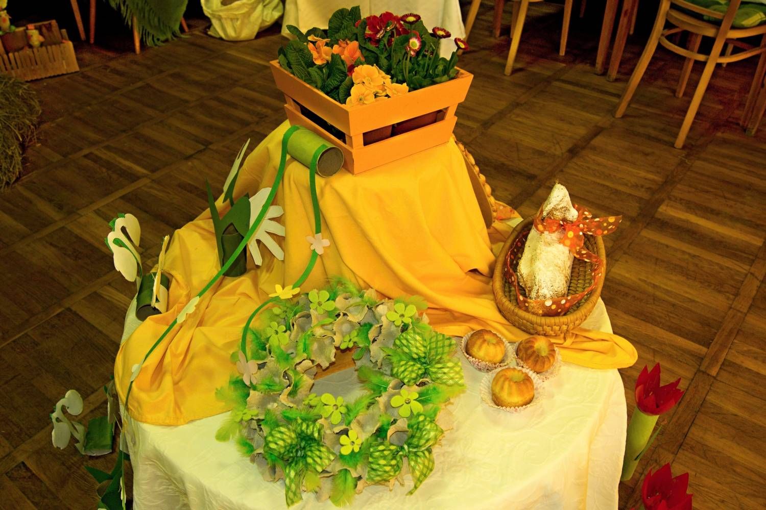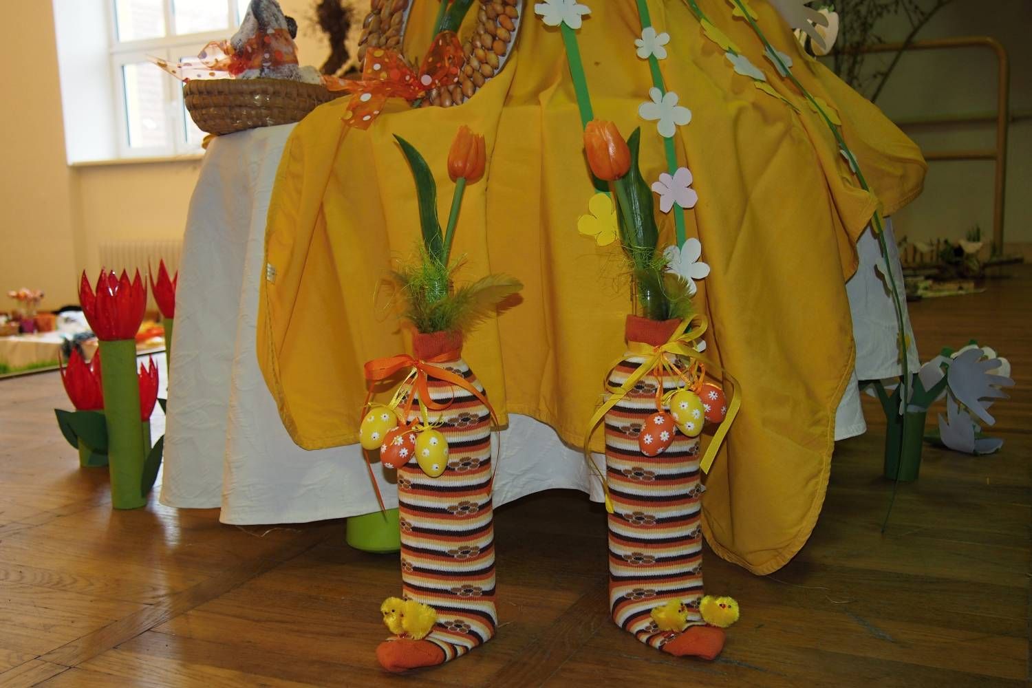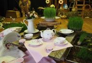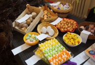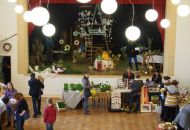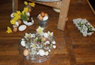 Pódium sokolovny hostilo velikonoční jarní výstavu. Při vstupu na jeviště jsme míjeli Moranu, bohyni zimy a stáří našich slovanských předků. Symbolizovala odchod zimy. Na začátku výstavy seděla již na svém trůnu Vesna, slovanská bohyně jara a mládí. Místo vlasů měla kočičky, kolem krku náhrdelník z barevných výfuků vajec a v klíně držela košík plný květů. Po její levici byla dřevěná paleta zaplněná vejci zdobenými všemi možnými způsoby. Výstavě dominoval obří kurník zaplněný drůbeží z tvorby dětí místní mateřské školy. Jejich výrobky byly přítomny na celé výstavě. Okolo „slepičárny" byli zajíci ze sena. Hned vedle byla tabule nazvaná Ptačí zob. Talíře i sklenice byly zarostlé pšenicí, zbytek stolu zaplňovalo zrní a různá semínka, které zobali ptáci. Decentní sváteční tabule byla prostřena podle Marty Nagyové. Jedním z hlavních motivů byli letos motýli. Papíroví motýli z dílny Andrey Stehlíkové se třepotali zavěšeni na starém kole. Háčkování motýli Jany Boudové byli usazeni na třešňových větvích. V podání Boženky Sedlákové byla romantická Snídaně v trávě velmi vkusně slaďující jak moderní, tak starší prvky. Veliký zájem vzbudily zavěšené žárovky jako vázičky s květy narcisů, taktéž od Boženky. K vidění byly i vyhlášené paličkované ozdoby Stanislavy Čarkové, dále se na výstavě podílely Vendula Skryjová, Petra Jandová, Jana Stehlíková i starostka městyse Marie Smejkalová. „Každý rok si říkáme, že nemůžeme nic nového vymyslet, ale vždycky překvapíme i sami sebe," vyjádřila s k výstavě Boženka Sedláková, její hlavní tvůrkyně.