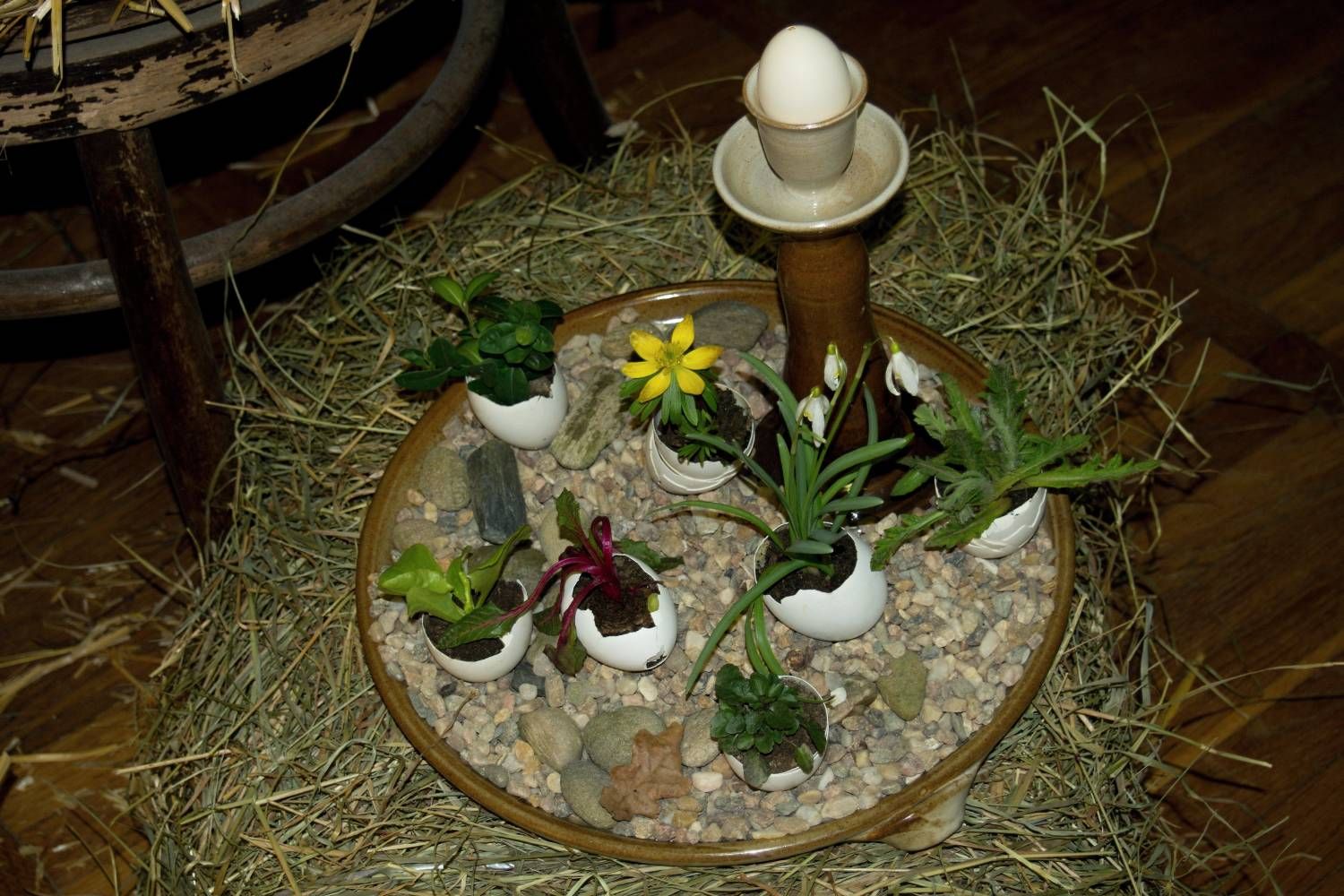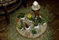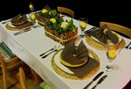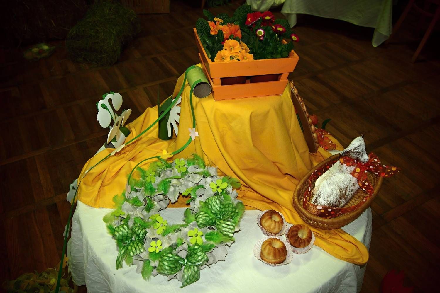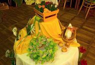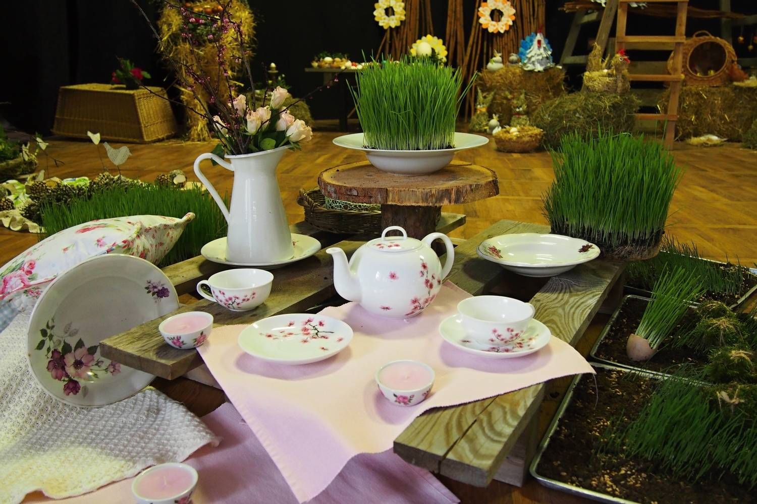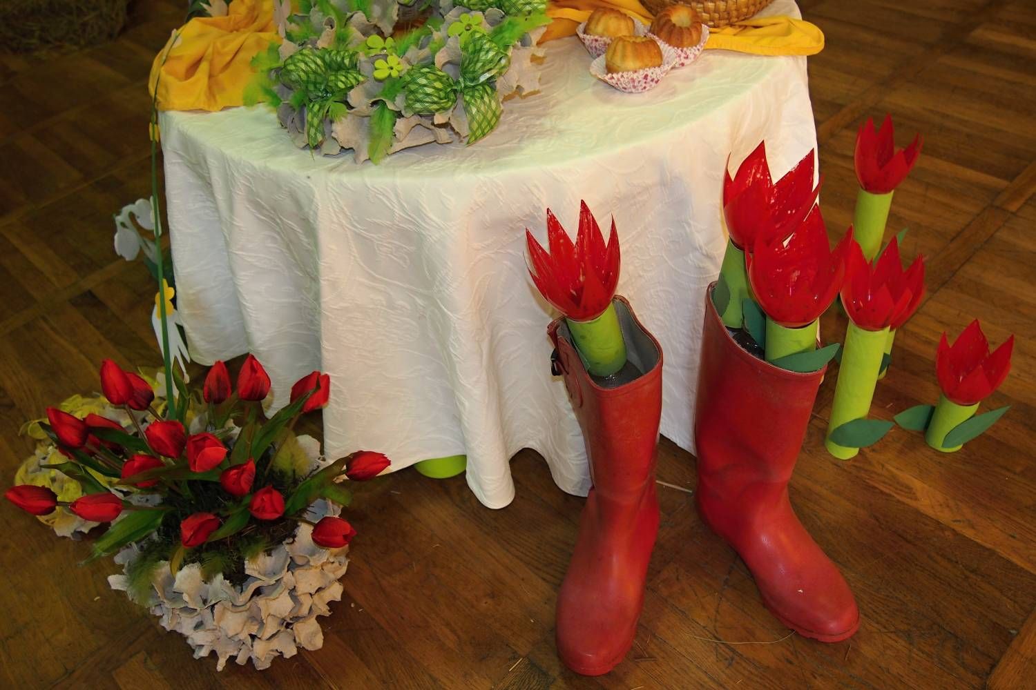 Pódium sokolovny hostilo velikonoční jarní výstavu. Při vstupu na jeviště jsme míjeli Moranu, bohyni zimy a stáří našich slovanských předků. Symbolizovala odchod zimy. Na začátku výstavy seděla již na svém trůnu Vesna, slovanská bohyně jara a mládí. Místo vlasů měla kočičky, kolem krku náhrdelník z barevných výfuků vajec a v klíně držela košík plný květů. Po její levici byla dřevěná paleta zaplněná vejci zdobenými všemi možnými způsoby. Výstavě dominoval obří kurník zaplněný drůbeží z tvorby dětí místní mateřské školy. Jejich výrobky byly přítomny na celé výstavě. Okolo „slepičárny" byli zajíci ze sena. Hned vedle byla tabule nazvaná Ptačí zob. Talíře i sklenice byly zarostlé pšenicí, zbytek stolu zaplňovalo zrní a různá semínka, které zobali ptáci. Decentní sváteční tabule byla prostřena podle Marty Nagyové. Jedním z hlavních motivů byli letos motýli. Papíroví motýli z dílny Andrey Stehlíkové se třepotali zavěšeni na starém kole. Háčkování motýli Jany Boudové byli usazeni na třešňových větvích. V podání Boženky Sedlákové byla romantická Snídaně v trávě velmi vkusně slaďující jak moderní, tak starší prvky. Veliký zájem vzbudily zavěšené žárovky jako vázičky s květy narcisů, taktéž od Boženky. K vidění byly i vyhlášené paličkované ozdoby Stanislavy Čarkové, dále se na výstavě podílely Vendula Skryjová, Petra Jandová, Jana Stehlíková i starostka městyse Marie Smejkalová. „Každý rok si říkáme, že nemůžeme nic nového vymyslet, ale vždycky překvapíme i sami sebe," vyjádřila s k výstavě Boženka Sedláková, její hlavní tvůrkyně.