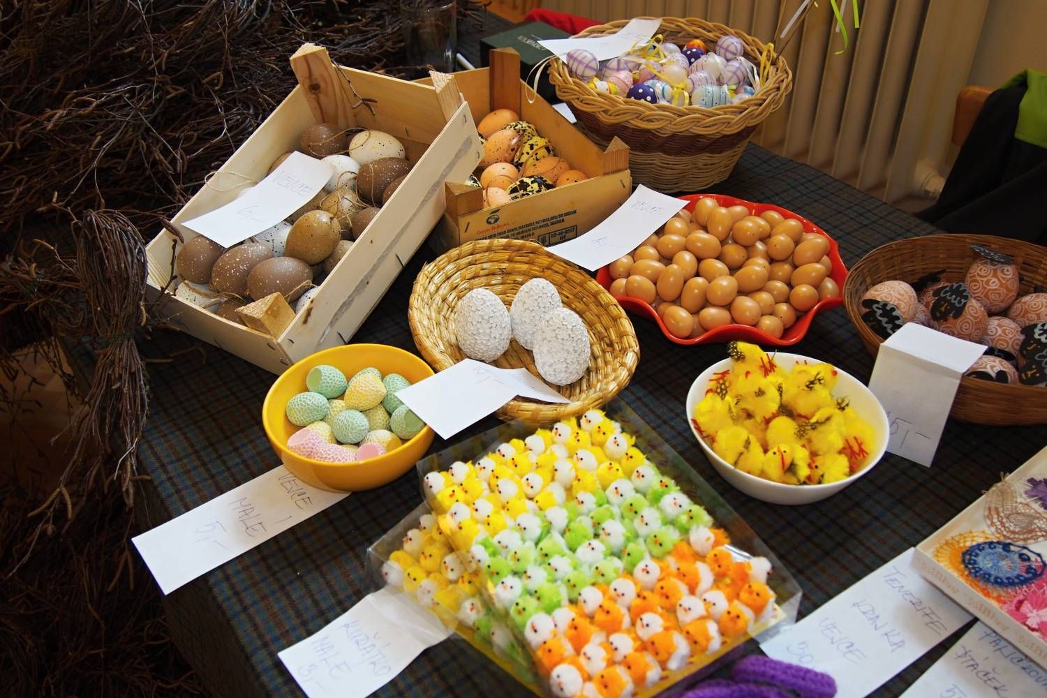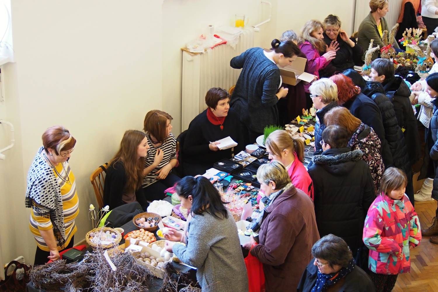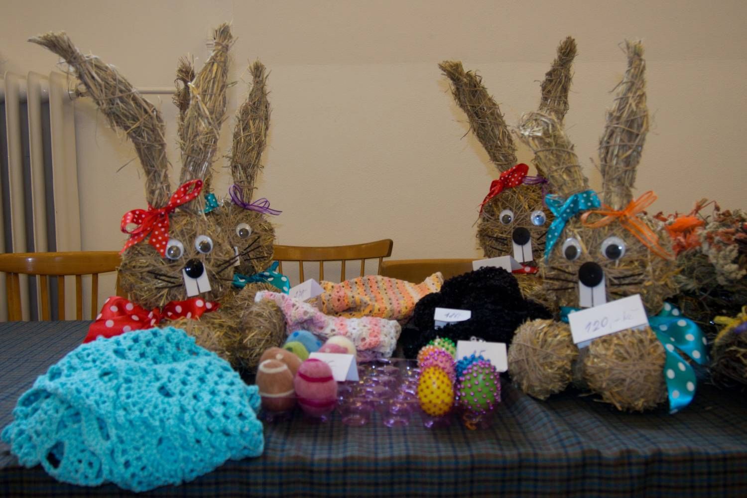 Místní sokolovna se odpoledne zaplnila prodejci nabízejícími různé rukodělné výrobky. Bylo jich ovšem o něco méně než minulý rok. „Několik vystavovatelů se nám omluvilo s tím, že vše již prodali na výstavách v Dobré Vodě a Velkém Meziříčí," říká Radomíra Schmidová, jedna z hlavních organizátorů jarmarku. I přesto jsme na stáncích v sále mohli obdivovat i zakoupit nejrůznější šperky, velikonoční osení, výrobky pletené, háčkované i paličkované, skleněné vitráže, všelijak zdobená vajíčka, obrazy i s léčivou silou, zajíce ze sena, plyšové slepice a kuřata, lízátka a mnohé další. Největší úspěch pravděpodobně slavily velikonočně zdobené muffiny, po kterých se doslova jen zaprášilo. Své stánky tu měly i Domov Kamélie Křižanov a Dětské středisko Březejc.