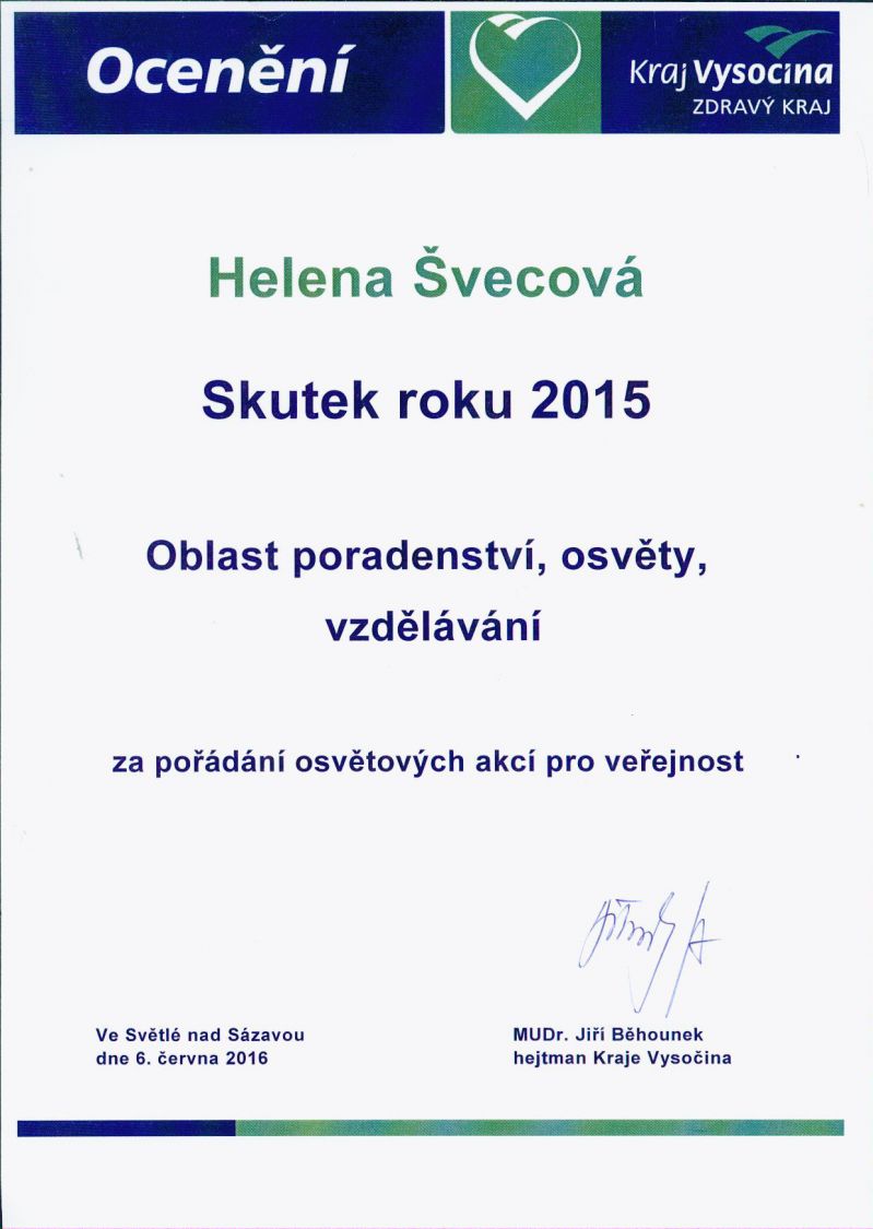 Předsedkyně Vlastivědné a genealogické společnosti při Jupiter clubu Helena Švecová je držitelkou krajského ocenění Skutek roku 2015. Cenu převzala na včerejším slavnostním večeru na zámku ve Světlé nad Sázavou.
