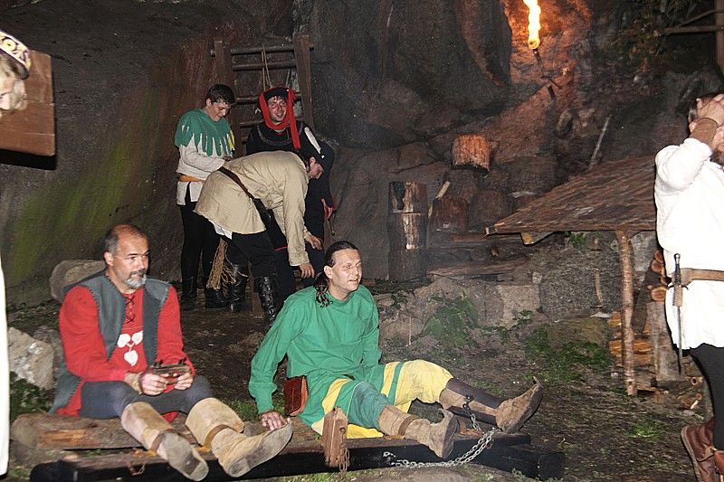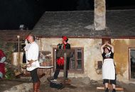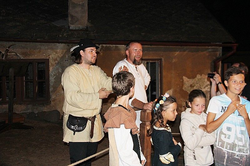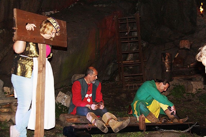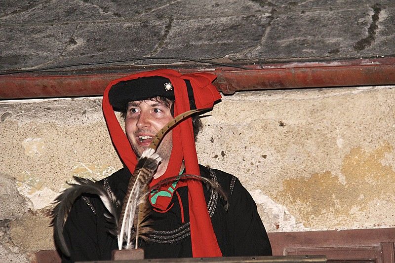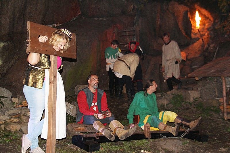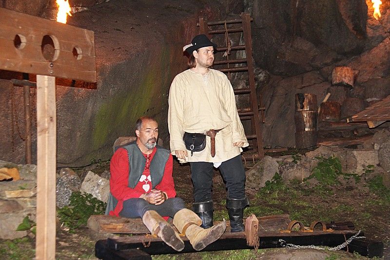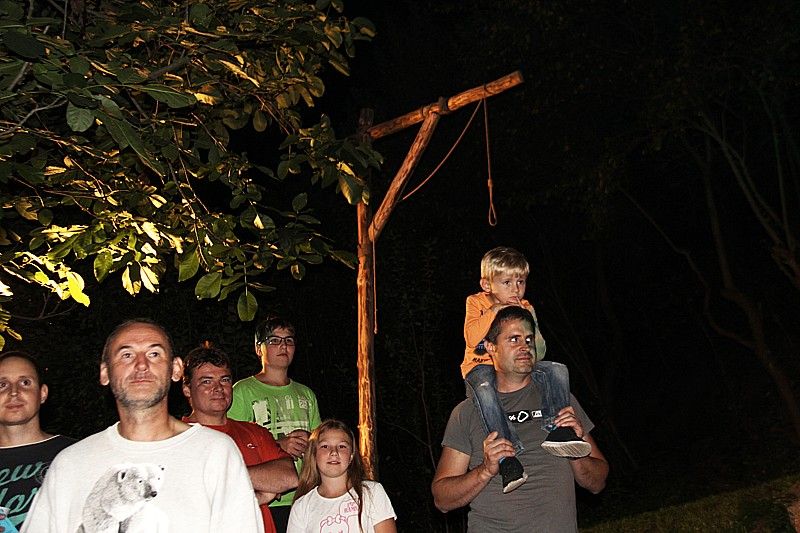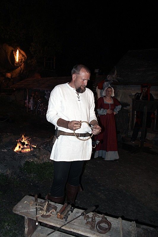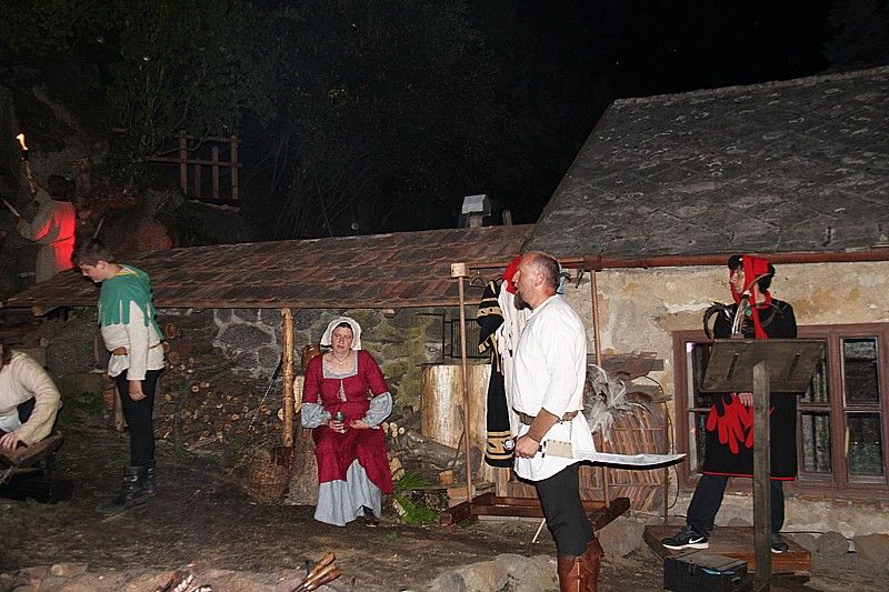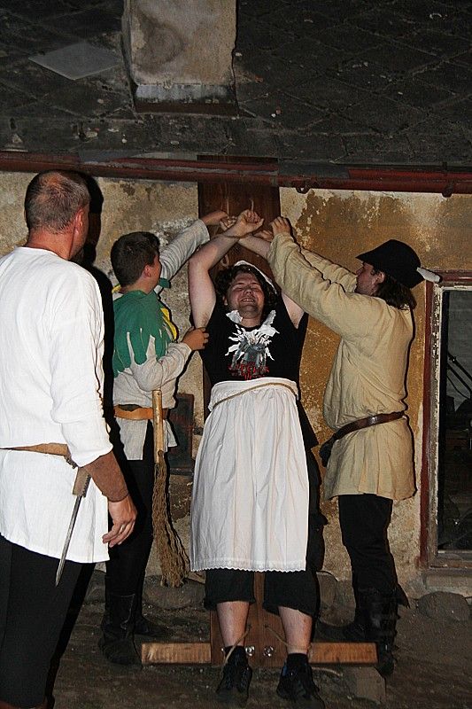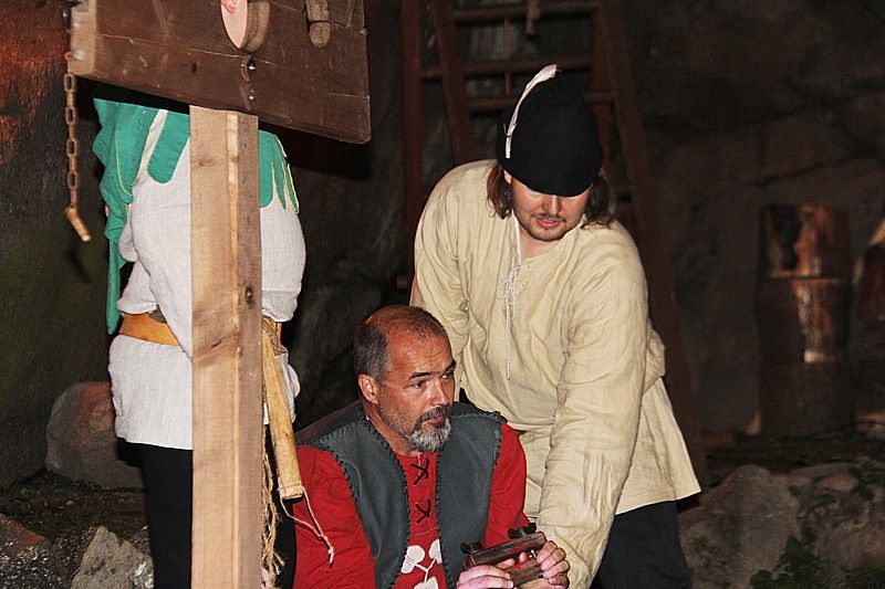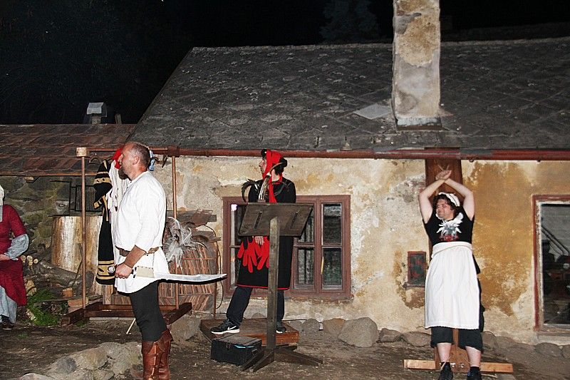 Venku pak na návštěvníky čekalo divadelní vystoupení s ukázkami mučení, do kterého byli vtaženi i tři přihlížející z řad diváků. Tentokrát se ve hraném příběhu o přepadení místní katovny méně šermovalo a bojovalo, ale více žertovalo, ještě více mučilo, ale nakonec všichni ze spárů kata vyvázli živí...