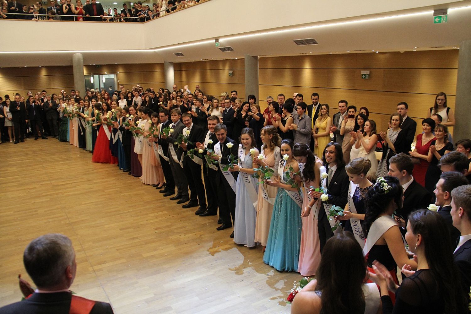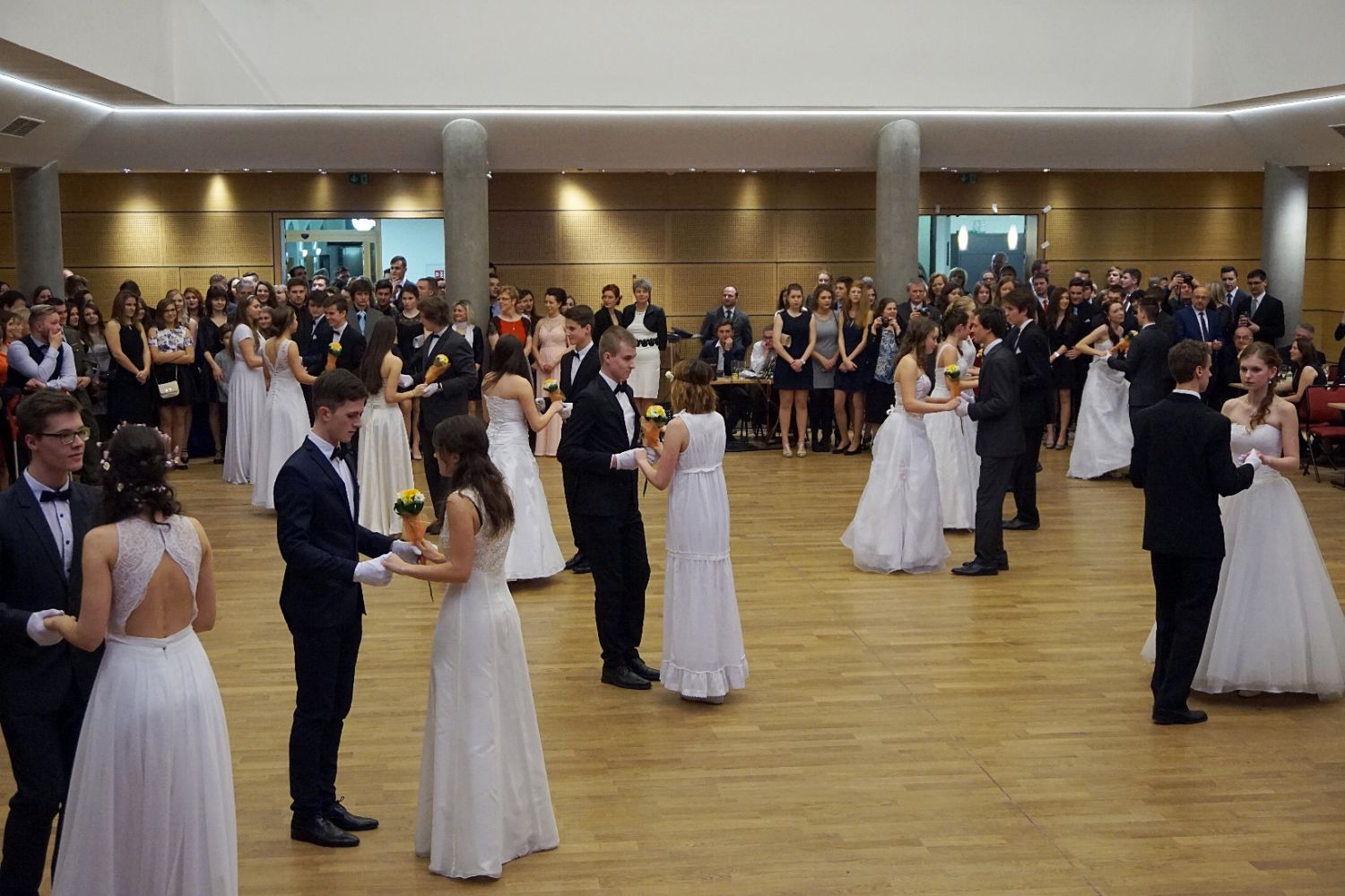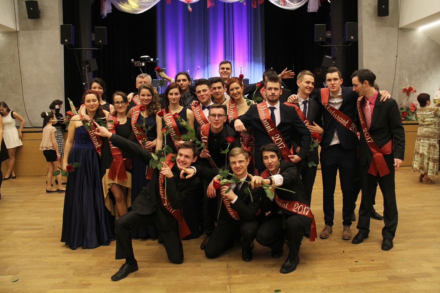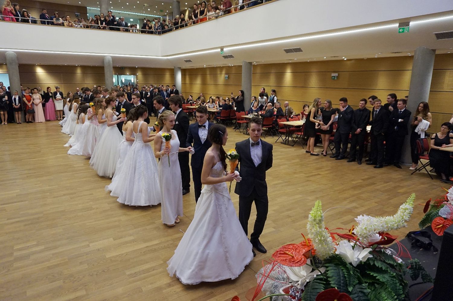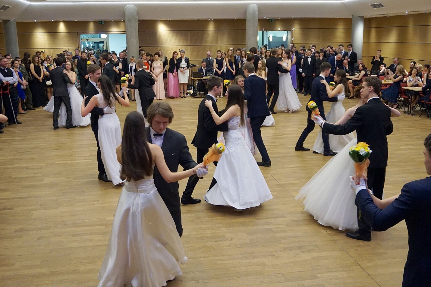 Slavnostní zahájení, polonéza studentů druhých ročníků, která měla velký úspěch, taneční vystoupení a hlavně šerpování maturantů, takový byl program studentského plesu gymnázia v sobotu 11. února. Třídní učitelé 8. A Petr Vrána a 4. C Hana Turinská pasovali studenty svých tříd na maturanty za přihlížení jejich rodičů, prarodičů, sourozenců a kamarádů. Zněla hudba a na maturanty létaly mince pro štěstí.