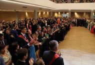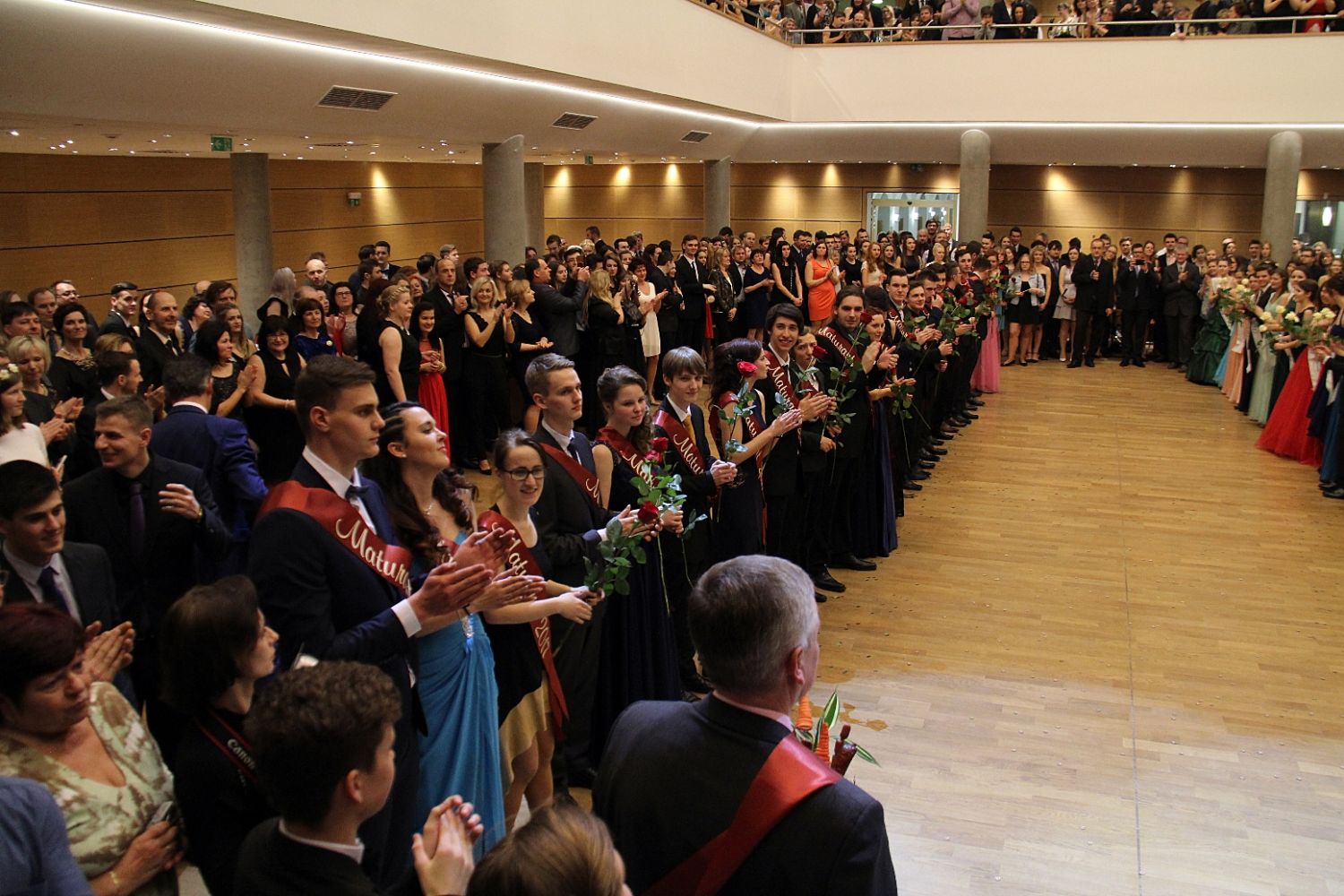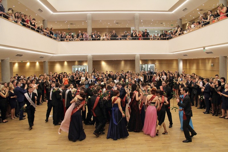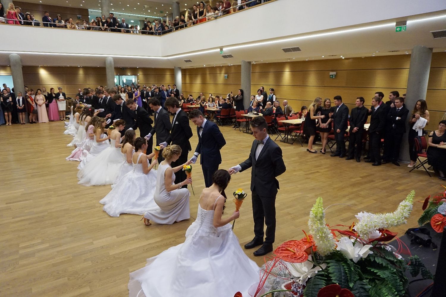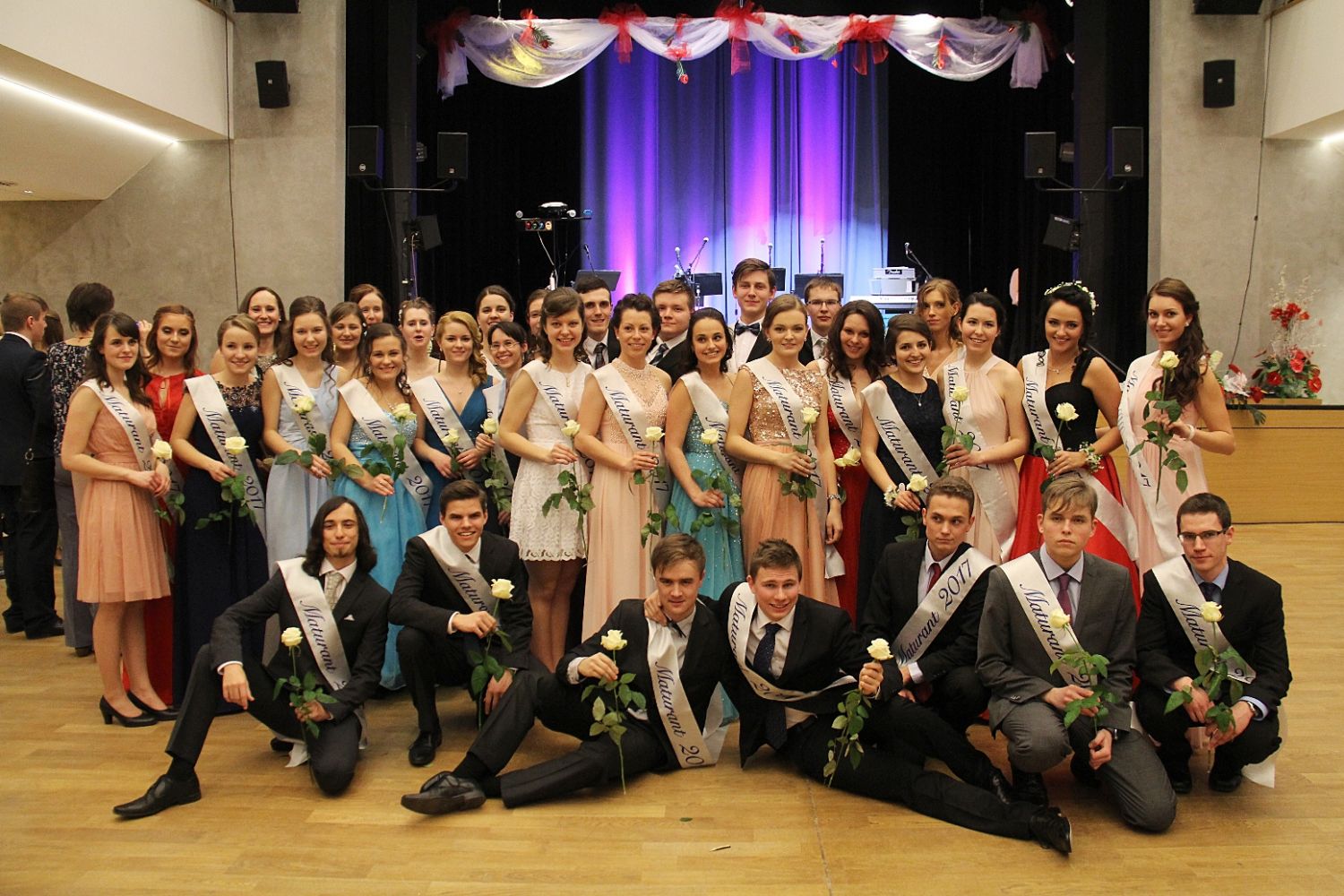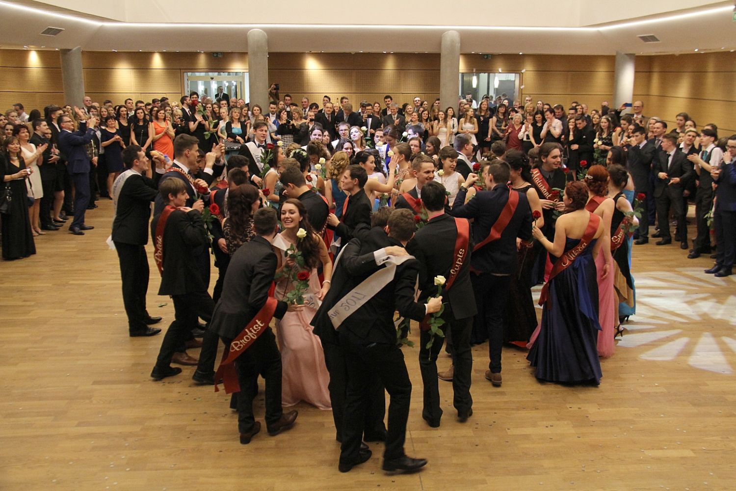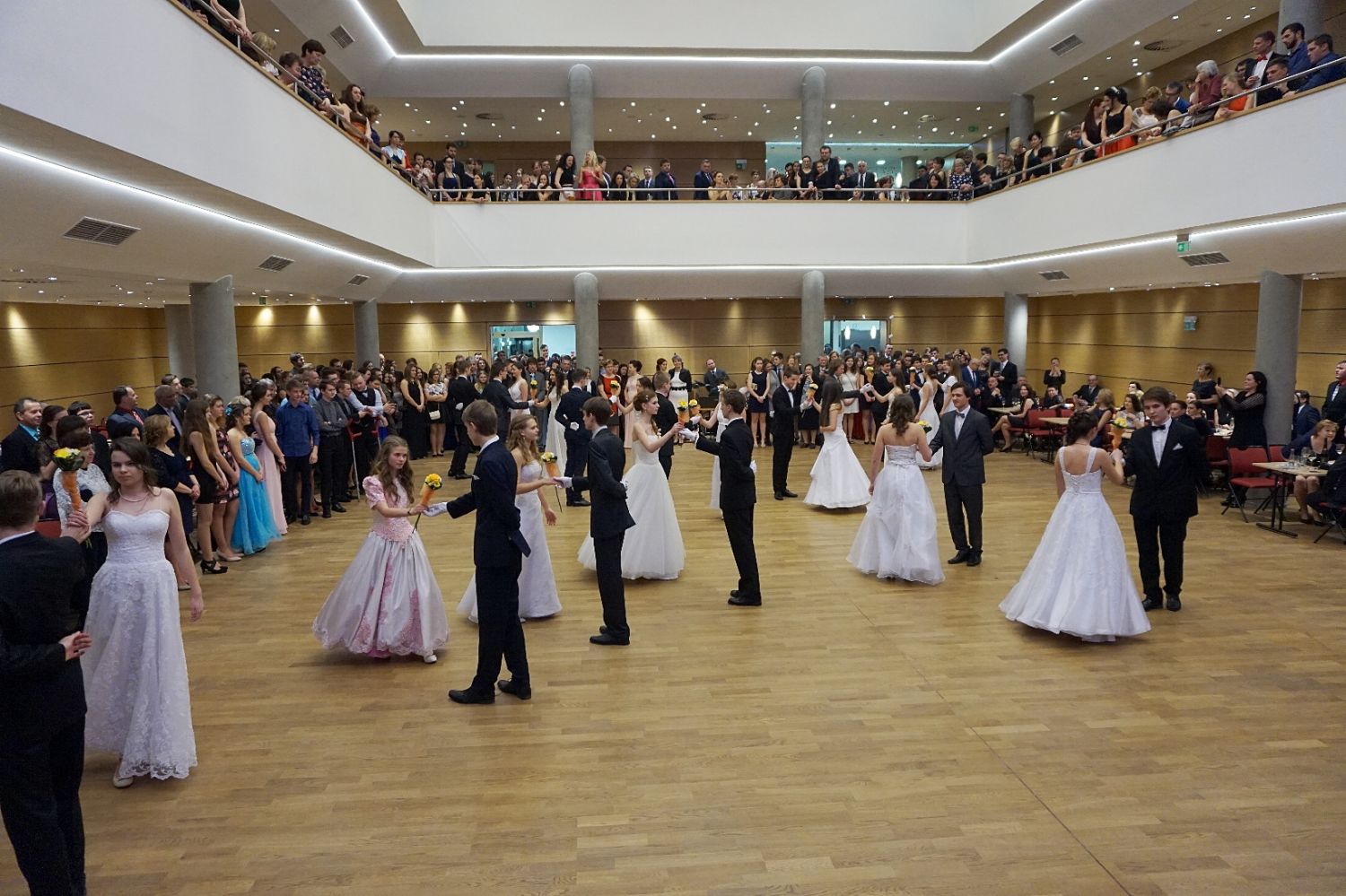 Slavnostní zahájení, polonéza studentů druhých ročníků, která měla velký úspěch, taneční vystoupení a hlavně šerpování maturantů, takový byl program studentského plesu gymnázia v sobotu 11. února. Třídní učitelé 8. A Petr Vrána a 4. C Hana Turinská pasovali studenty svých tříd na maturanty za přihlížení jejich rodičů, prarodičů, sourozenců a kamarádů. Zněla hudba a na maturanty létaly mince pro štěstí.