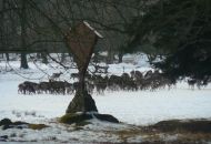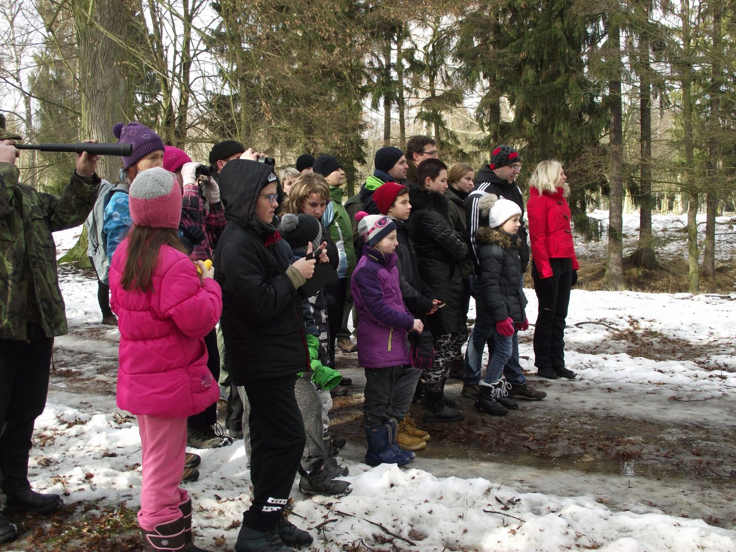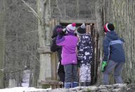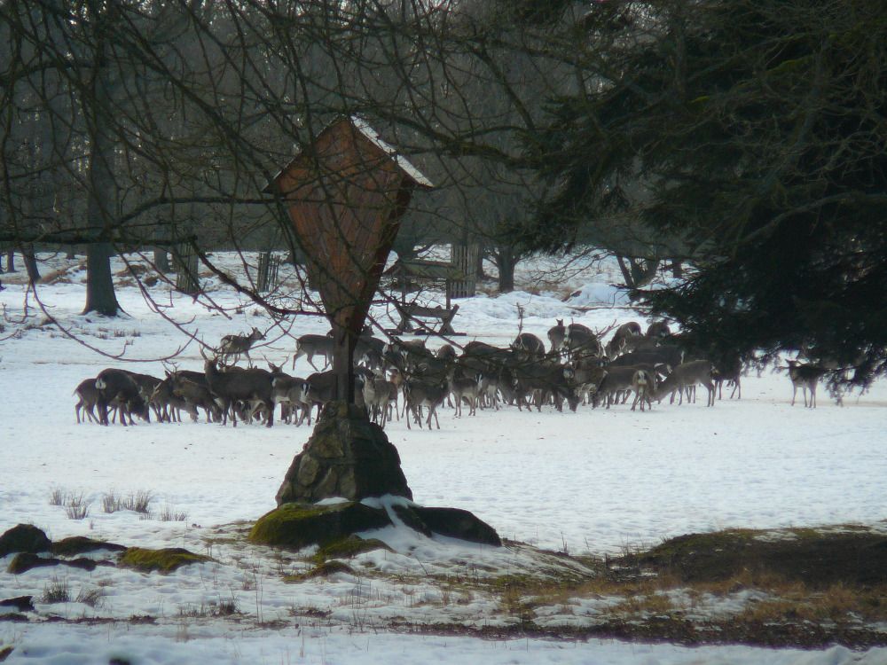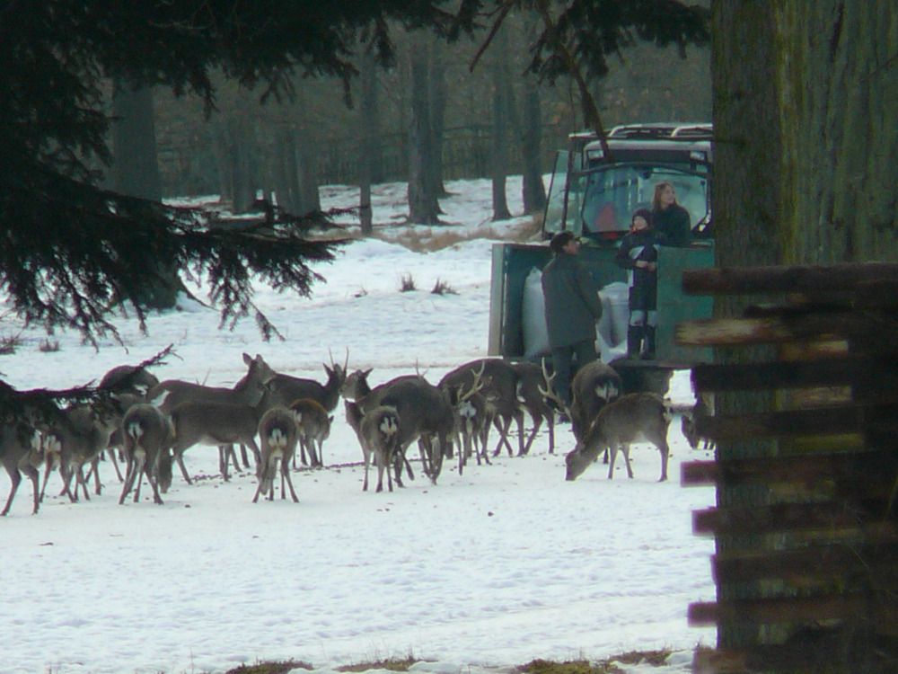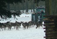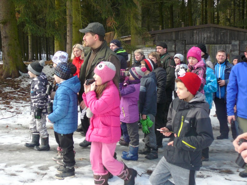 Po té se skupinka odebrala k prvnímu z celkem tří krmišt, které byly na trase. Letošní novinkou byl traktor, jel před účastníky a postupně zakrmoval. "Loni jsme šli na dvě skupinky a vzájemně si zvěř naháněli. S traktorem je to lepší, zvěř vidíme delší dobu, není tak plachá a hlavně sníh pozorování hodně pomáhá, vše je na něm dobře vidět," spokojeně podotkla Marie Štěpánková z městského úřadu. Zvířata, která jsou na zvuk motoru zvyklá, se postupně sbíhala a poměrně dlouho na krmišti pobyla. Všichni, i ti, kteří se na zledovělých cestách zdrželi, si tak mohli početná stáda důkladně prohlédnout. Děti se dobře bavily při pokusech dostat se ke zvěři co nejblíže schováváním za stromy. Prozkoumaly i krmná zařízení a závěrem byly odměněny lízátky a bonbonky.