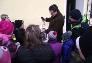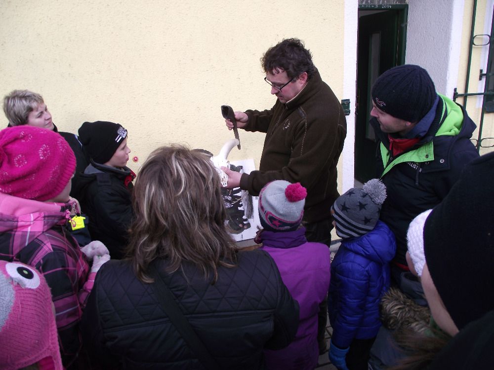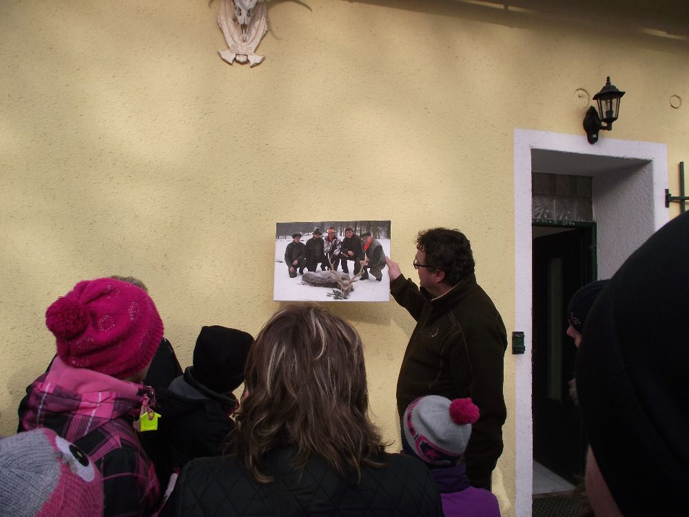 Dotazy, které ing. Fňukal během procházky zodpověděl, se týkaly krmení i odlovu zvěře. "V zimním období krmíme každý den, je to potřeba. Krmí se obilí, řepa, seno, do balíků děláme jetelovou senáž a nakupujeme kaštany," uvedl. "Zvěř k nám jezdí lovit lovci z celého světa, ročně odstřílíme zhruba 120 kusů zvěře. Tedy asi roční přírůstek. Loni se tu podařilo ulovit nejlepšího jelena siku v historii obory." Toho pak ukázal na fotografii a na ní také vysvětloval dětem rozdíl mezi jelením a mufloním parožím. Mufloní toulce rostou celý život a oddělit se dají až po preparaci mufloní hlavy.
