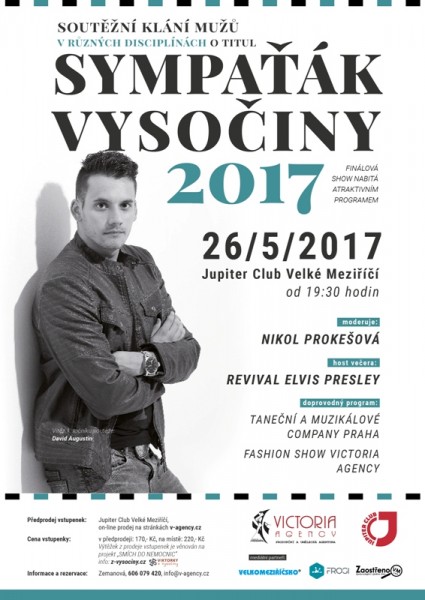 Sympaťák Vysočiny je celorepubliková soutěž pro muže od 17 let, kterou pořádá umělecká agentura Victoria Agency již druhým rokem. Nejde v ní o krásu, ale o sympatie a vtip. Z přihlášených vybere porota, jejímž předsedou bude opět velkomeziříčský starosta Radovan Necid, dvanáct finalistů, kteří se předvedou divákům na galavečeru v Jupiter clubu.