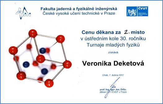 Studentka 2. ročníku Gymnázia Velké Meziříčí, Veronika Deketová, vybojovala spolu se svým týmem 2. místo v celostátním kole Turnaje mladých fyziků v Chebu.