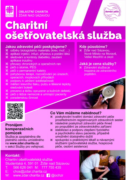 Registrované zdravotní sestry Charitní ošetřovatelské služby Oblastní charity Žďár nad Sázavou, poskytují odbornou zdravotní péči lidem, kteří z důvodu stáří, nemoci či zdravotního postižení nejsou soběstační. „Pečujeme o pacienty v domácím prostředí na základě doporučení ošetřujícího lékaře a ve spolupráci s rodinnými příslušníky nepřetržitě sedm dní v týdnu, abychom jim umožnili prožití důstojného života mezi svými blízkými,“ vysvětluje Barbora Hadrous, vrchní sestra žďárské Charity.
