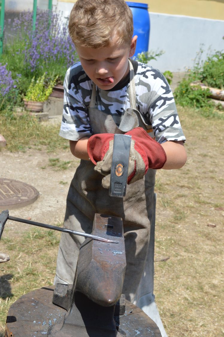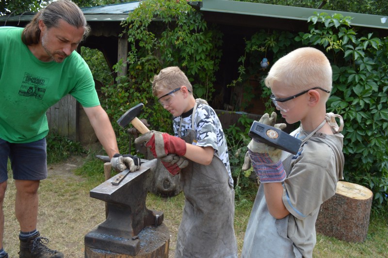 A opravdu se nejedná o nic jenom jako. Na trávníku za budovou bývalé lesovny jsou kovadliny, výhně, kladiva, kleště a zkušený trpělivý kovář, který děti učí, jak na to. Rozhodně totiž nejde jen o to mlátit kladivem do kusu železa a drsně se tvářit. Děti se naučí, jak železo správně nahřát, jak ho popadnout do kleští a jak do něj bušit, aby z něj nakonec bylo něco pěkného a jak si navzájem pomáhat. Protože kovářství je v podstatě týmová práce. Vzpomeňte si na pohádky. Vždycky tam byl kovář a jeho syn, nebo alespoň učeň.