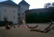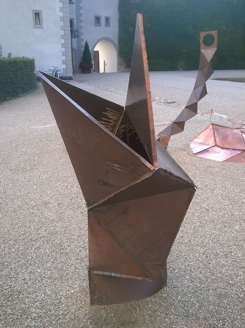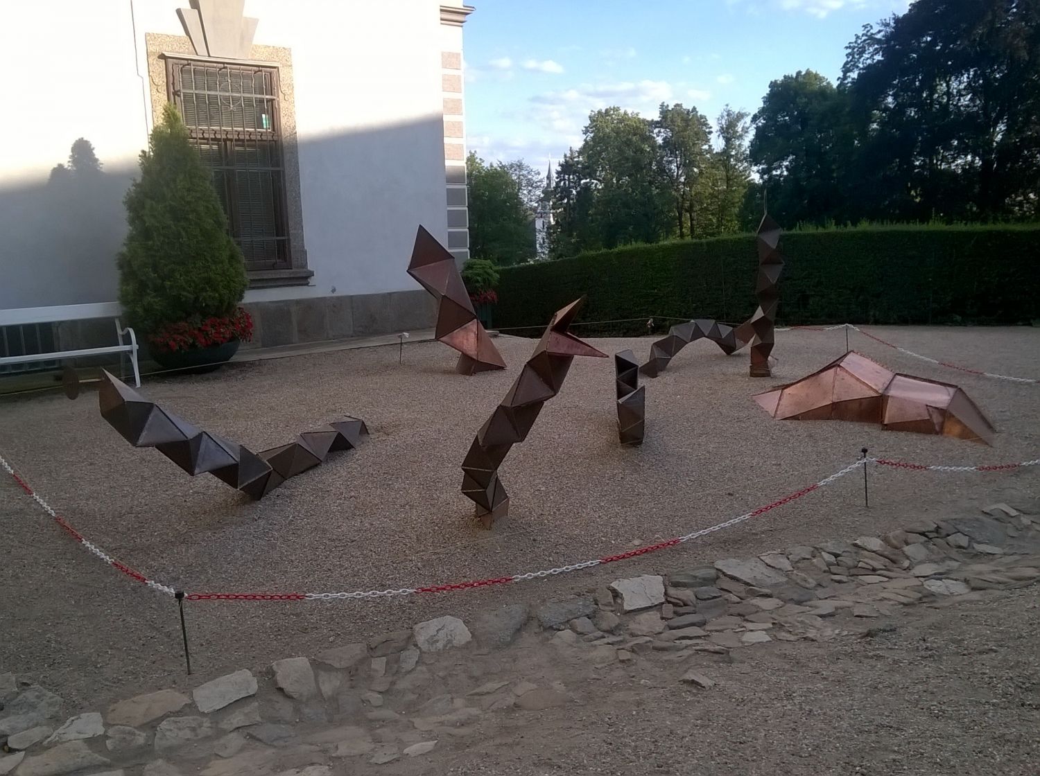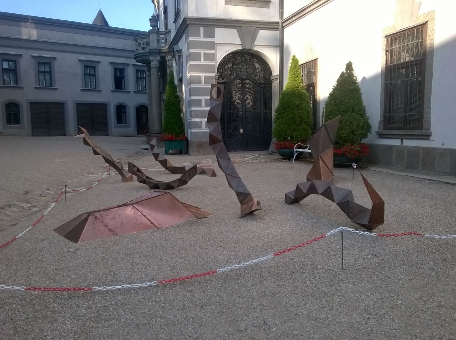 ,,Pan Härdi na mne dostal kontakt a sjednali jsme si schůzku. Chtěl využít nádvoří zámku, aby zde mohl prezentovat umění z mědi, které sám vyrábí a instaluje všude možně po světě. Potřeboval k tomu pouze měděné plechy a prostor. To vše tu bylo, tak proč to nezkusit? Původně pracoval ve Švýcarsku. To můžete vidět na sochách, která mají tmavší barvu. Ty světlé jsou vyrobené právě tady v dílně zámku. Vždy se jedná o tři trojúhelníky spojené v jeden článek. Z těchto několika článků je vždy jeden výrobek. Něco je svařené, něco přišroubované. Bohužel, někteří návštěvníci museli sochy hned zkoumat, poranili se a bylo zle. Proto je tam červeno-bílá páska, aby k sochám nikdo nesměl. ˮ