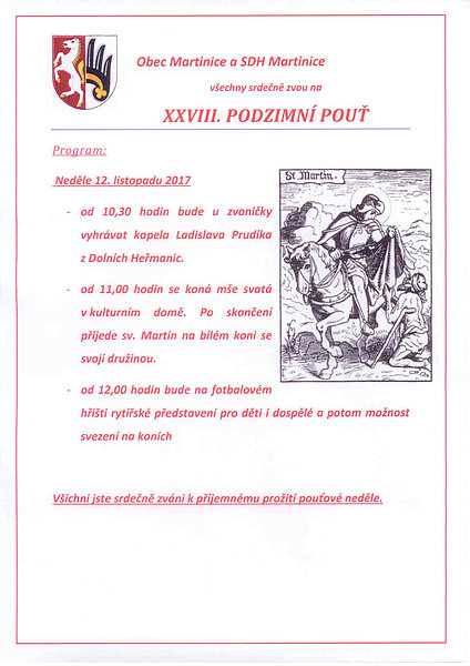 Slavit budou Martinice, které mají s Martinem společné jméno. V neděli bude od 10.30 u místní zvoničky vyhrávat kapela Ladislava Prudíka, od 11.00 se v kulturním domě uskuteční mše svatá a po jejím konci přijede sv. Martin na bílém koni se svojí družinou. Od pravého poledne pak bude na fotbalovém hřišti rytířské představení pro děti i dospělé, kteří budou mít možnost svést se na koních.