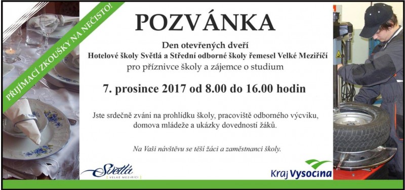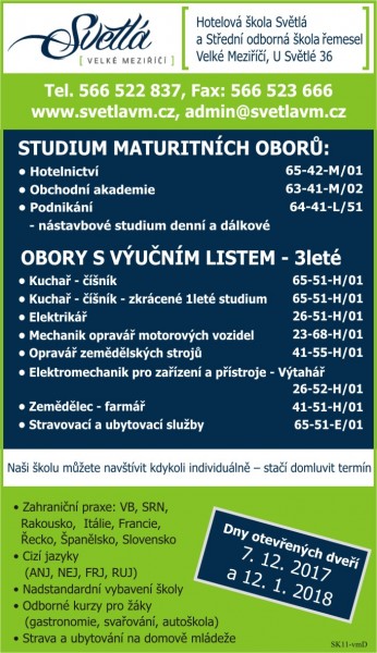 Velkomeziříčská Hotelová škola Světlá a SOŠ řemesel chystají pro veřejnost, a především pro zájemce o studium, den otevřených dveří. Ten letošní se bude konat 7. prosince a již tradičně bude spojen s adventní a vánoční tematikou.