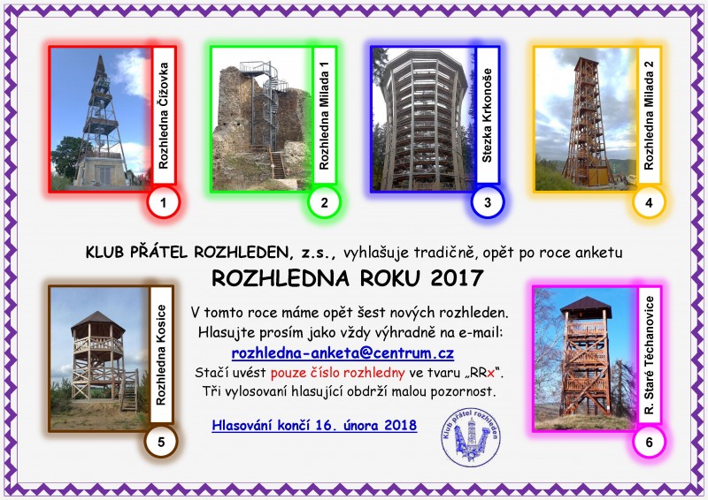 Klub přátel rozhleden také tradičně vyhlašuje, opět po roce, anketu Rozhledna roku 2017. V tomto roce máme opět šest nových rozhleden. Hlasujte prosím jako vždy výhradně na e-mail: Tato e-mailová adresa je chráněna před spamboty. Pro její zobrazení musíte mít povolen Javascript. . Stačí uvést pouze číslo rozhledny ve tvaru „RRx“. Tři vylosovaní hlasující obdrží malou pozornost. Hlasování končí 16. února 2018.
