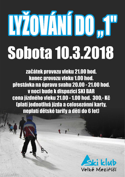 Ski klub zve zájemce na další noční lyžování, a to v sobotu 10. března. Vlek na sjezdovce Fajtova kopce bude v provozu od 21.00 do 1.00 hodin.