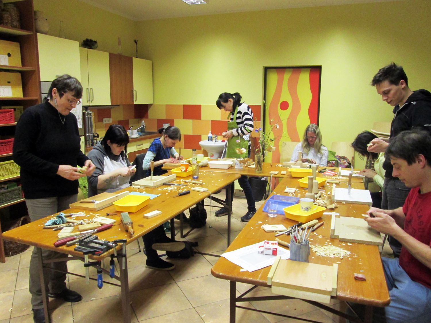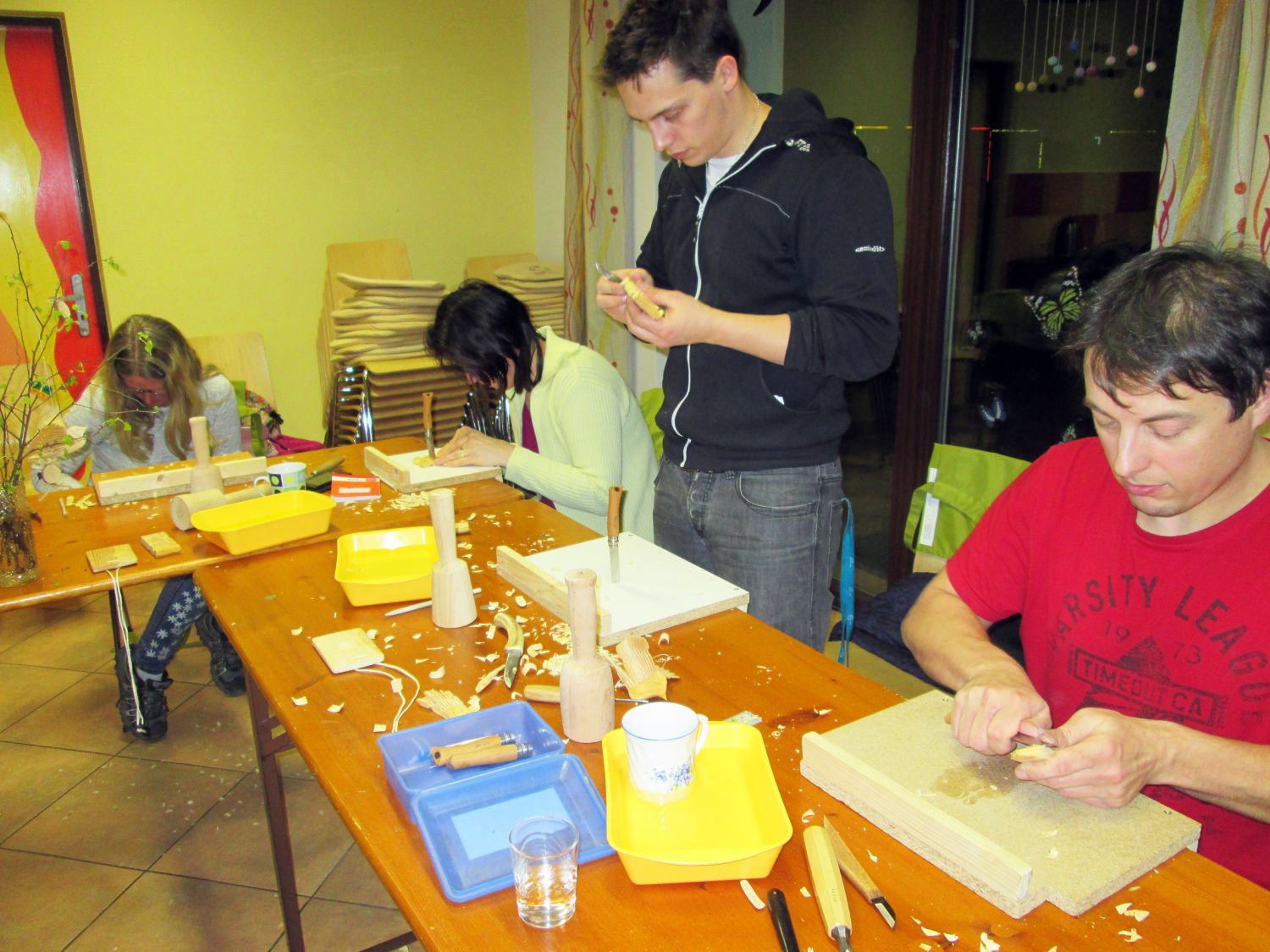 Letošní kurzy jsou určeny jak pro veřejnost, tak pro pedagogy. Na kurzu, který proběhl 15. března, se sešla parta nadšených učitelů. Protože ve svých školách podporují návrat pracovních činností a manuální zručnost dětí, sami se snaží v práci se dřevem zdokonalovat a nabyté dovednosti dál předávat svým žákům.