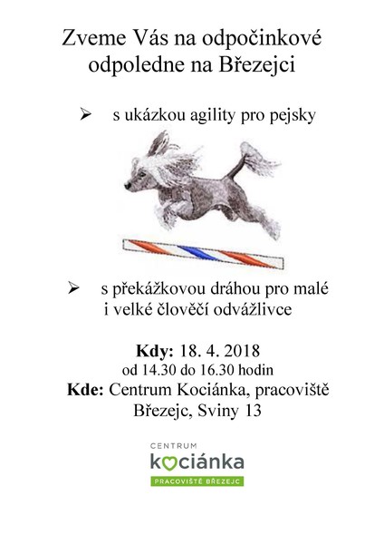 Srdečně jste zváni na odpočinkové odpoledne s ukázkou agility pro pejsky a překážkovou dráhou pro člověčí odvážlivce, které se uskuteční 18. 4. 2018 od 14.30 do 16.30.