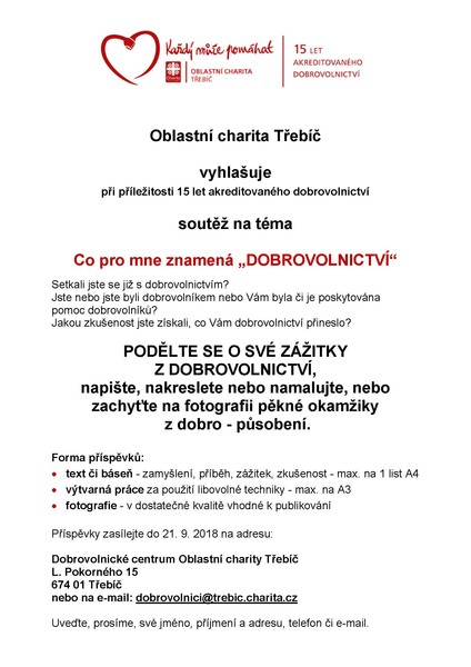 Oblastní charita Třebíč vyhlašuje při příležitosti 15 let akreditovaného dobrovolnictví soutěž na téma Co pro mne znamená „dobrovolnictví?“.