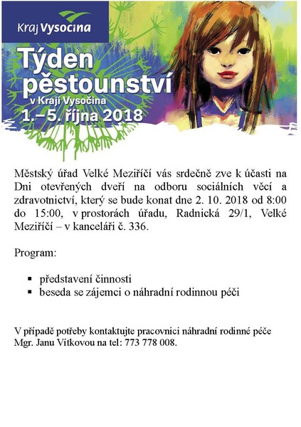 Občané města a okolí se tak mohou Týdne pěstounství zúčastnit dne 2. 10. 2018 v rámci Dne otevřených dveří na odboru sociálních věcí a zdravotnictví Městského úřadu Velké Meziříčí.