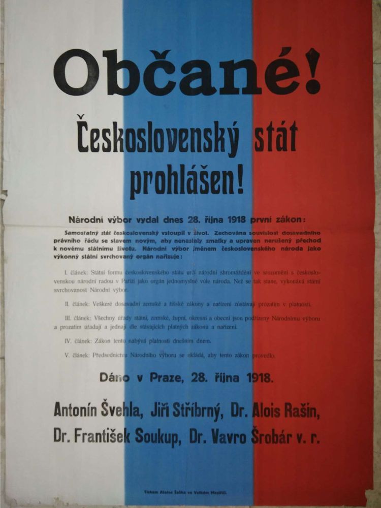 V úterý dne 29. října – asi o 10. hod. – když jsem právě od obecné školy – kde se vydávalo uhlí – ubíral se do radnice, přiběhl za mnou poštmistr Appel a odevzdal mně telegram, který ho právě došel, a který obsahoval první zákon národního výboru jakožto Nejvyšší moci státní v samostatném státě Československém: Národní výbor dle telegramu toho ujal se vlády v zemích českých a vydal přechodná ustanovení o výkonné moci státní.